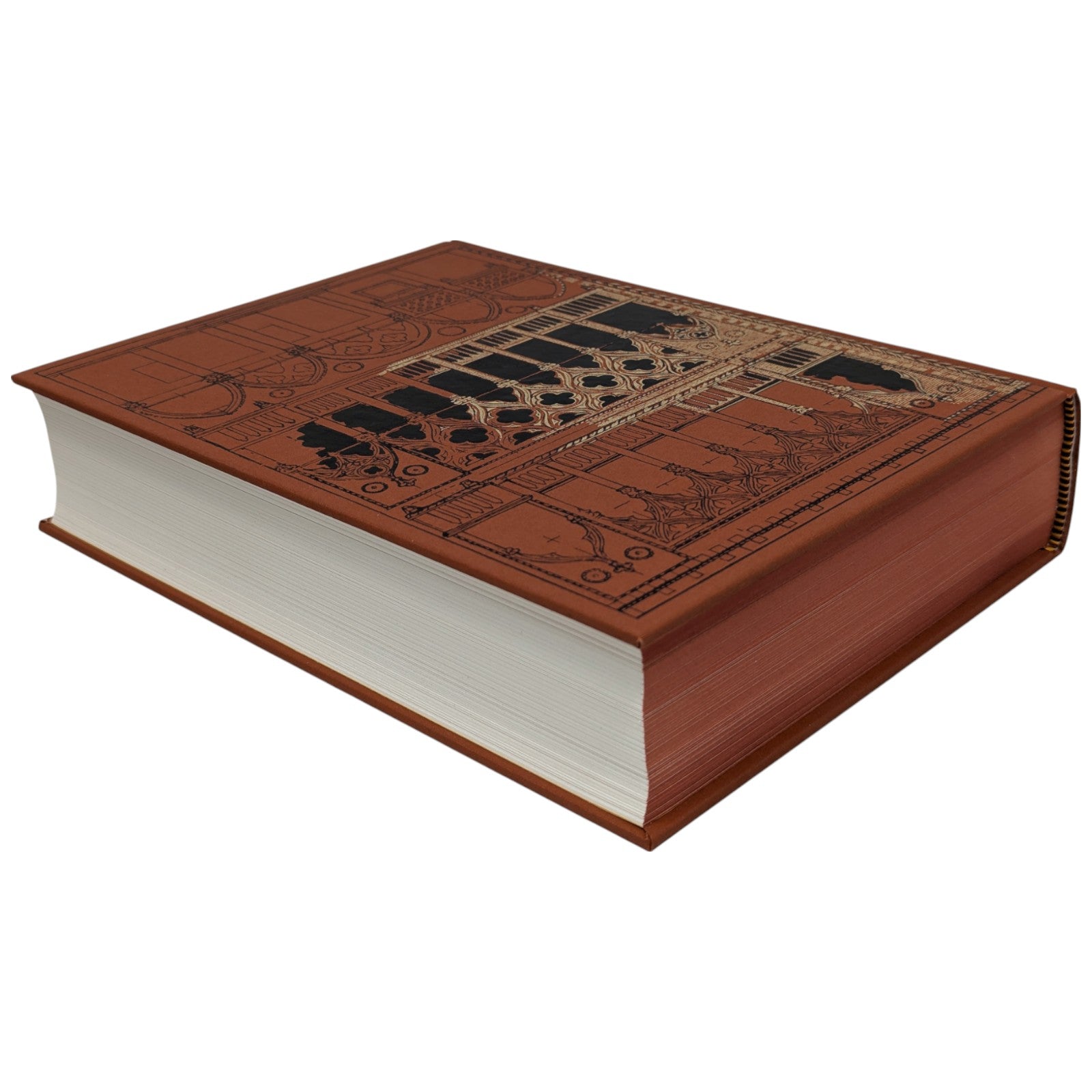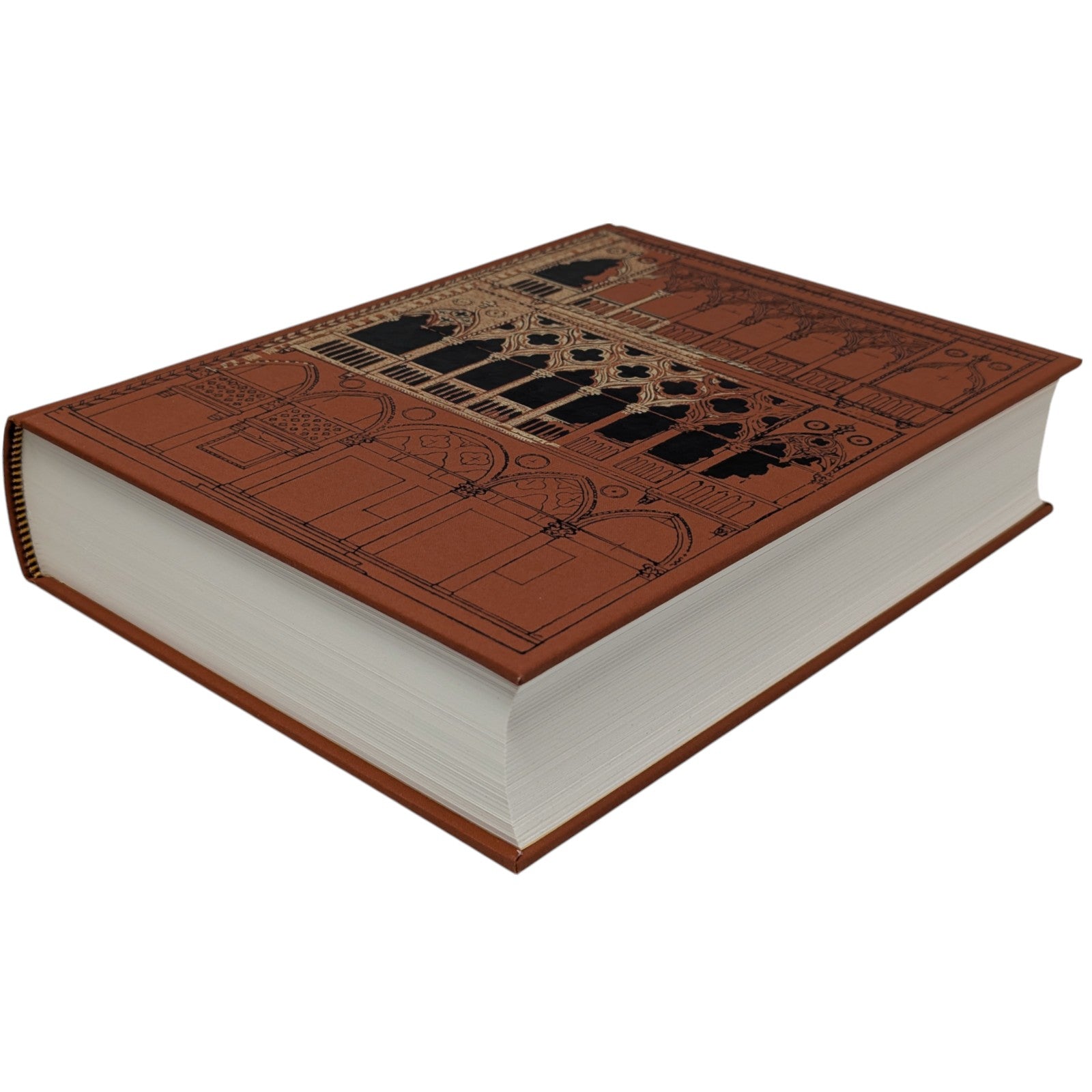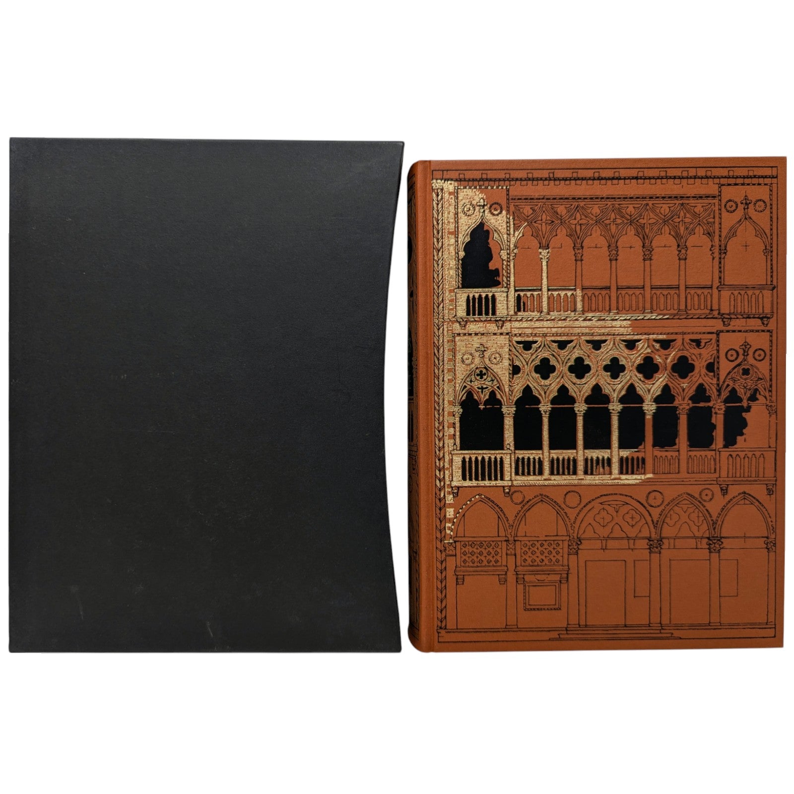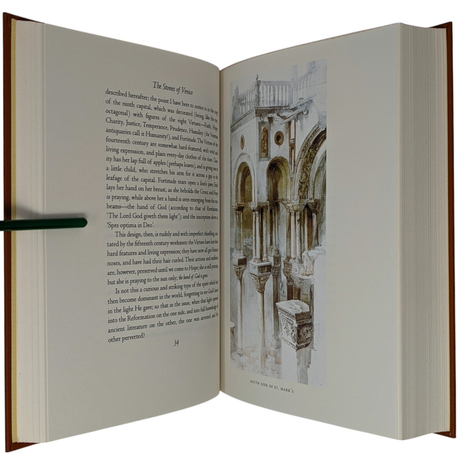 John Ruskin, The Stones of Venice. London: The Folio Society, 2001. Second printing thus, 2002. Edited & introduced by Jan Morris. 253 × 193 × 52 mm. Pp. [i–iv] v–xlvi, [1–2] 3–350: [14] leaves of colour, [16] pages of monochrome plates. Type: Centaur and Arrighi with Open Sans-Surryphs for the title. Printed by the Saint Edmundsbury Press. Bound by Hunter and Foulis in pale red-brown cloth with a design in black and gold by David Eccles; pale yellow endleaves. Black slip case.