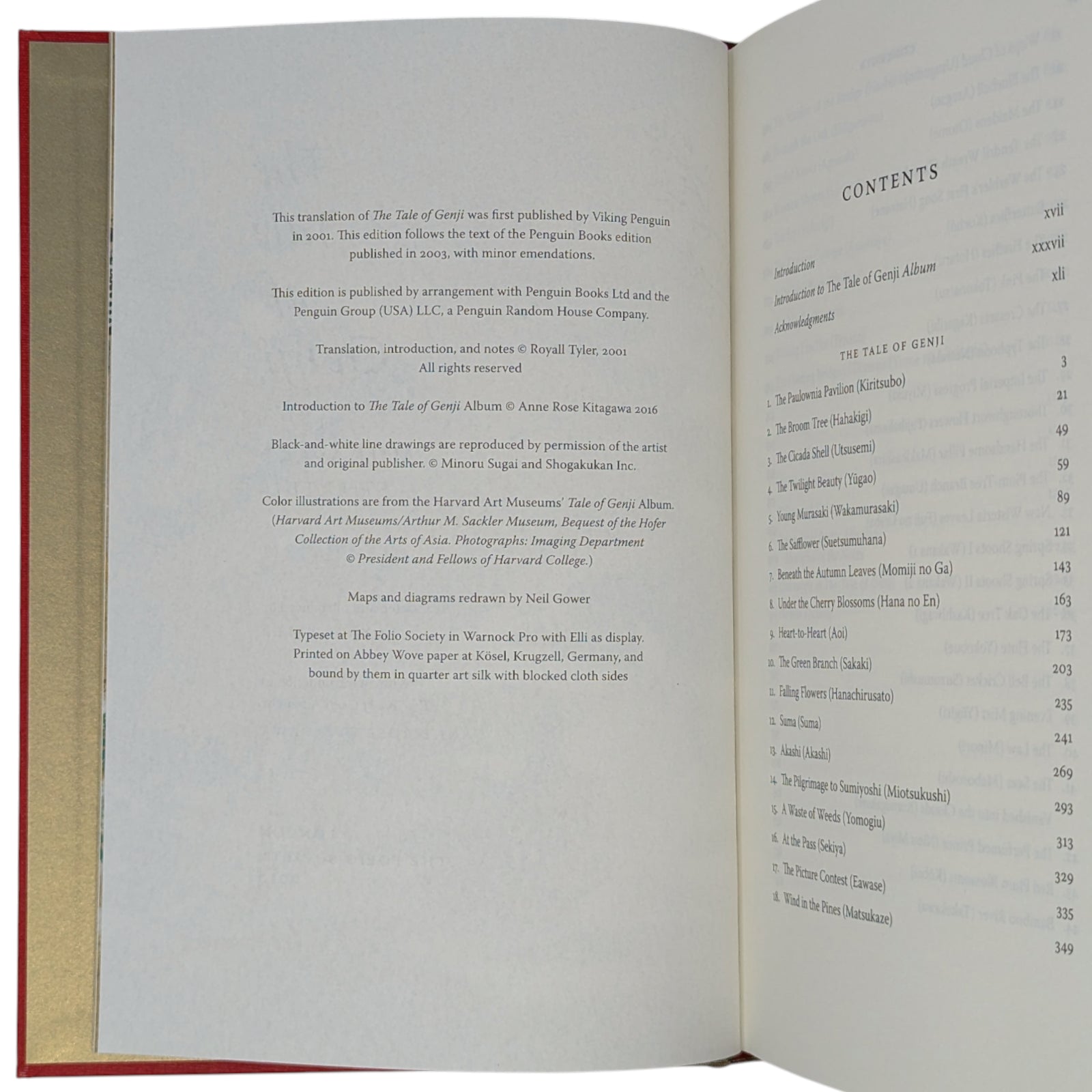 [1] . . . [ornament] translated and introduced by Royall Tyler, with an introduction to The tale of Genji album by Anne Rose Kitagawa. Pp. [i–v] vi–xl [xli–xlii], [1–5] 6–605 [606]: [33] leaves of colour plates.