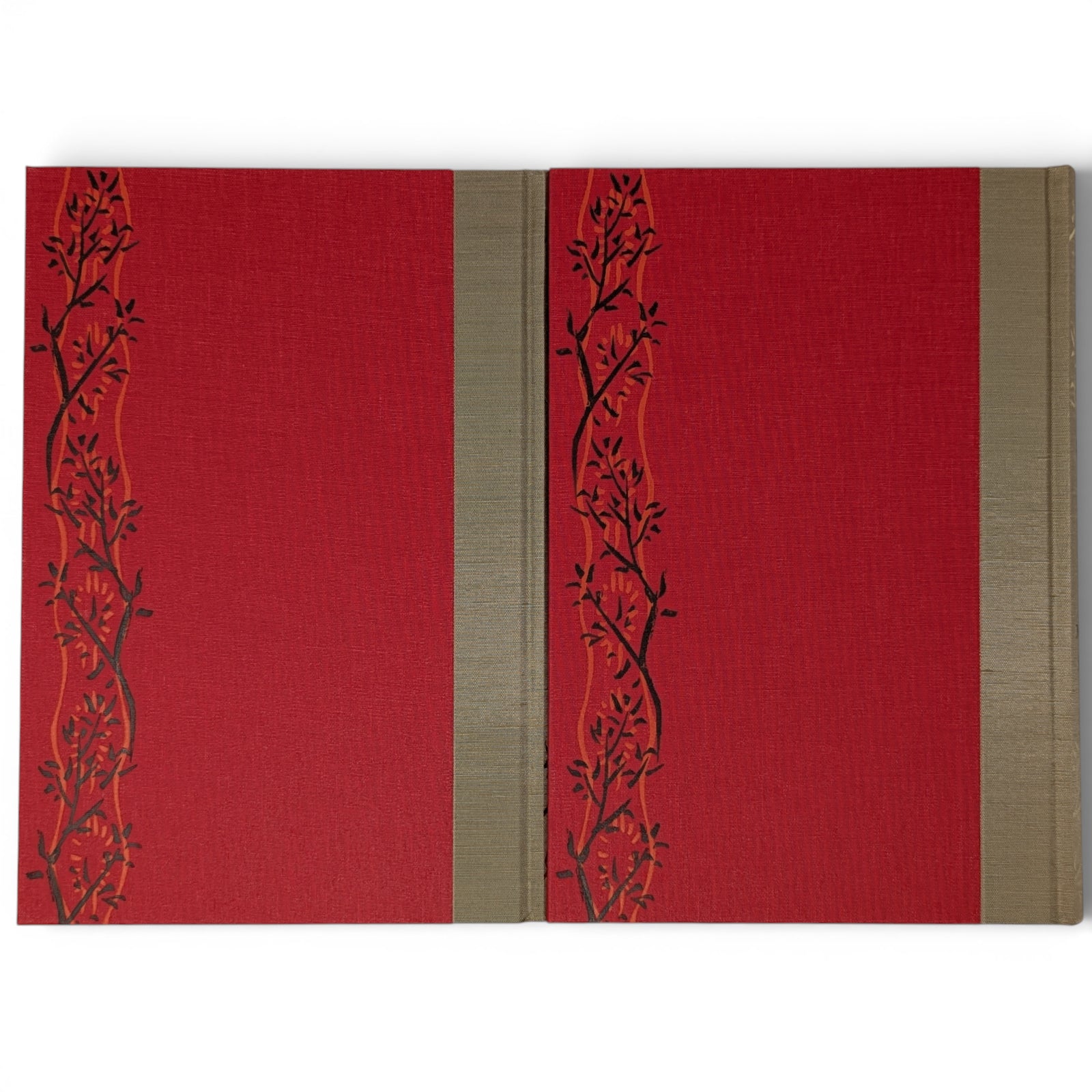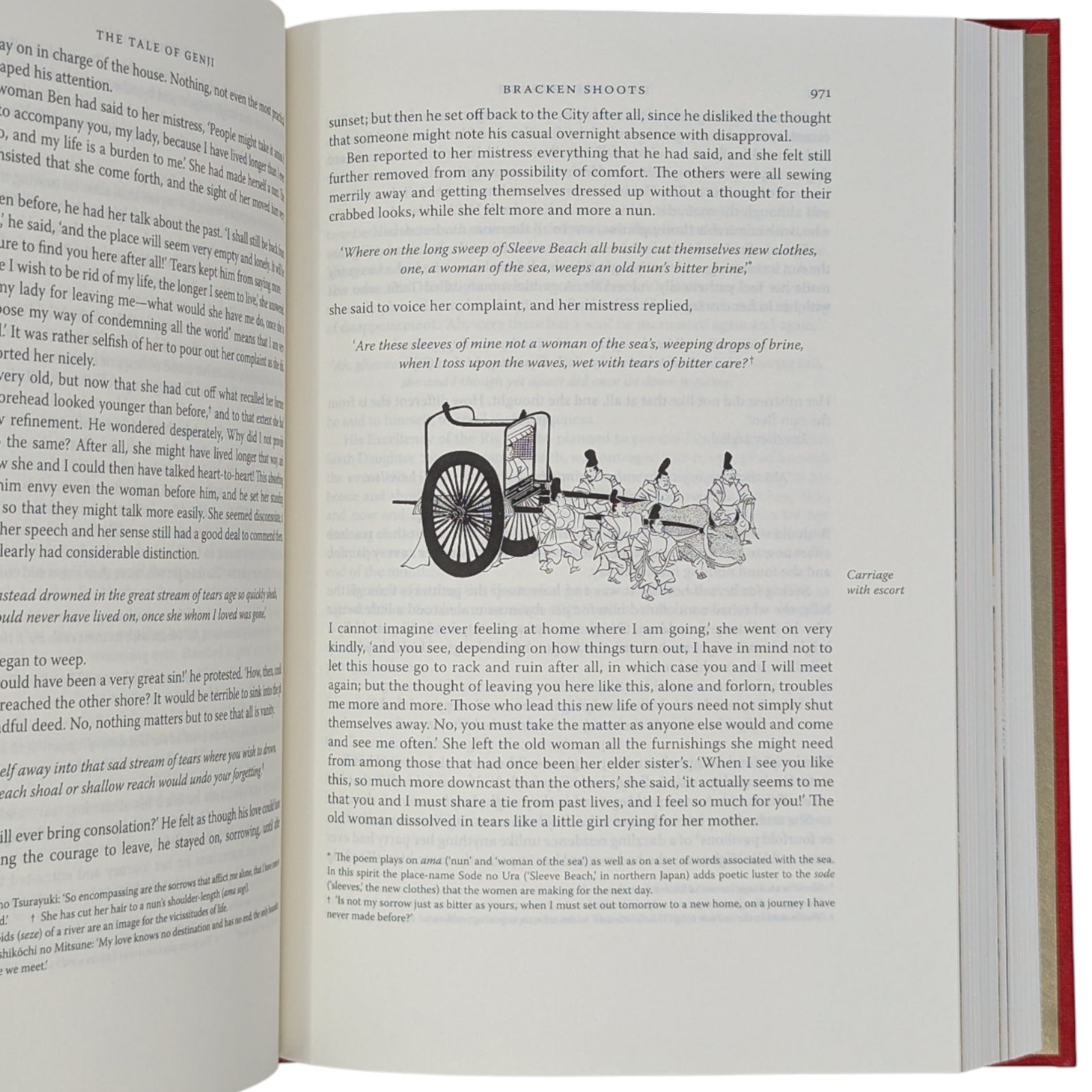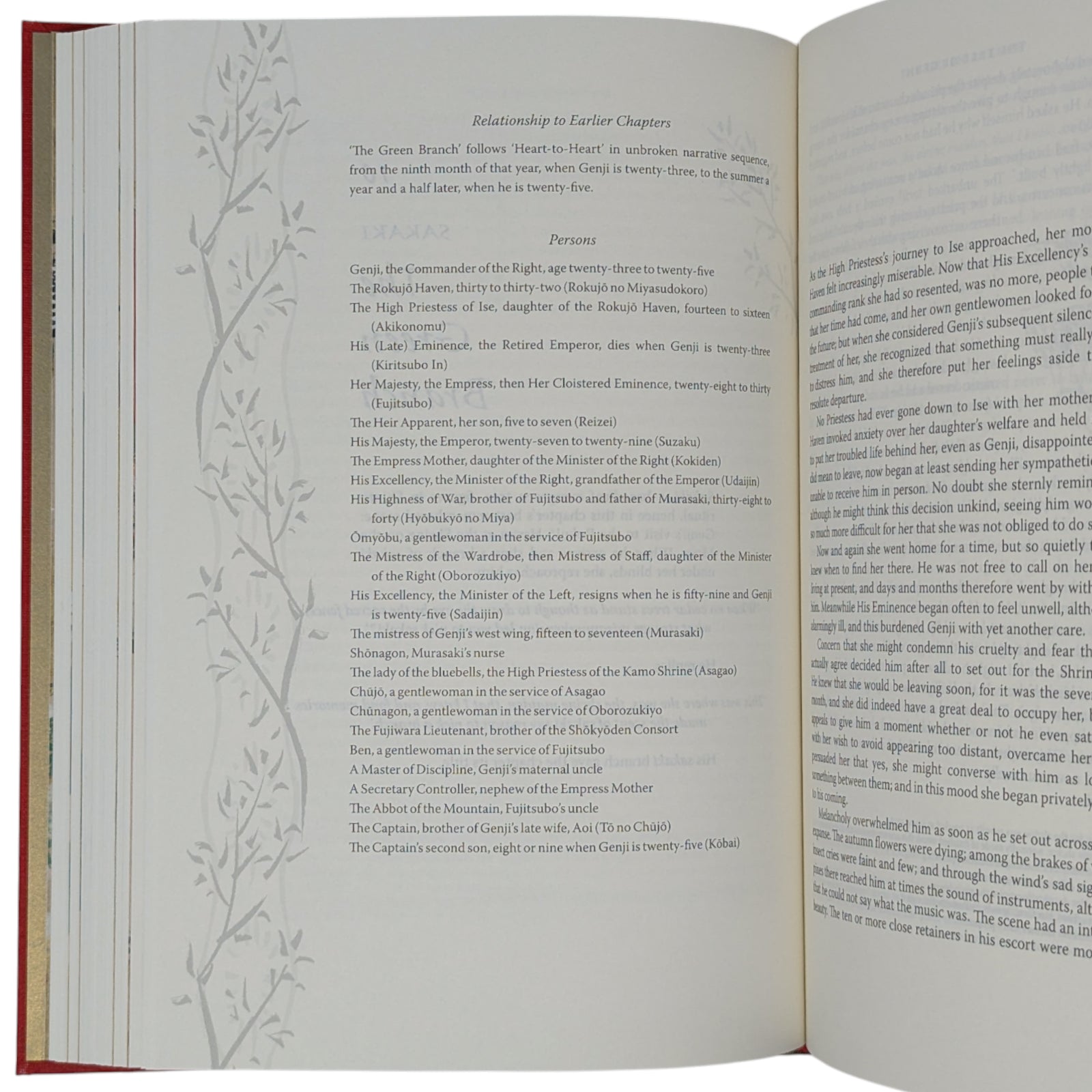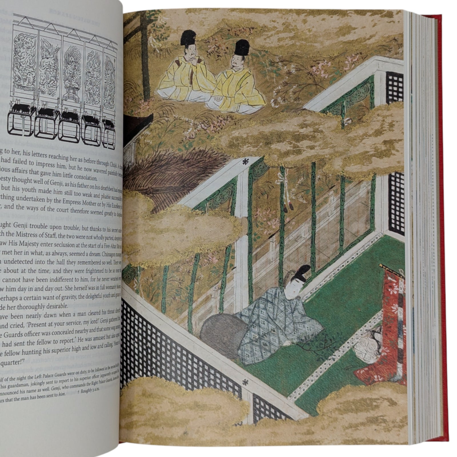Translated and introduced by Royall Tyler. Illustrations by Tosa Mitsunobu and Minoru Sugai. 252 × 177 × 47–48 mm. 2 vols (see below). Type: Warnock Pro with Elli for display. Printed and bound by Kösel in full red and gold cloth blocked in gold, black and orange; gold end leaves. Dark brown two-volume slip case blocked in dark orange on one side. Originally written in the eleventh century, the colour illustrations come from the earliest complete depiction of what is widely regarded as the world’s first novel. The album, now held by Harvard Art Museums, dates from the early sixteenth century. In addition to the plates, copious black and white illustrations by Minoru Sugai from the original Japanese edition are in the text. The two volumes are as follows: