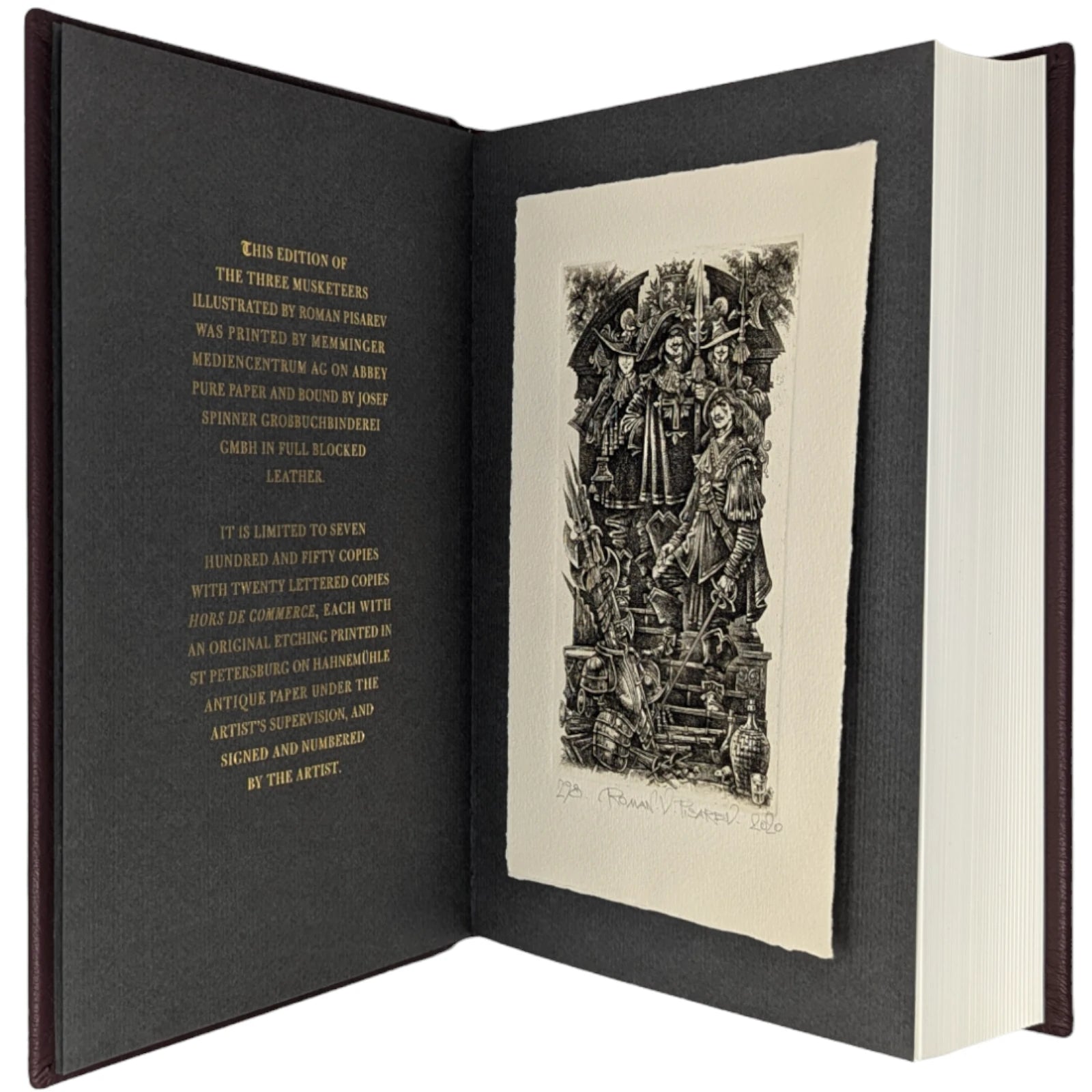 Introduced by George MacDonald Fraser, illustrated by Roman Pisarev. 252 × 180 × 51 mm. Pp. [1–2], [i–iv] v–xviii, 1–568 [569–574]: [11] leaves of plates. Based on Folio’s first edition (item 1067). Now printed by Memminger MedienCentrum and bound by Josef Spinner in full dark red leather with a new design blocked in gold and black. Gilded top edge; dark grey endleaves. Dark red slip case. A limitation spread containing a tipped-in etching signed and numbered by Pisarev is sewn into the front. Edition statement reads in part ‘limited to seven hundred and fifty copies with twenty lettered copies hors de commerce’.
