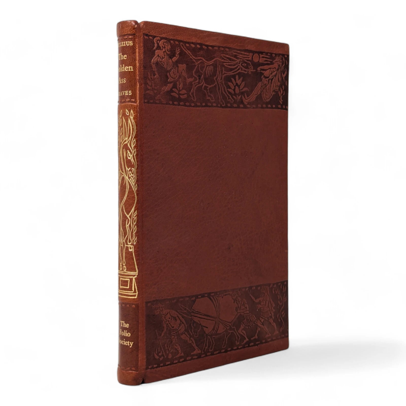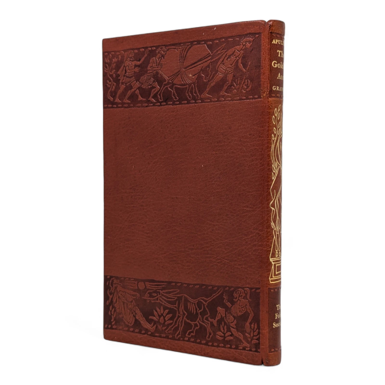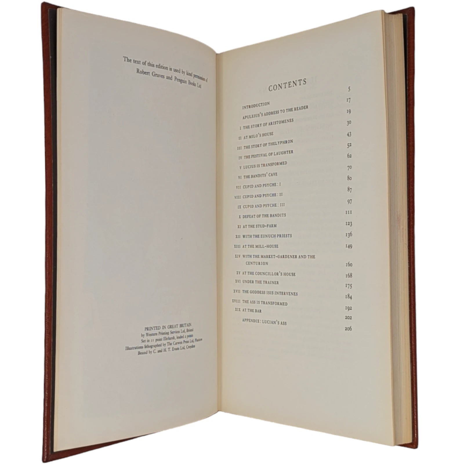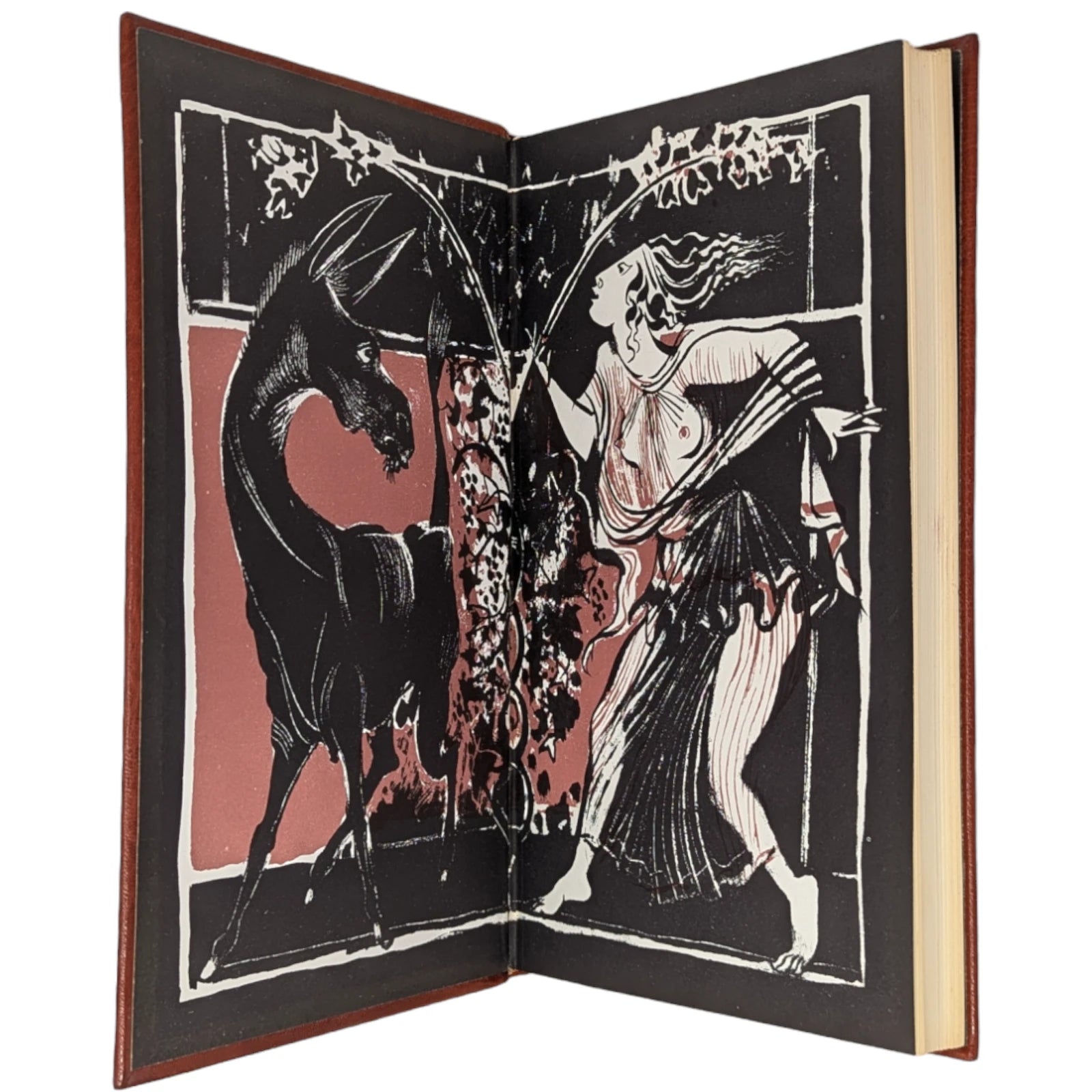 Translated by Robert Graves, lithographs by Michael Ayrton. 254 × 158 × 22 mm. Pp. [1–4] 5–208: [9] leaves of two-colour plates (facing pp. [1], 49, 64, 76, 97, 112, 141, 180 and 195). Type: Ehrhardt with Columna for display. Printed by Western Printing Services, the lithographs by the Curwen Press. Bound by Evans of Croydon in full brown morocco leather with decoration blind embossed to covers, blind-embossed labels, gilt lettering and decoration to spine; endleaves with a design in black and brown by Ayrton. Not issued with a slipcase.