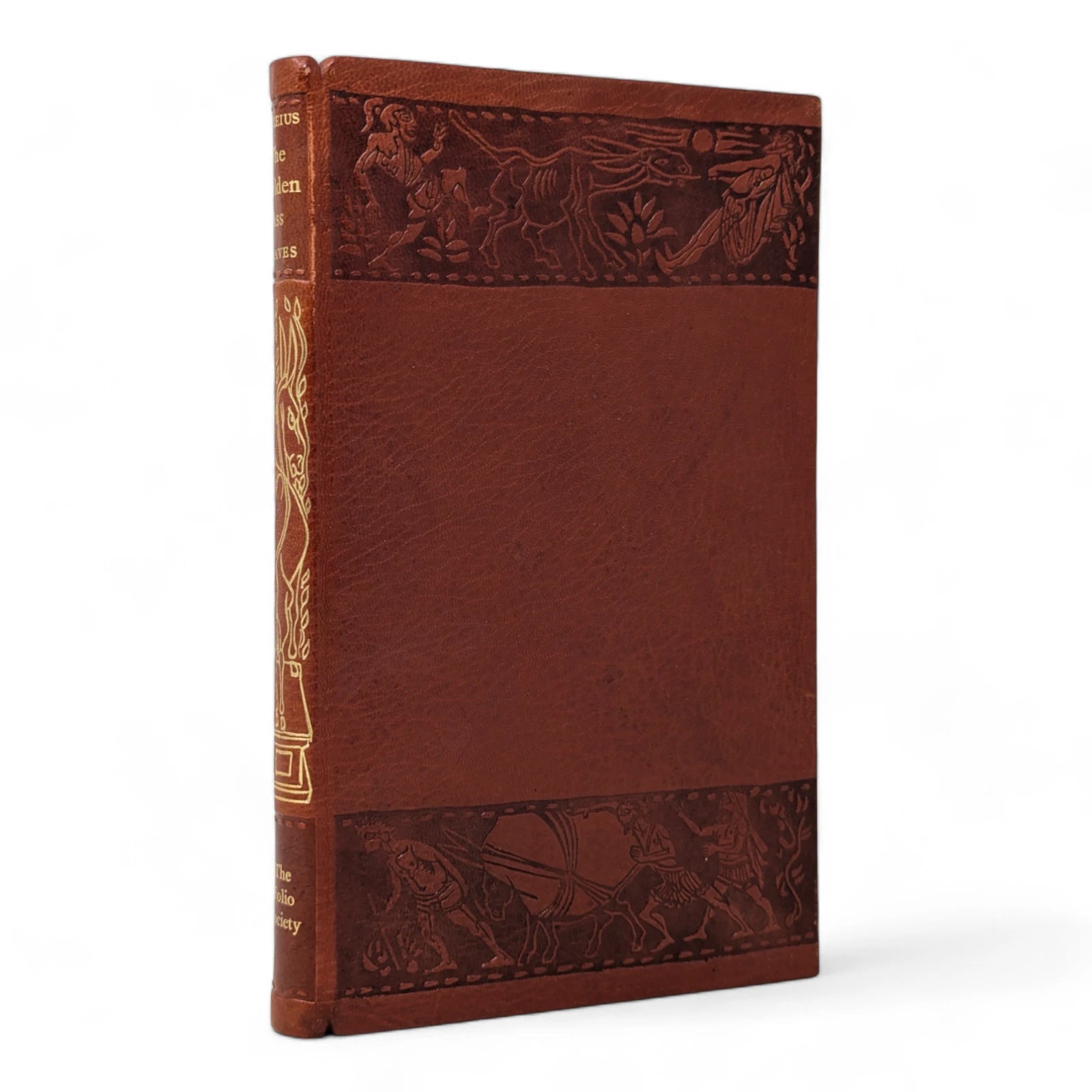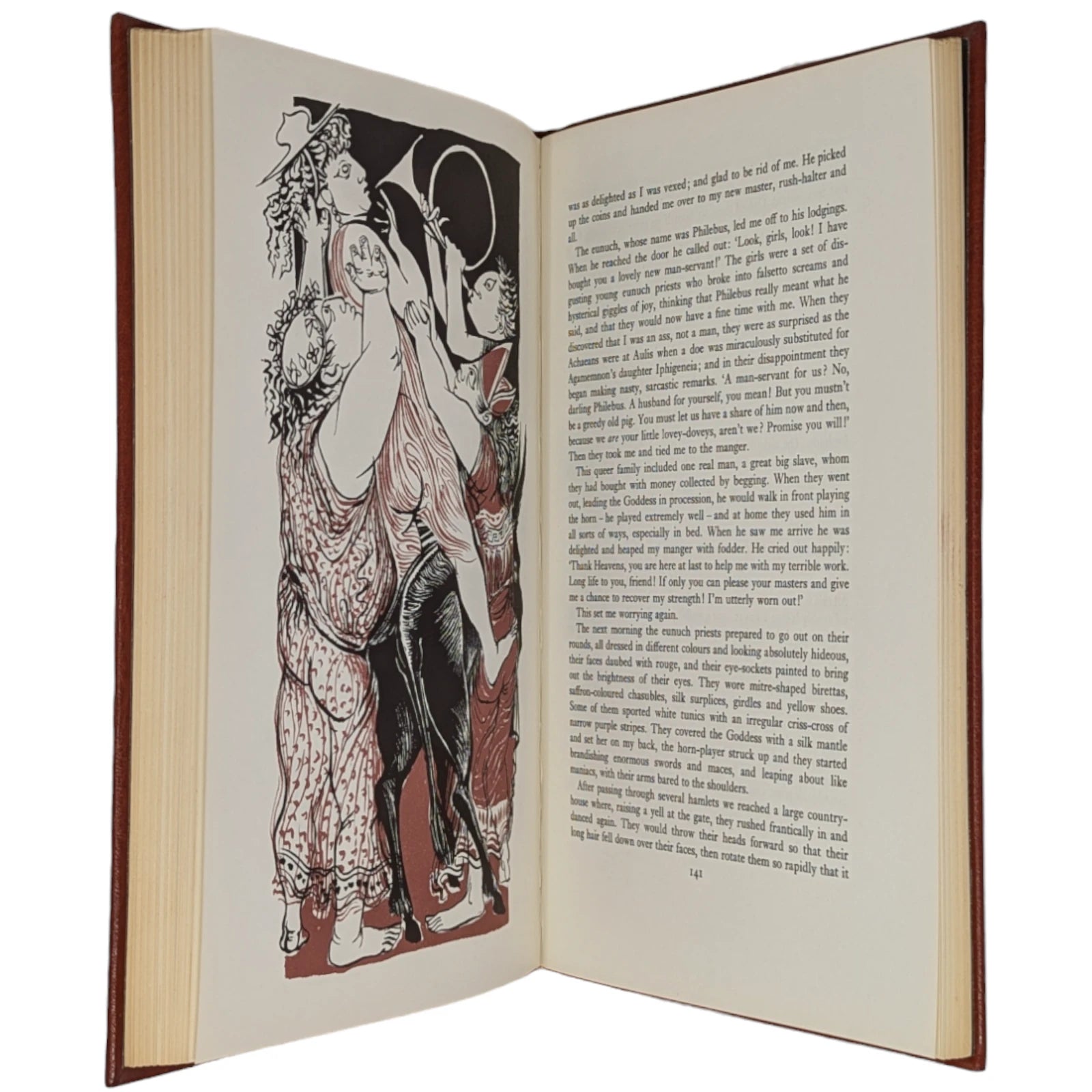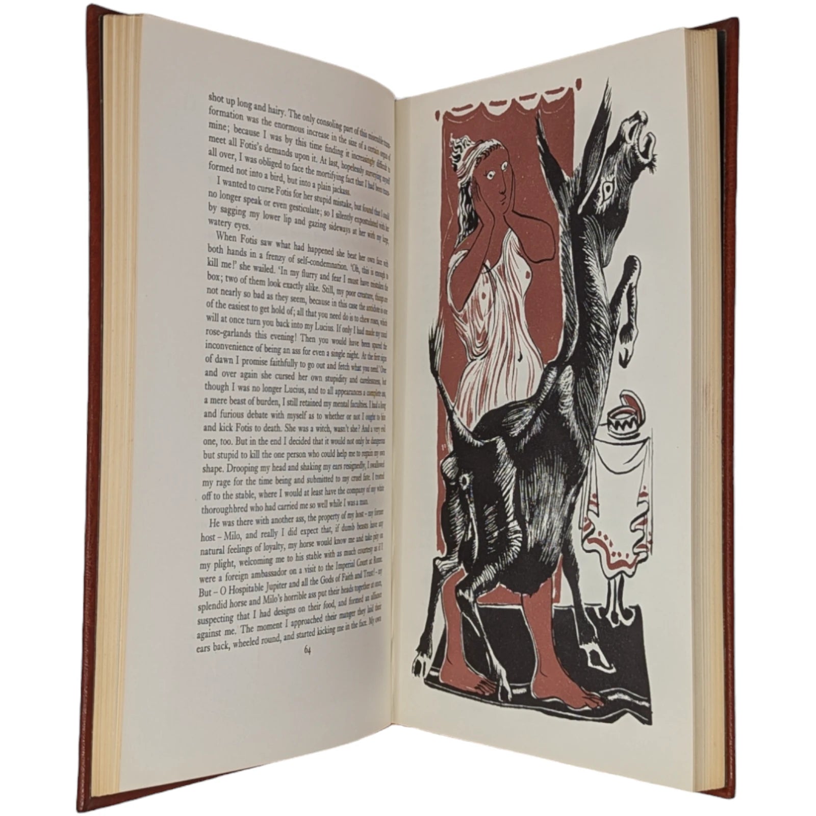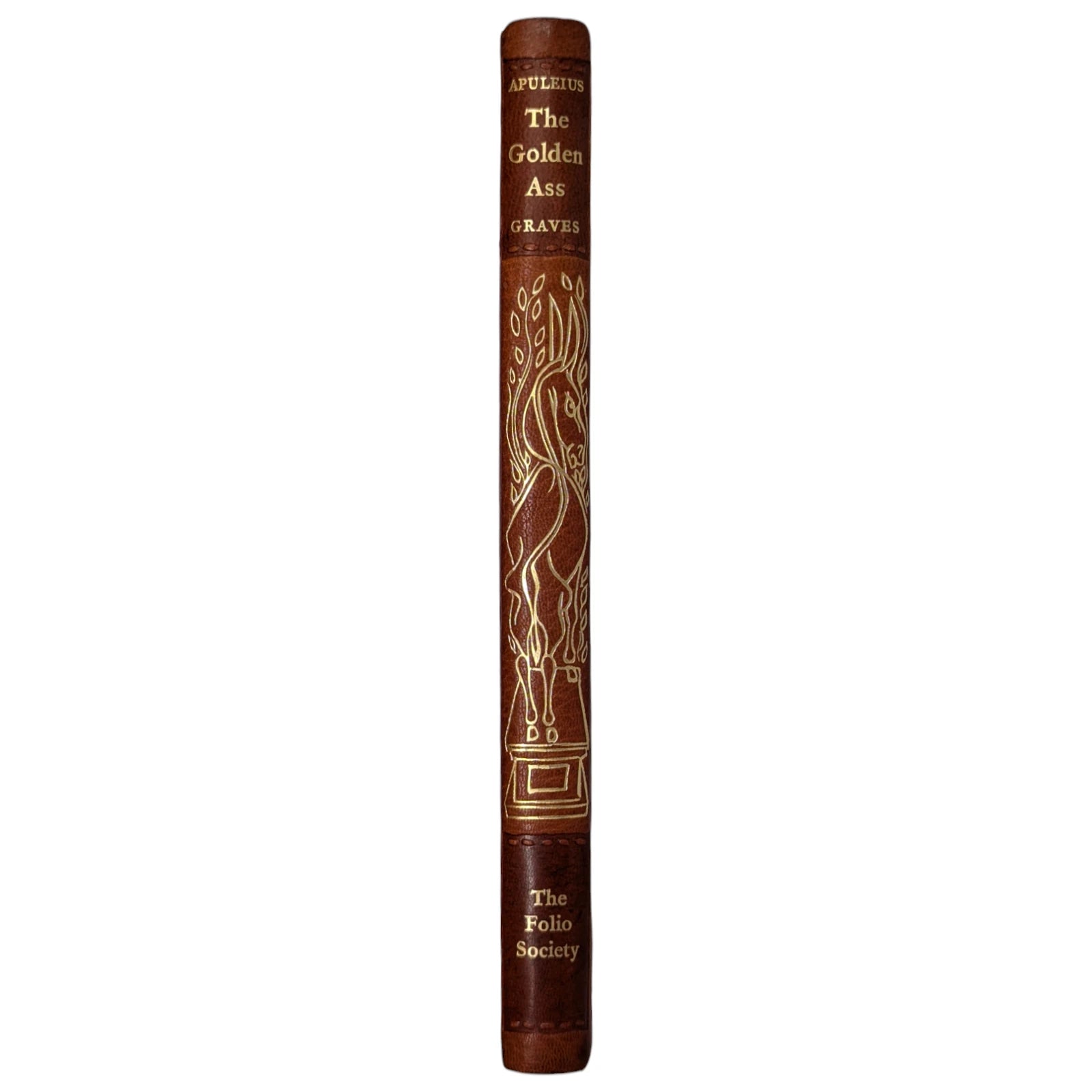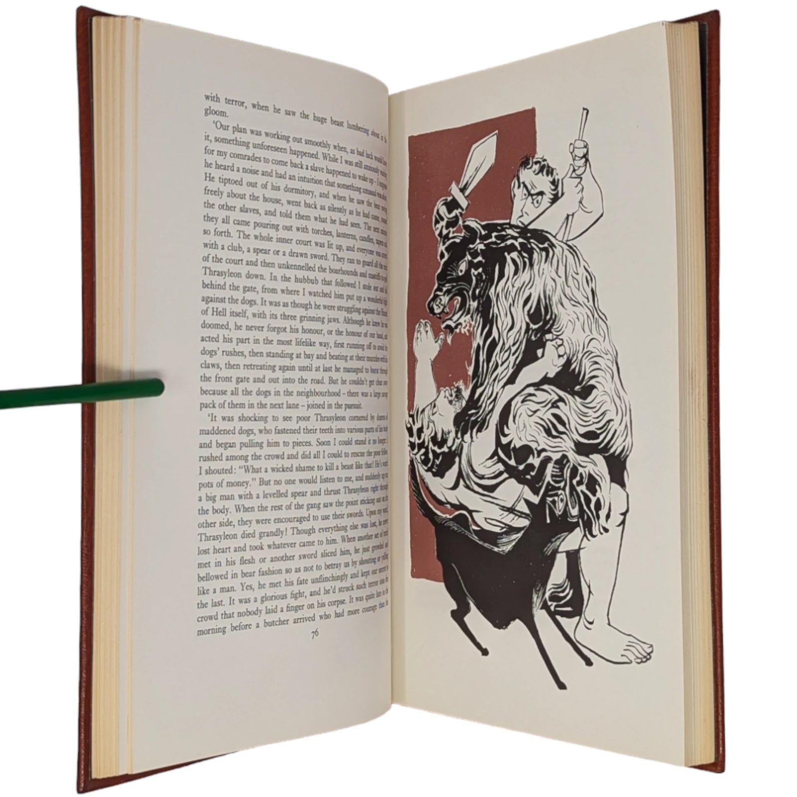 Translated by Robert Graves, lithographs by Michael Ayrton. 254 × 158 × 22 mm. Pp. [1–4] 5–208: [9] leaves of two-colour plates (facing pp. [1], 49, 64, 76, 97, 112, 141, 180 and 195). Type: Ehrhardt with Columna for display. Printed by Western Printing Services, the lithographs by the Curwen Press. Bound by Evans of Croydon in full brown morocco leather with decoration blind embossed to covers, blind-embossed labels, gilt lettering and decoration to spine; endleaves with a design in black and brown by Ayrton. Not issued with a slipcase.