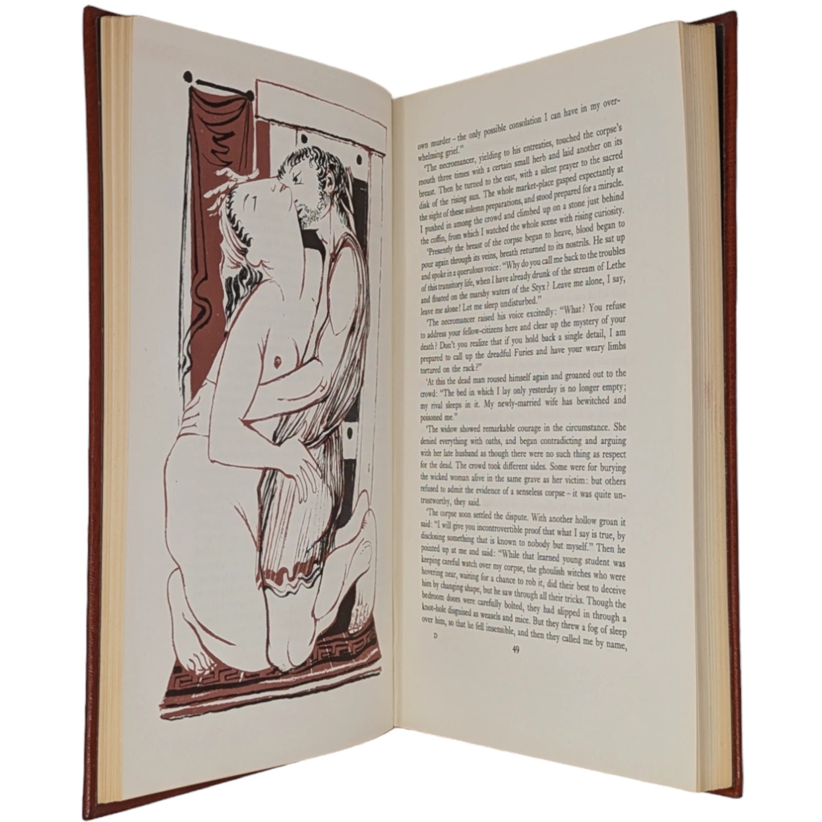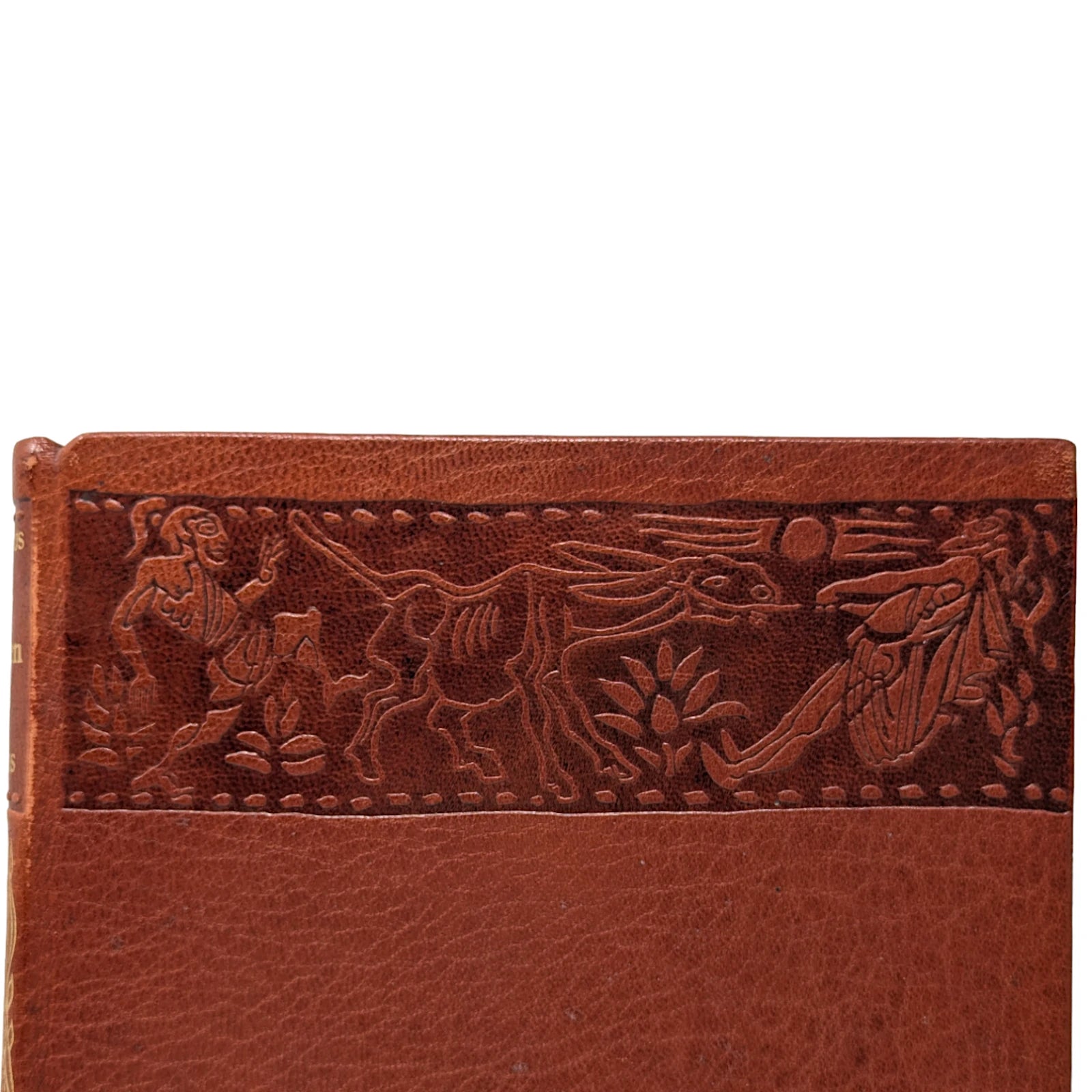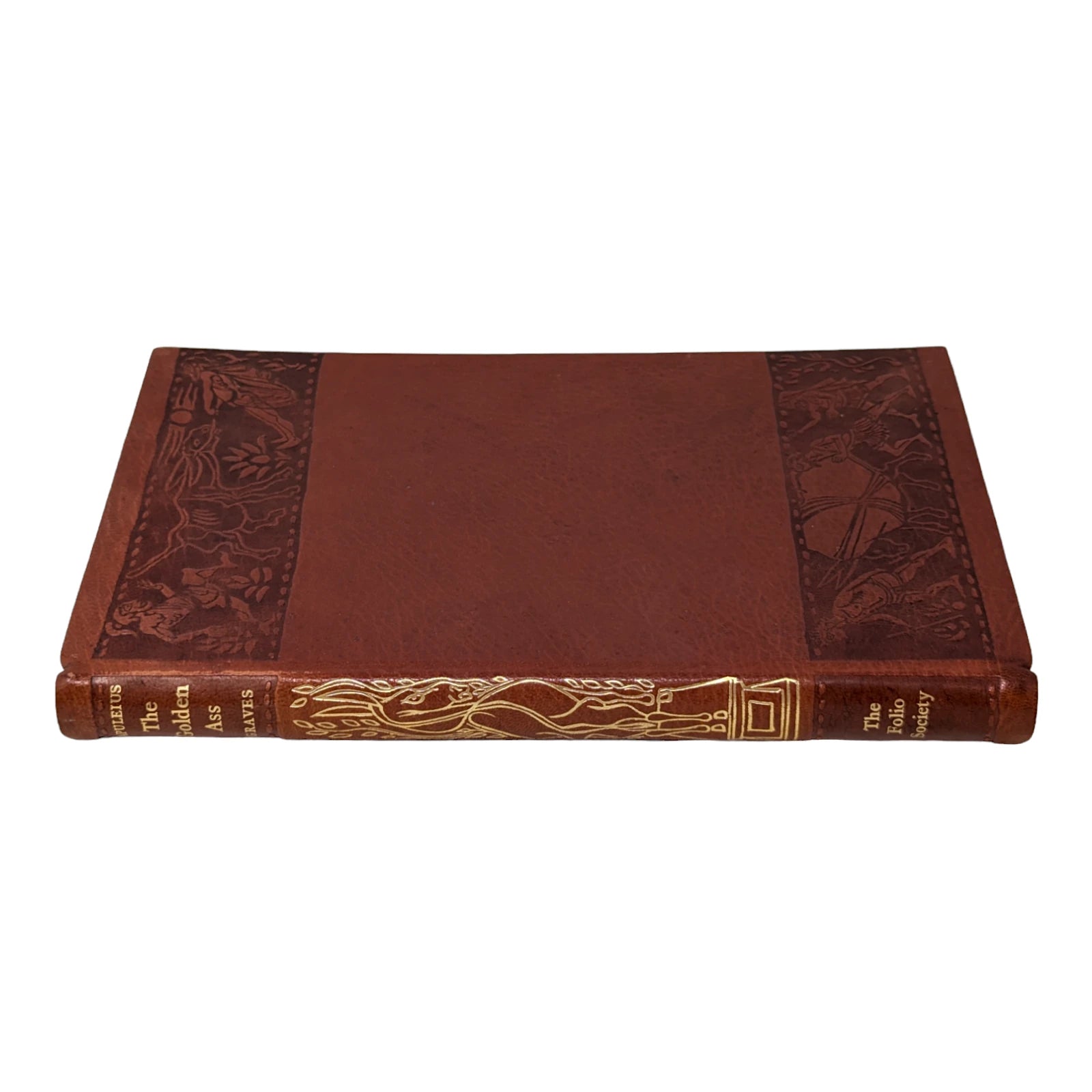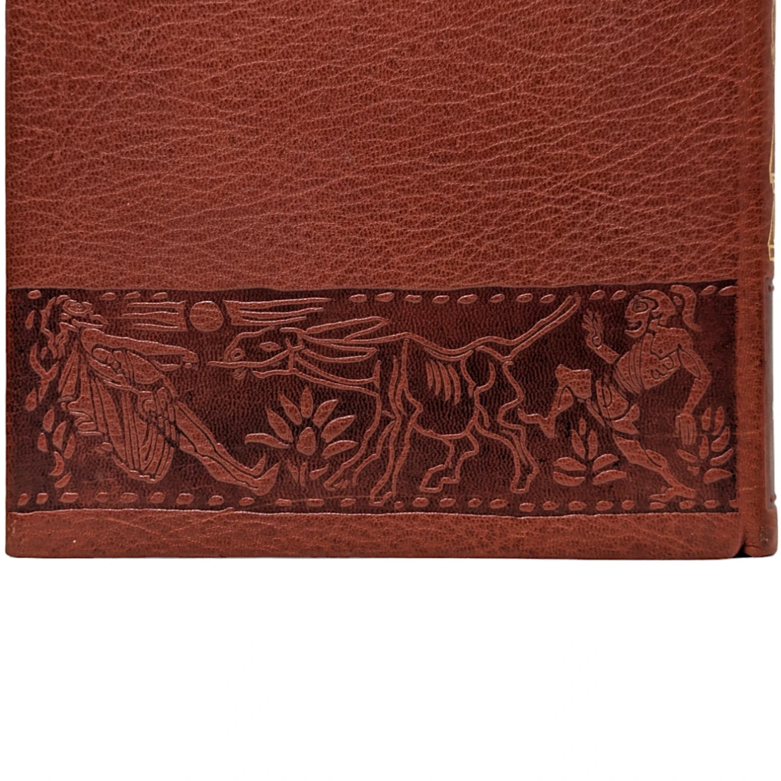 Translated by Robert Graves, lithographs by Michael Ayrton. 254 × 158 × 22 mm. Pp. [1–4] 5–208: [9] leaves of two-colour plates (facing pp. [1], 49, 64, 76, 97, 112, 141, 180 and 195). Type: Ehrhardt with Columna for display. Printed by Western Printing Services, the lithographs by the Curwen Press. Bound by Evans of Croydon in full brown morocco leather with decoration blind embossed to covers, blind-embossed labels, gilt lettering and decoration to spine; endleaves with a design in black and brown by Ayrton. Not issued with a slipcase.