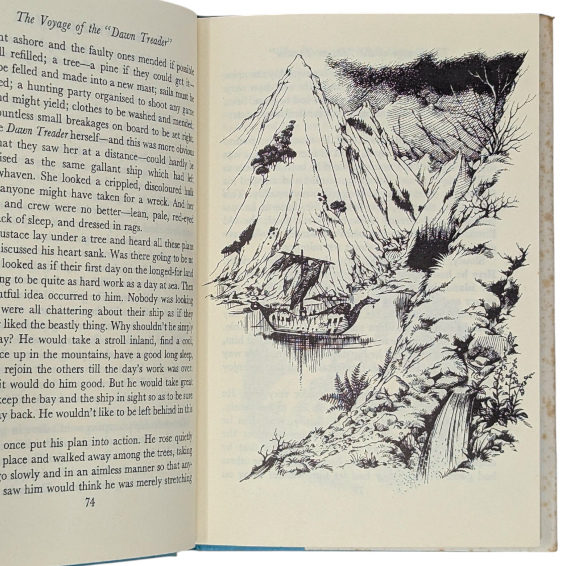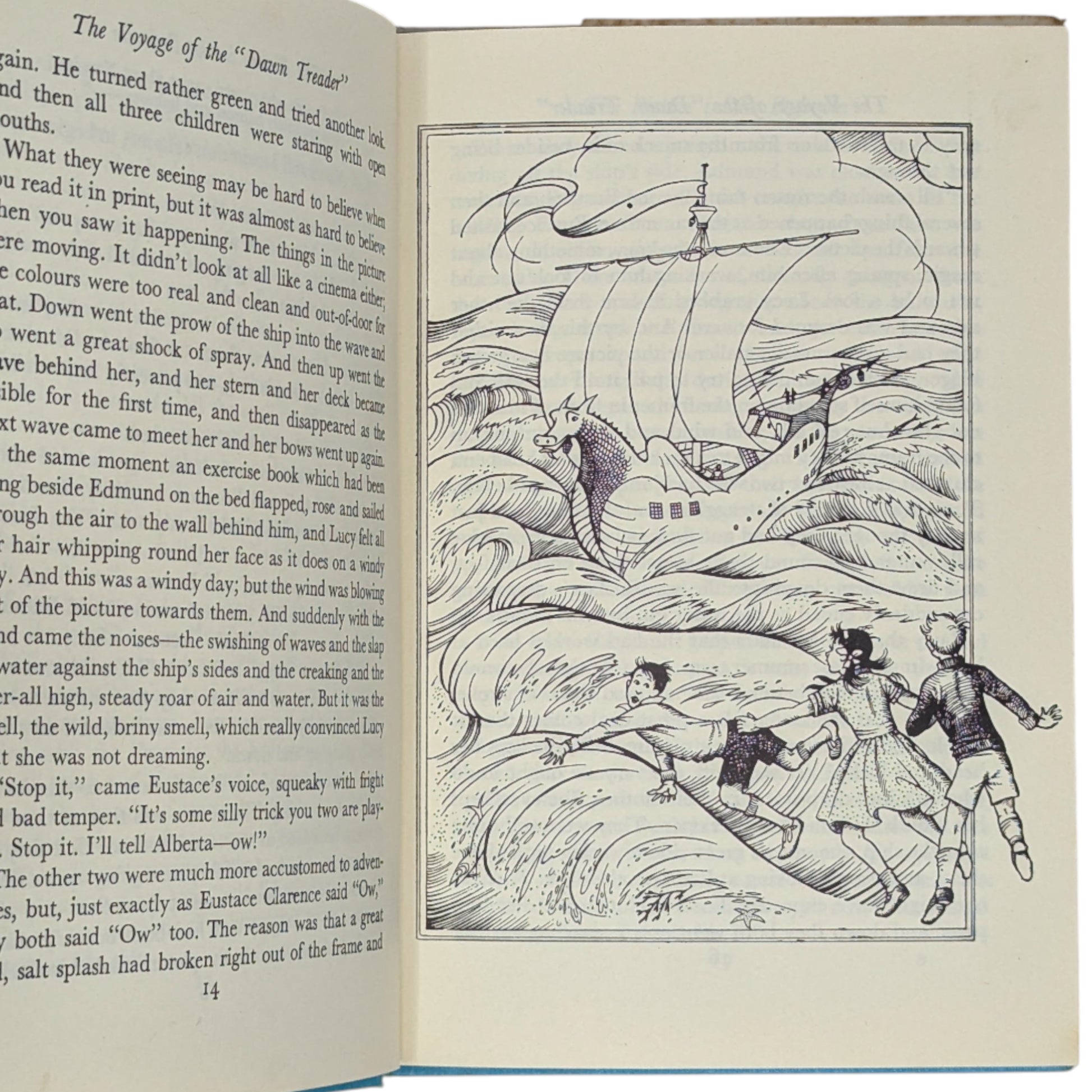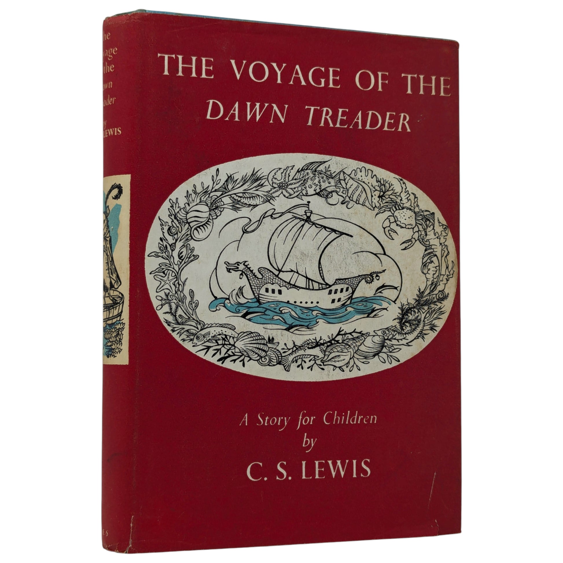 LEWIS, C. S. The Voyage of the Dawn Trader. London: Geoffrey Bles, 1952. First edition, seventh printing 1969. Chronologically, the third book in the Chronicles of Narnia series and volume five in recent editions sequenced in chronological order to Narnian history. Publisher's light blue cloth binding, silver lettering to spine, map endpapers to front; in original, price-clipped dust wrapper. Illustrated throughout in black and white by Pauline Baynes.