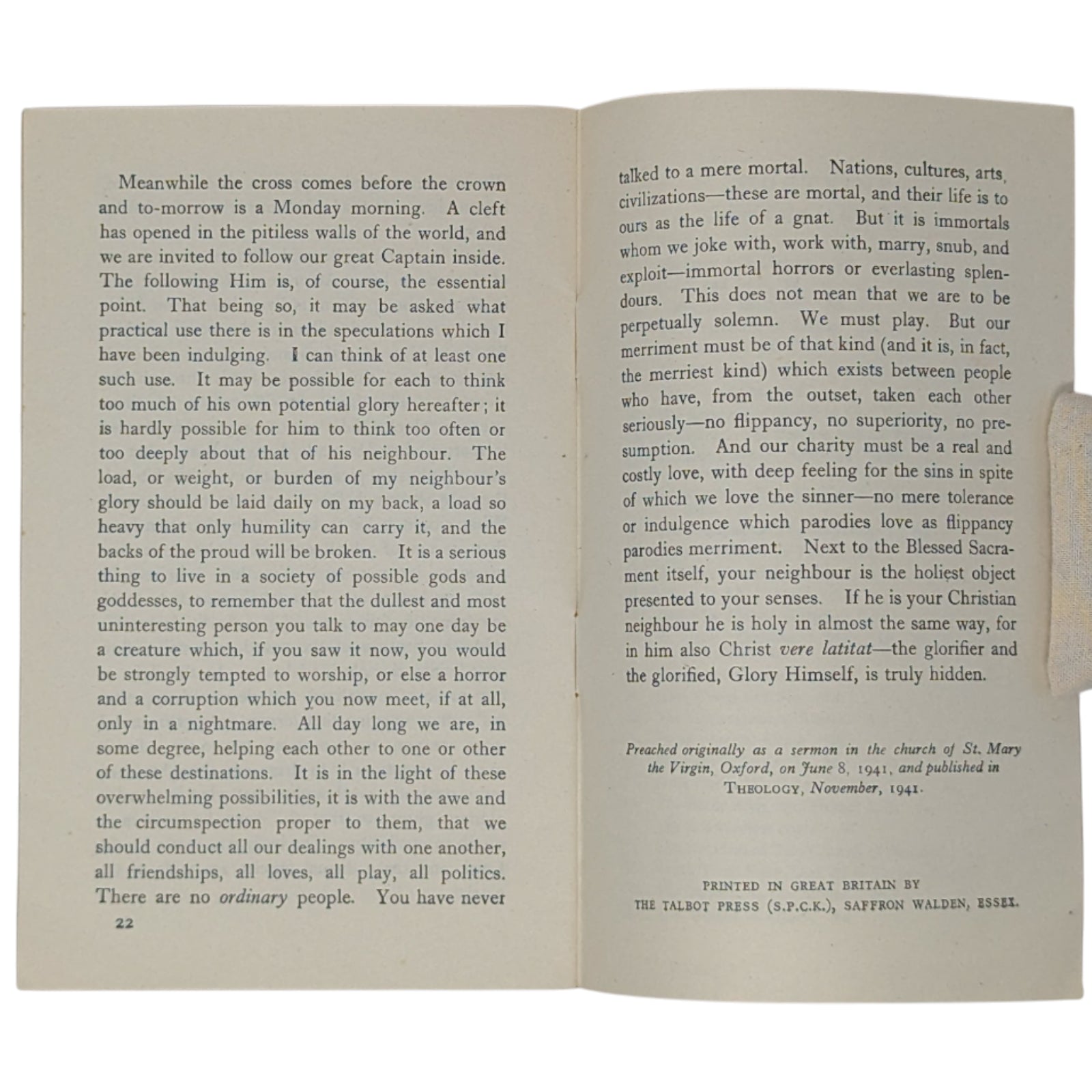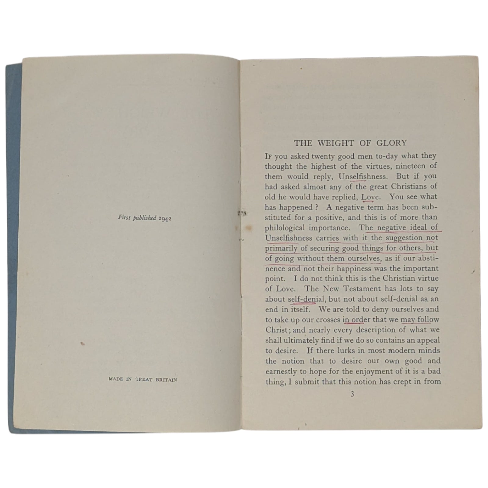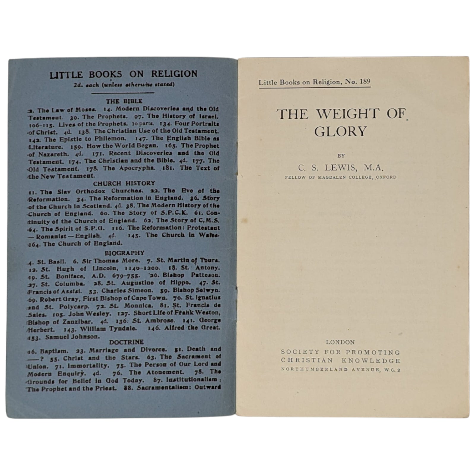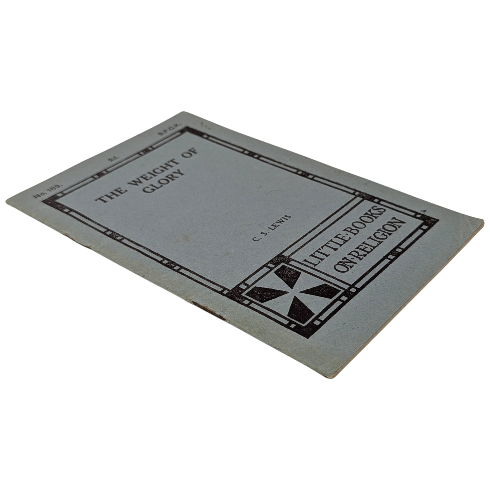 LEWIS, C.S. The Weight of Glory. Little Books on Religion, No. 189. London: Society for Promoting Christian Knowledge (SPCK), 1942. 16.6 x 10.6, 22 numbered pages, advertisements at front and rear. Printed by Billing and Sons. Publisher's original blue-gray wraps, with price of 2d. to front cover. Stated first published 1942 on the copyright page. Condition-wise, there is creasing and a little wear to extremities, small inscription in pencil to title page, a little rust around the staples within, mild foxing to extremities, and previous owner's highlights and a small annotation in red pen to the first six pages; else a clean and legible copy - if a little fragile - with none of the pages loose.