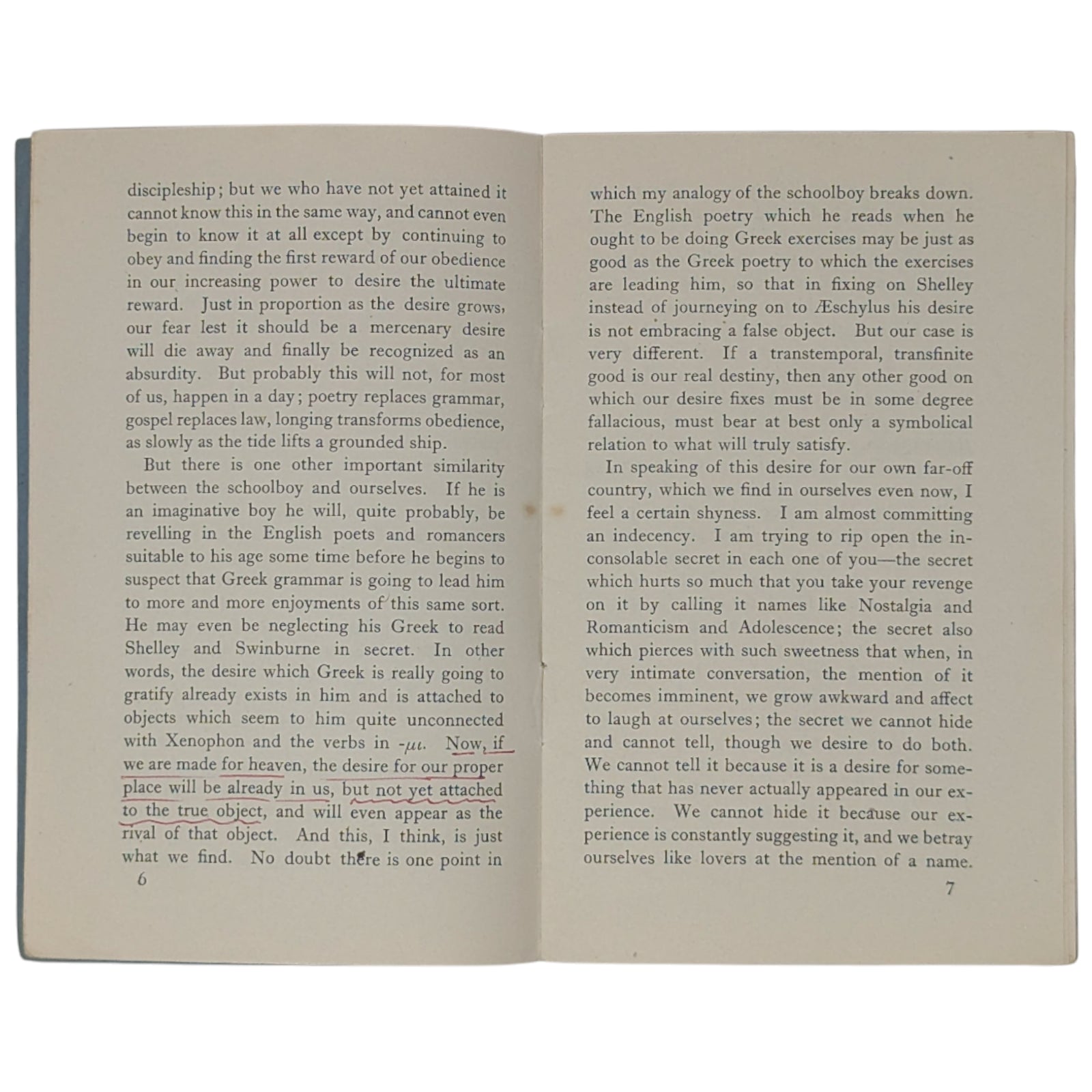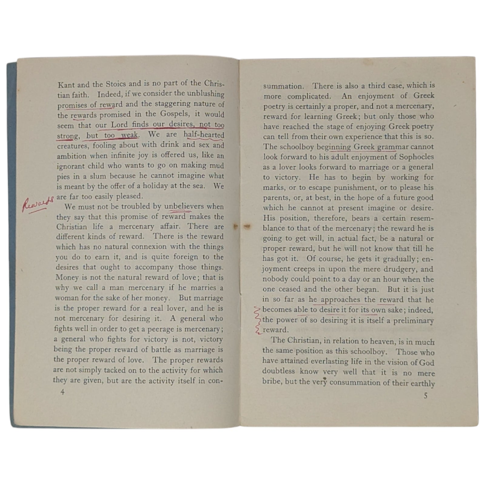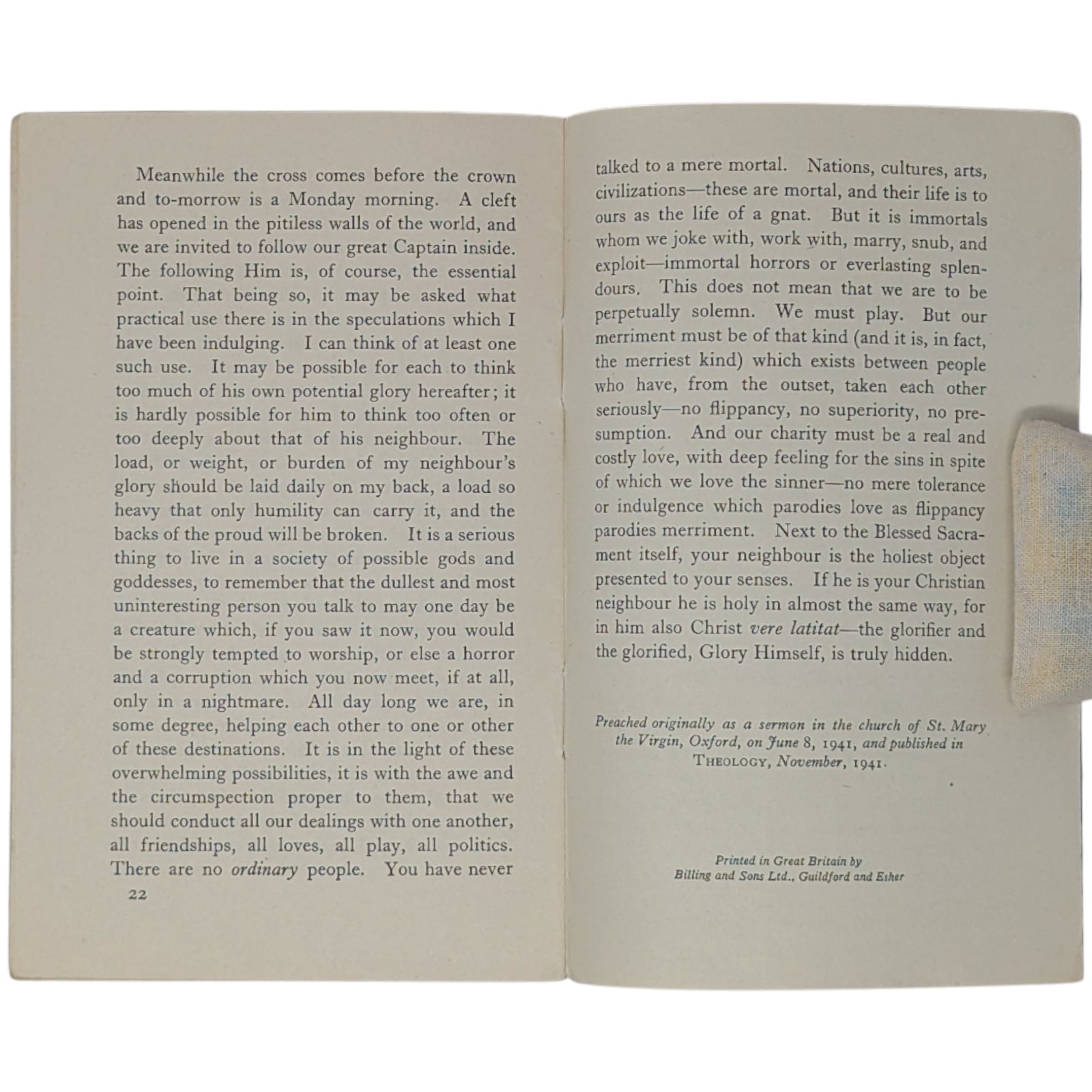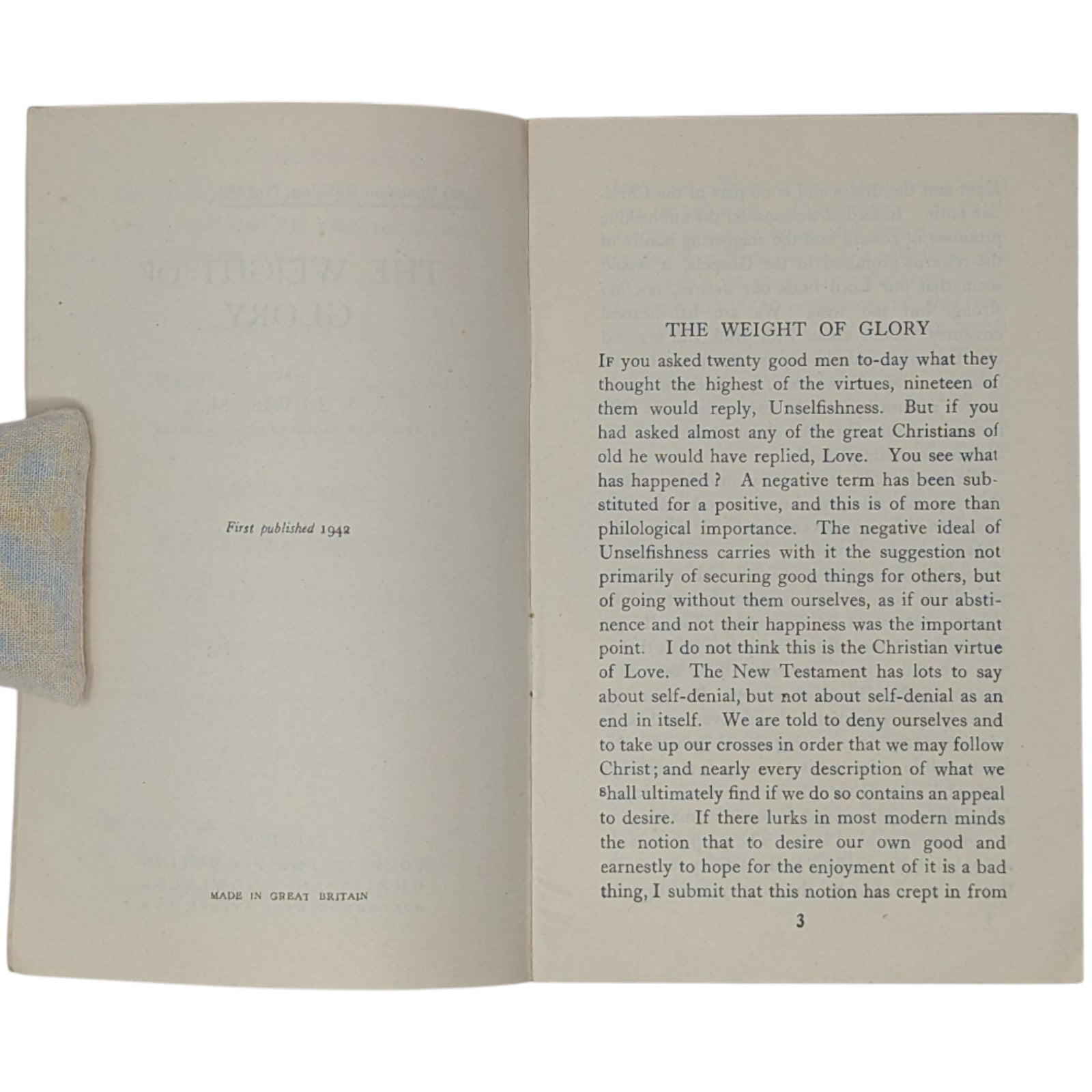 LEWIS, C.S. The Weight of Glory. Little Books on Religion, No. 189. London: Society for Promoting Christian Knowledge (SPCK), 1942. 16.6 x 10.6, 22 numbered pages, advertisements at front and rear. Printed by Billing and Sons. Publisher's original blue-gray wraps, with price of 2d. to front cover. Stated first published 1942 on the copyright page. Condition-wise, there is creasing and a little wear to extremities, small inscription in pencil to title page, a little rust around the staples within, mild foxing to extremities, and previous owner's highlights and a small annotation in red pen to the first six pages; else a clean and legible copy - if a little fragile - with none of the pages loose.