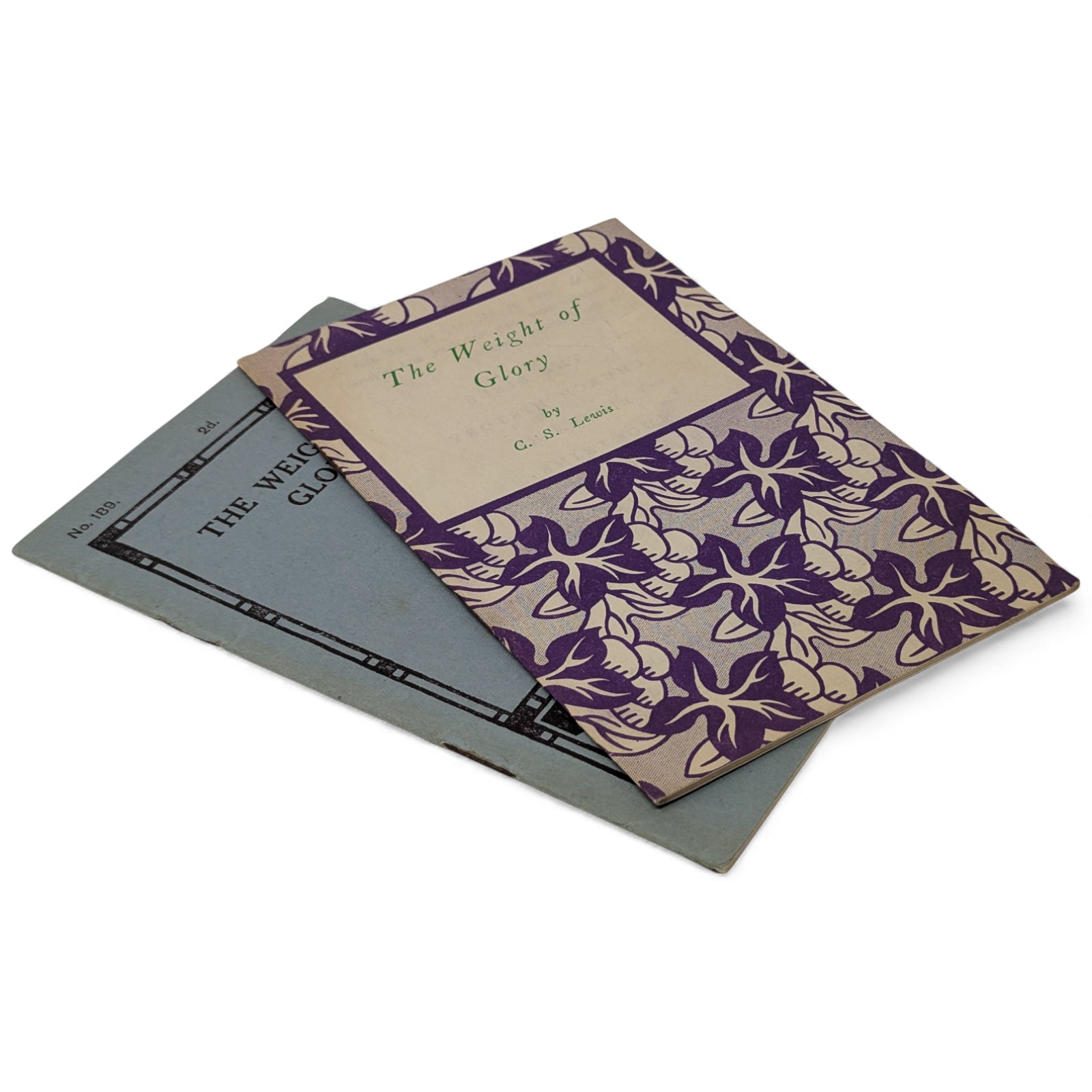 A unique opportunity of acquiring two different versions - both incredibly scarce - of C. S. Lewis' small pamphlet of a sermon preached in the church of St Mary the Virgin, Oxford on June 8, 1941. Described by Walter Hooper and Roger Lancelyn Green as "perhaps the most sublime piece of prose to come from his [C.S. Lewis'] pen", the sermon first appeared in print in 'Theology', XLIII (November 1941, pp. 263-74). Herewith are the first reprint iterations in pamphlet form, published by SPCK (Society for Promoting Christian Knowledge) with two different cover designs. As listed below: