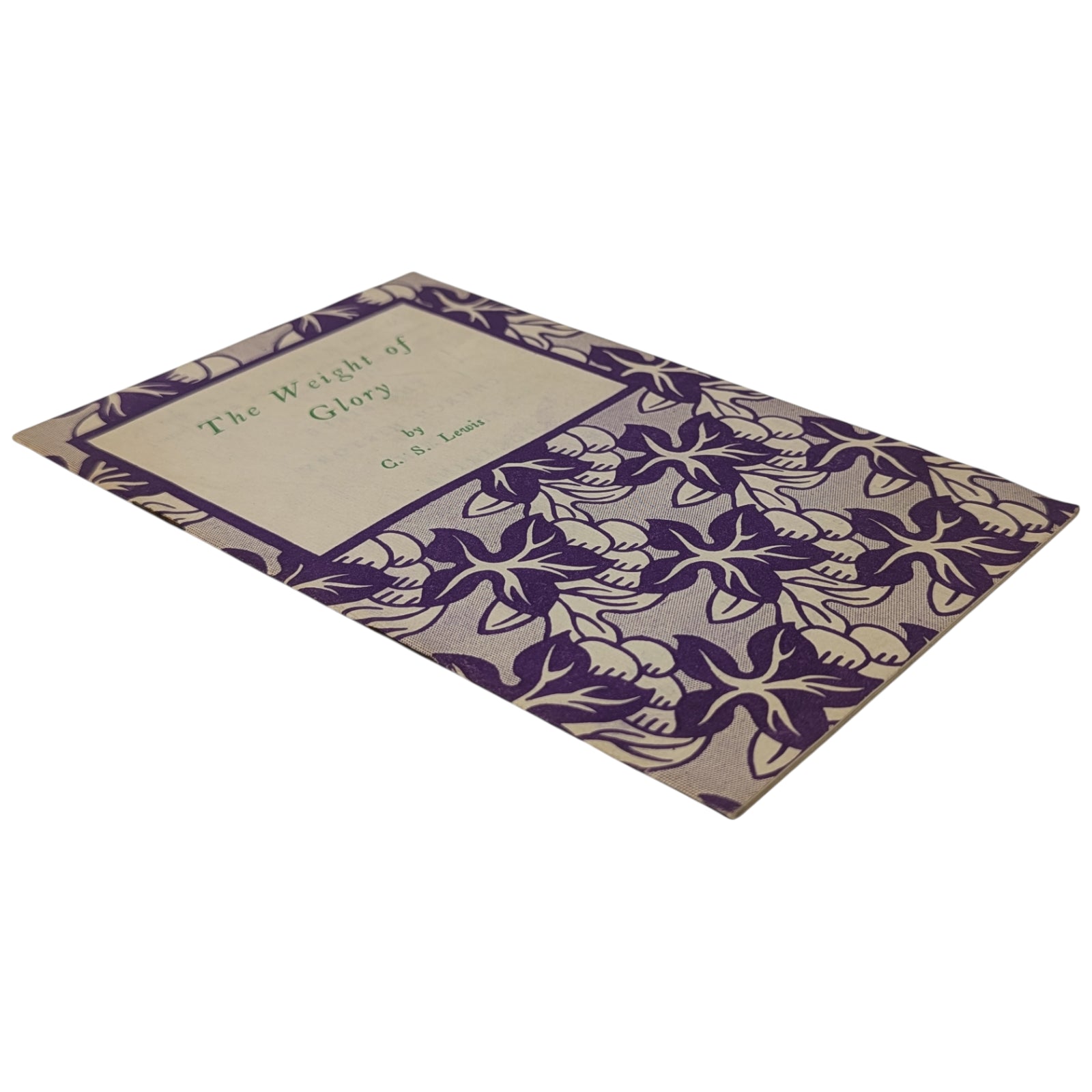 LEWIS, C.S. The Weight of Glory. Little Books on Religion, No. 189. London: Society for Promoting Christian Knowledge (SPCK), 1942. 16.4 x 10.4, 22 numbered pages, advertisements at front and rear. Printed by The Talbot Press. Publisher's original white and purple wraps with flower pattern, with price of 4d. to rear cover. Stated first published 1942 on the copyright page. Condition-wise, there is creasing to lower corners of all pages and mild foxing to extremities; else a clean and uninscribed copy - if a little fragile - with none of the pages loose.