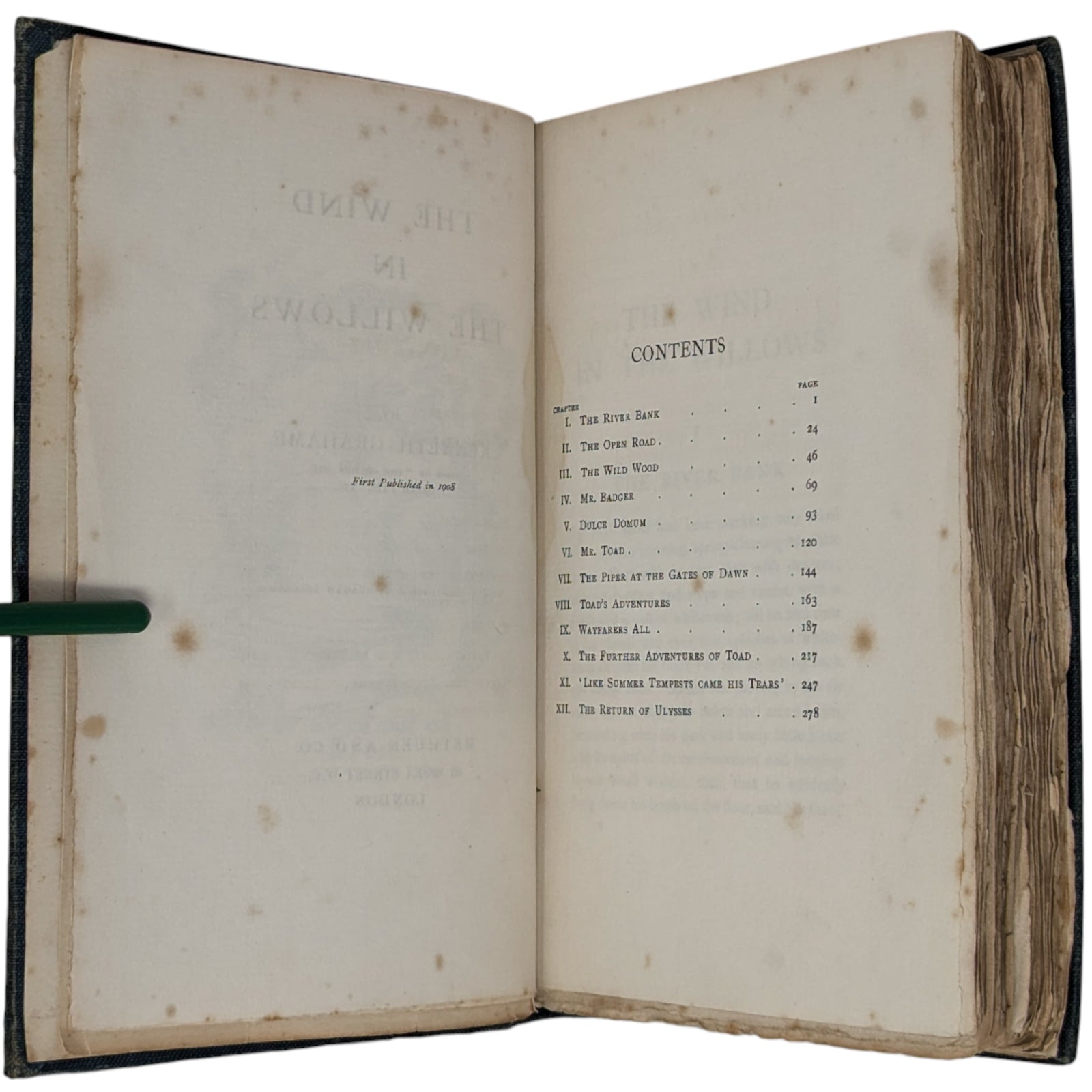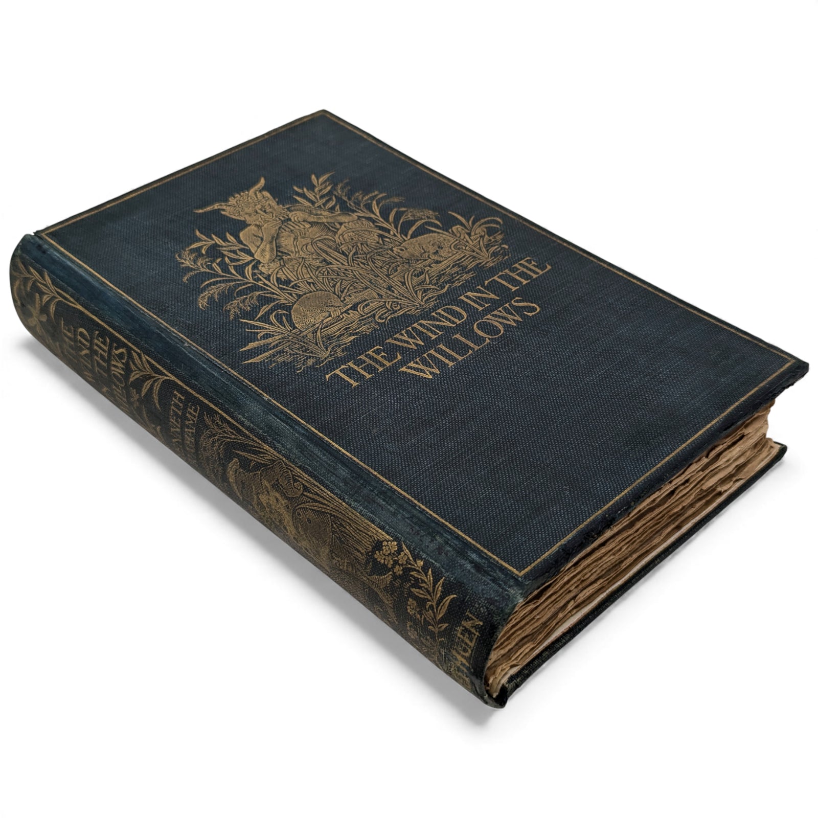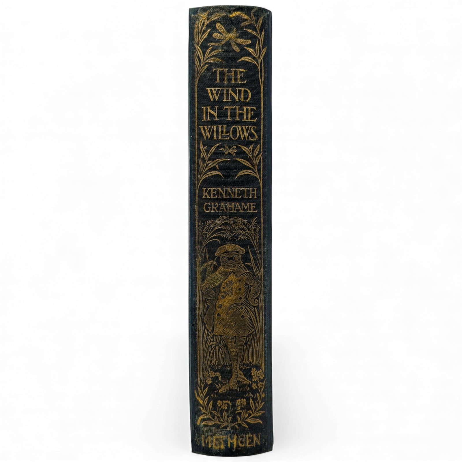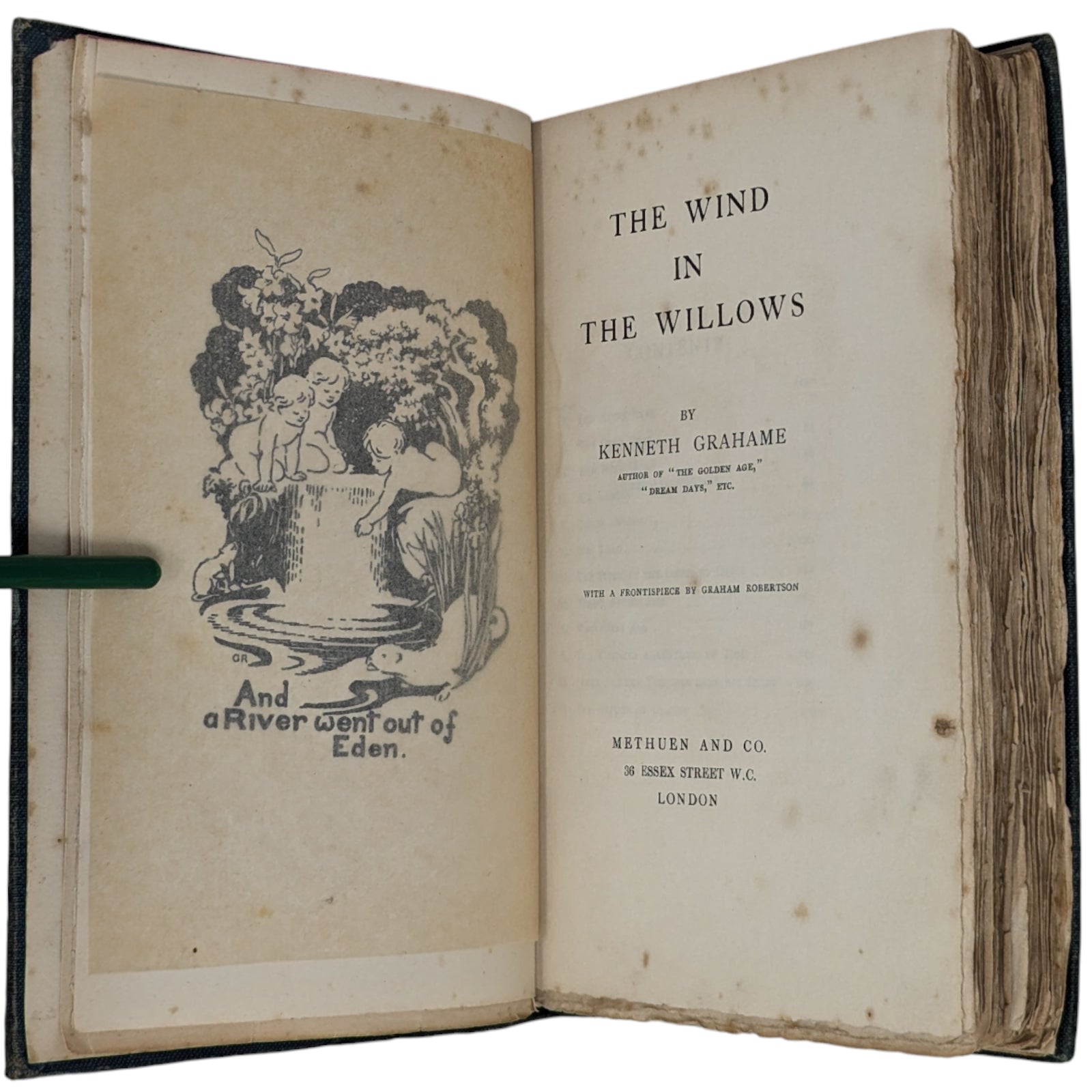 The Wind in the Willows by Kenneth Grahame. London: Methuen and Co., 1908. First edition. Octavo, 19.8 x 13.3 cm; 302 numbered pages. Original pictorial blue/green cloth stamped in gilt on front cover and spine, top edge gilt, others untrimmed. Black and white frontispiece by Graham Robertson, protected by tissue guard.