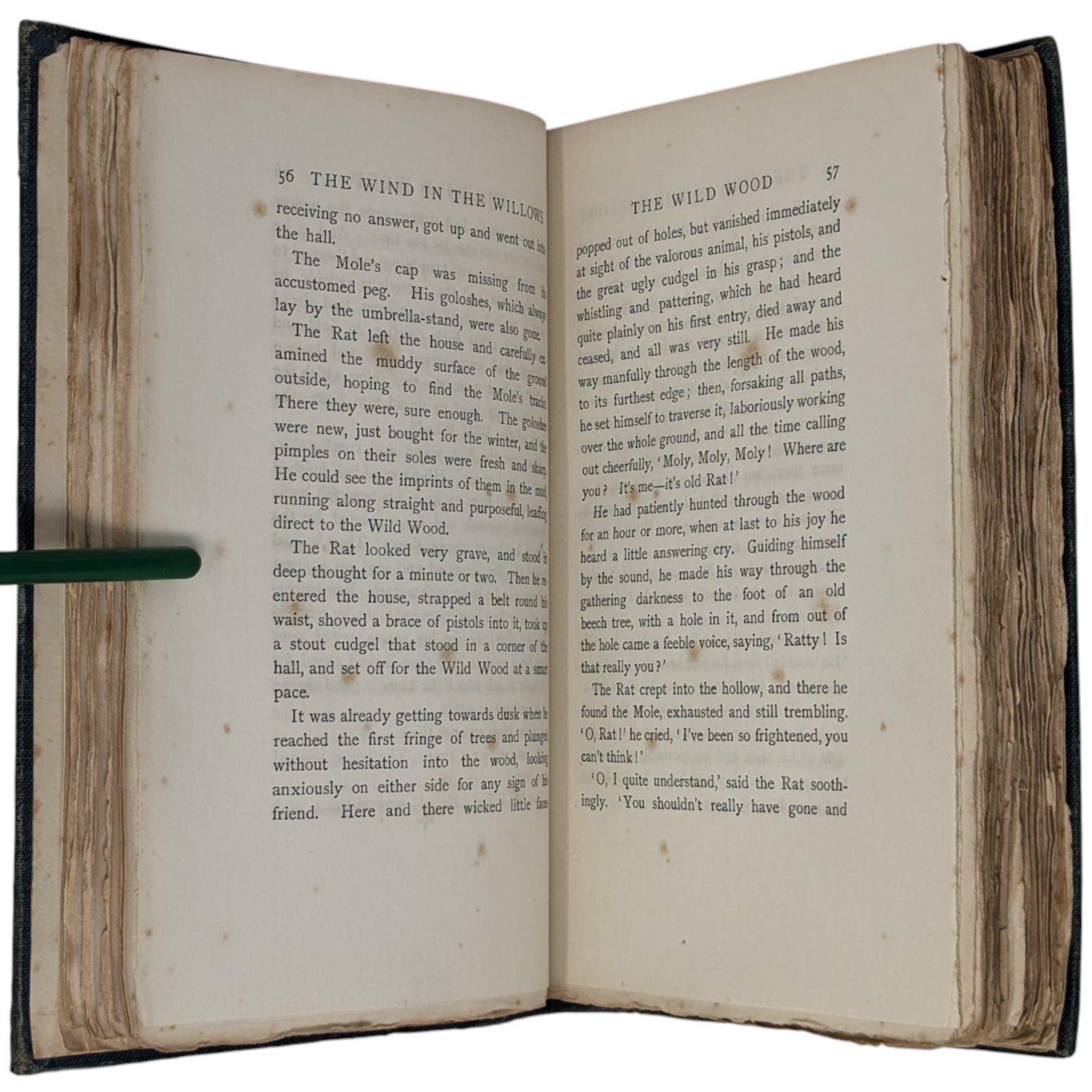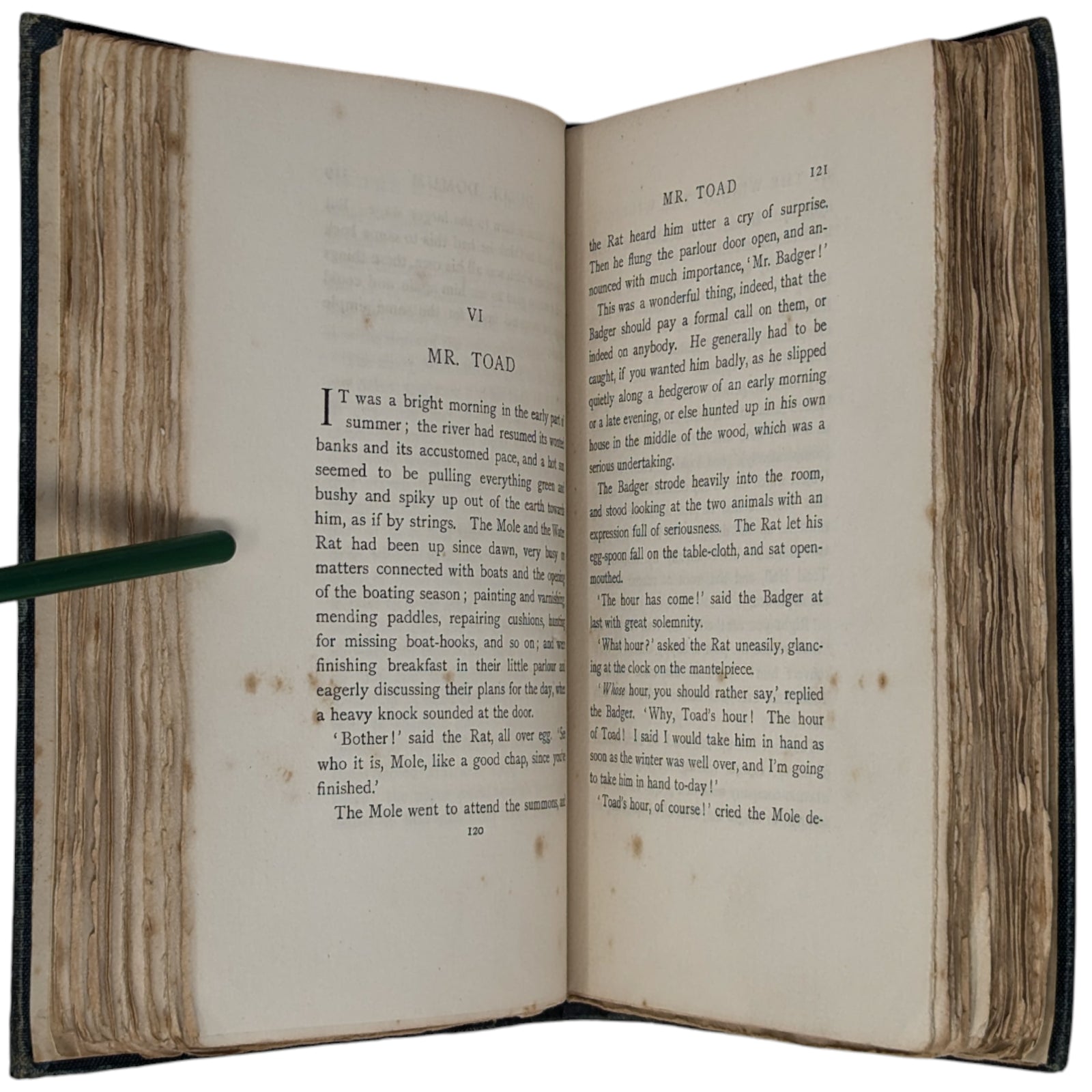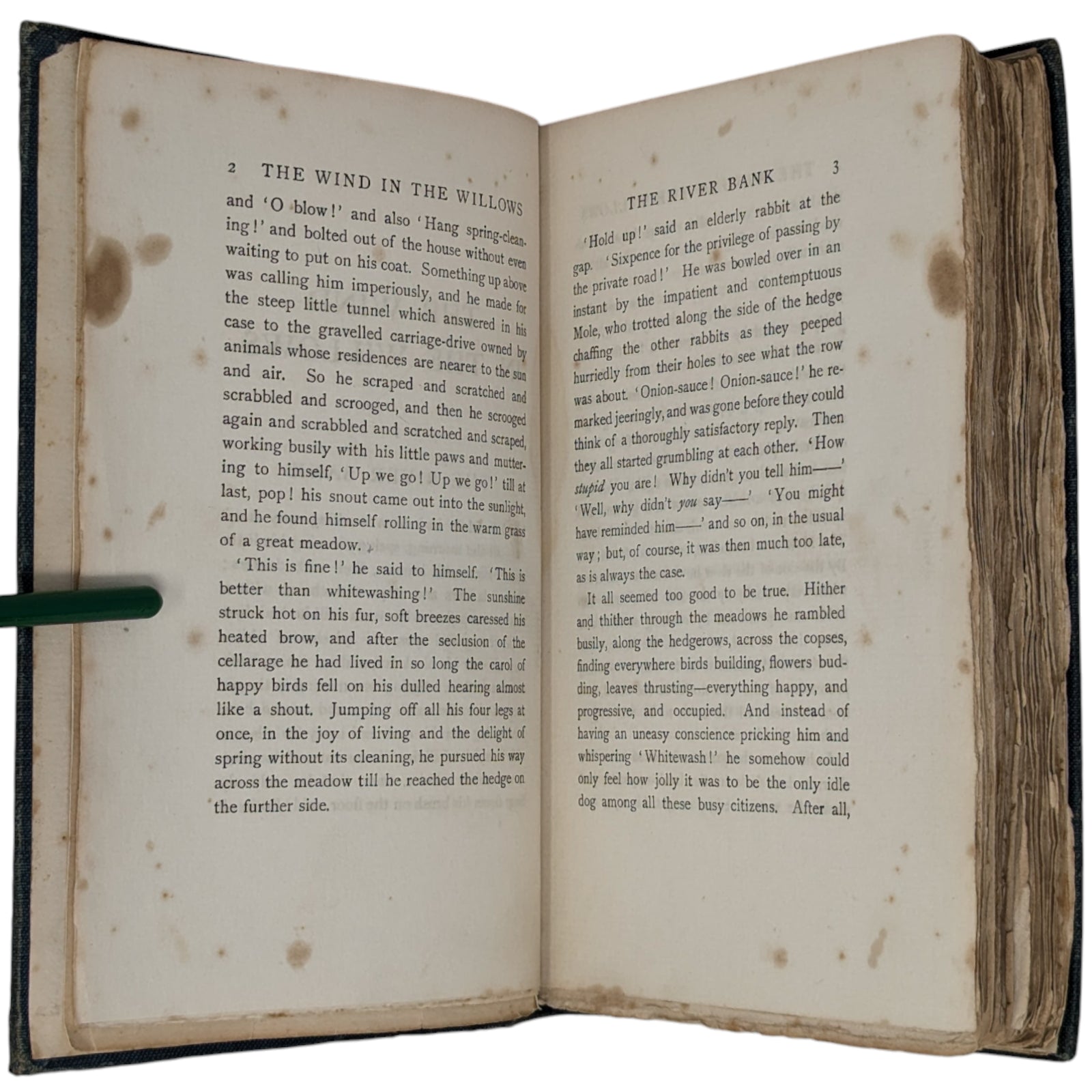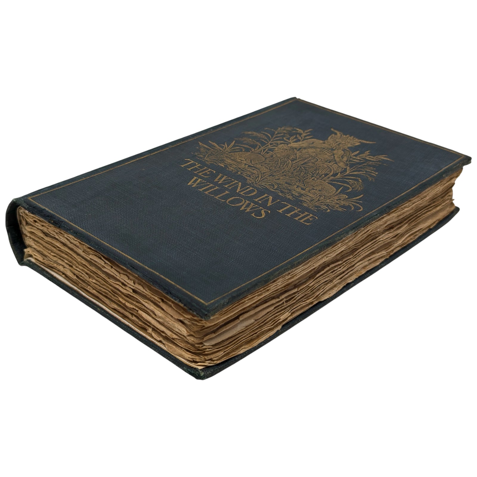 The Wind in the Willows by Kenneth Grahame. London: Methuen and Co., 1908. First edition. Octavo, 19.8 x 13.3 cm; 302 numbered pages. Original pictorial blue/green cloth stamped in gilt on front cover and spine, top edge gilt, others untrimmed. Black and white frontispiece by Graham Robertson, protected by tissue guard.