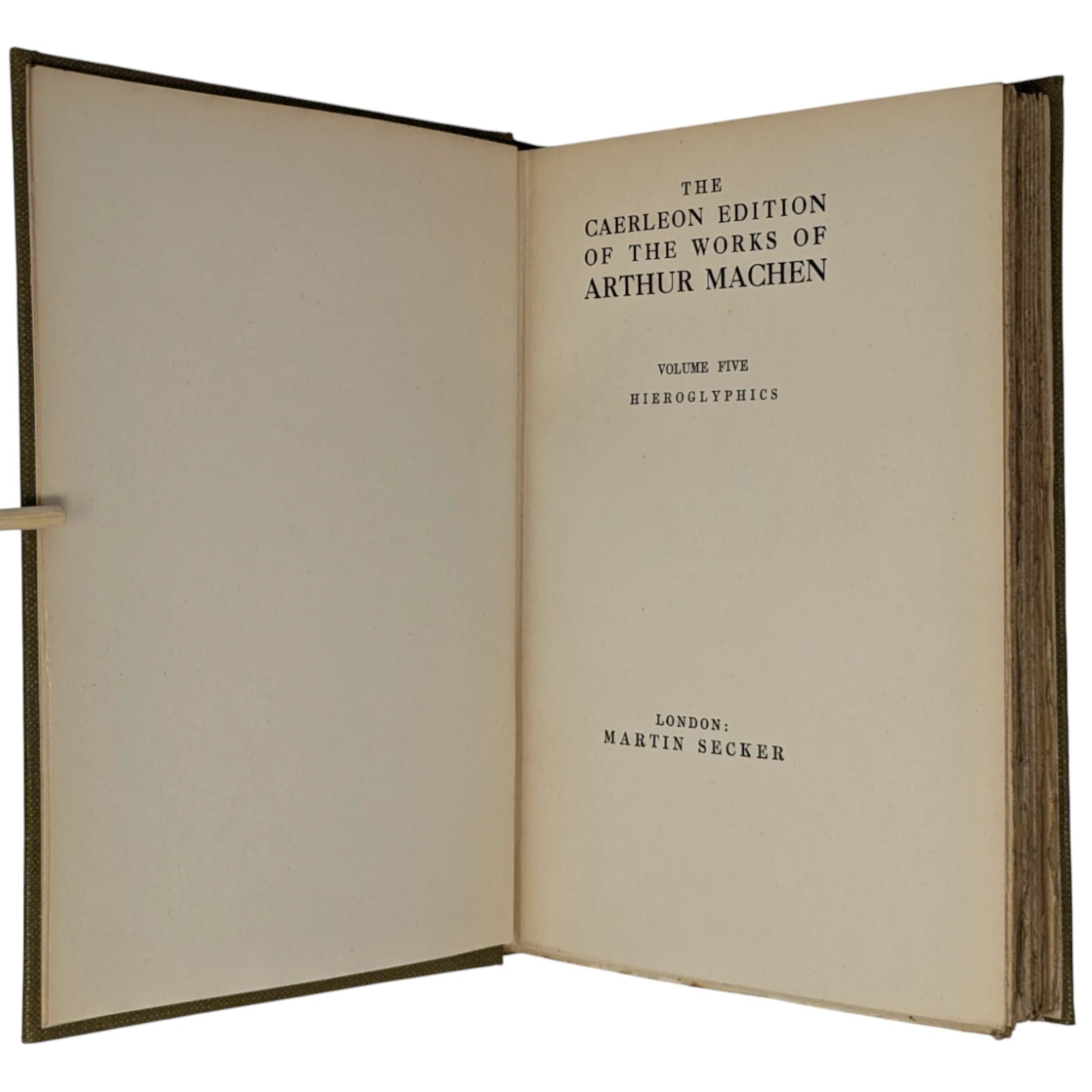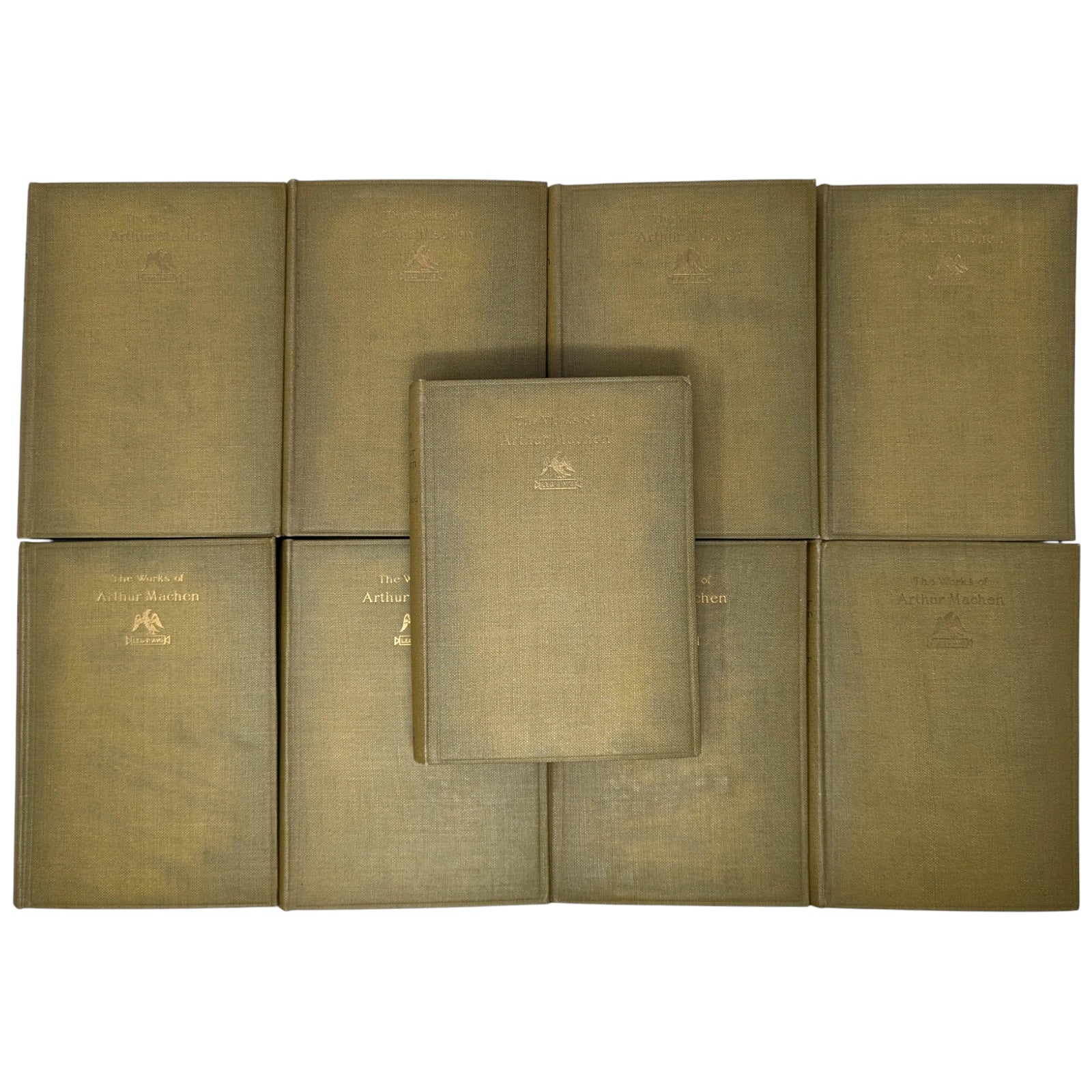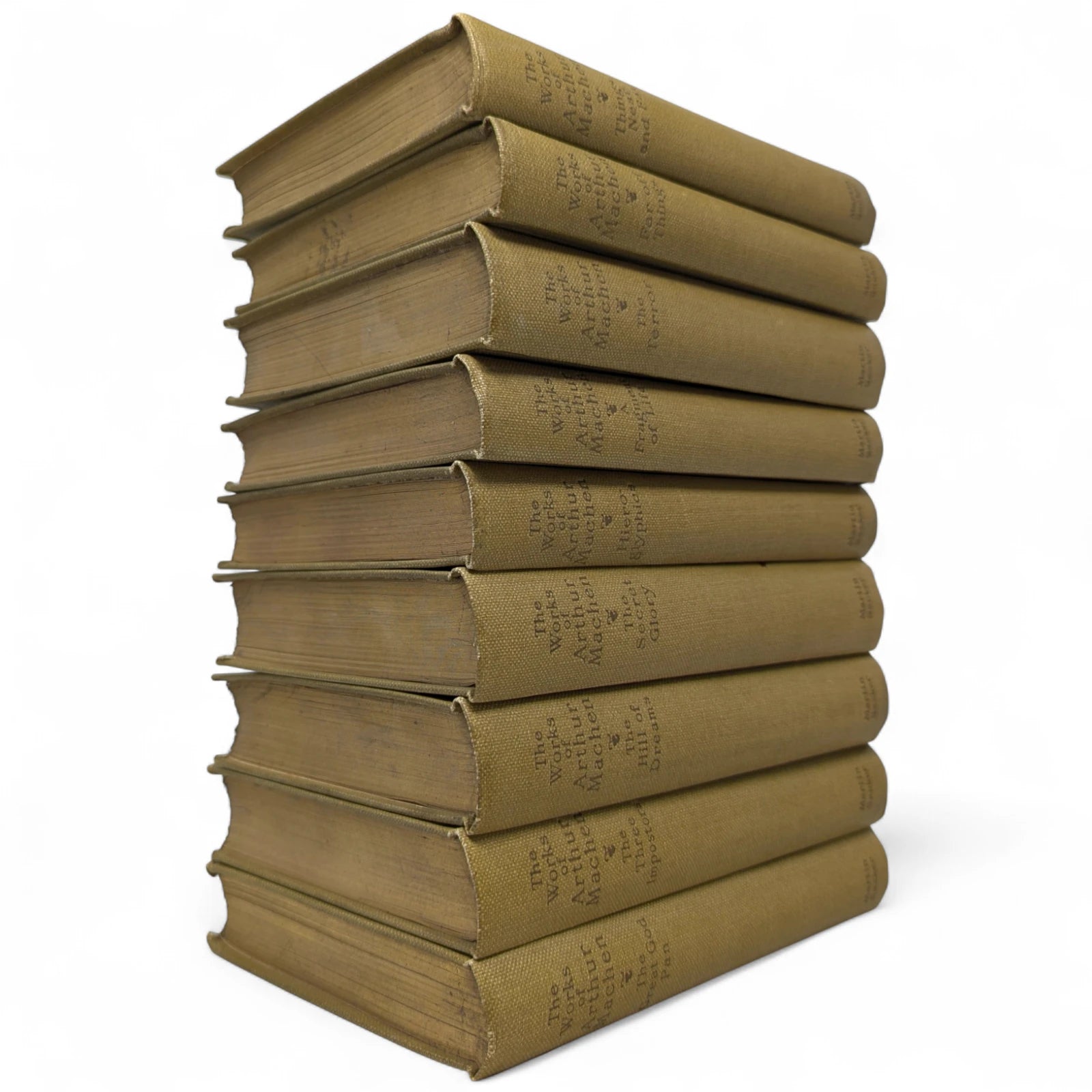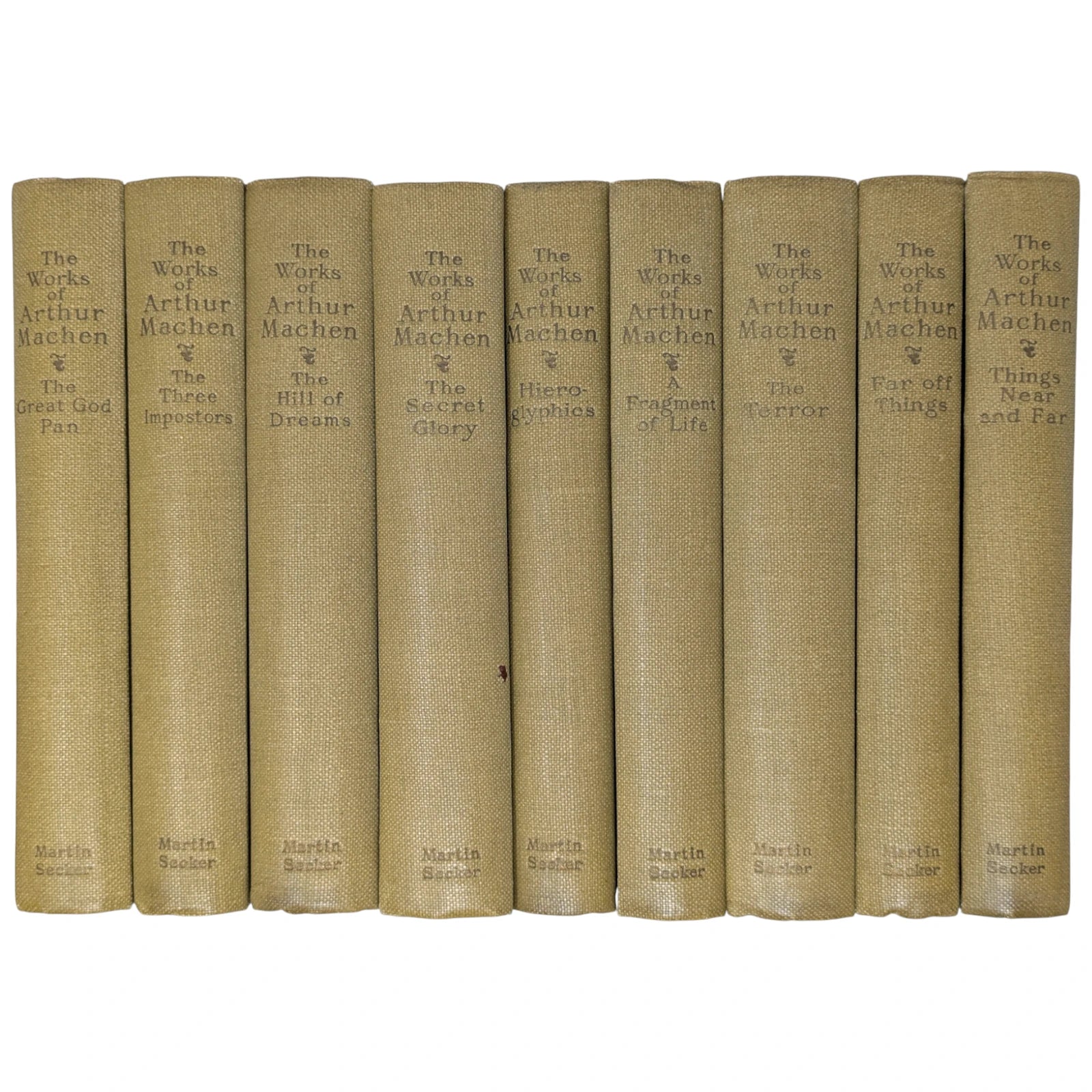 9 vols., 8vo. Publisher's original olive buckram, upper boards blocked and lettered in gilt, gilt tops, other edges uncut. First definitive iteration of Machen's complete works, printed on laid paper, with portrait frontispiece in photogravure, with tissue guard present.