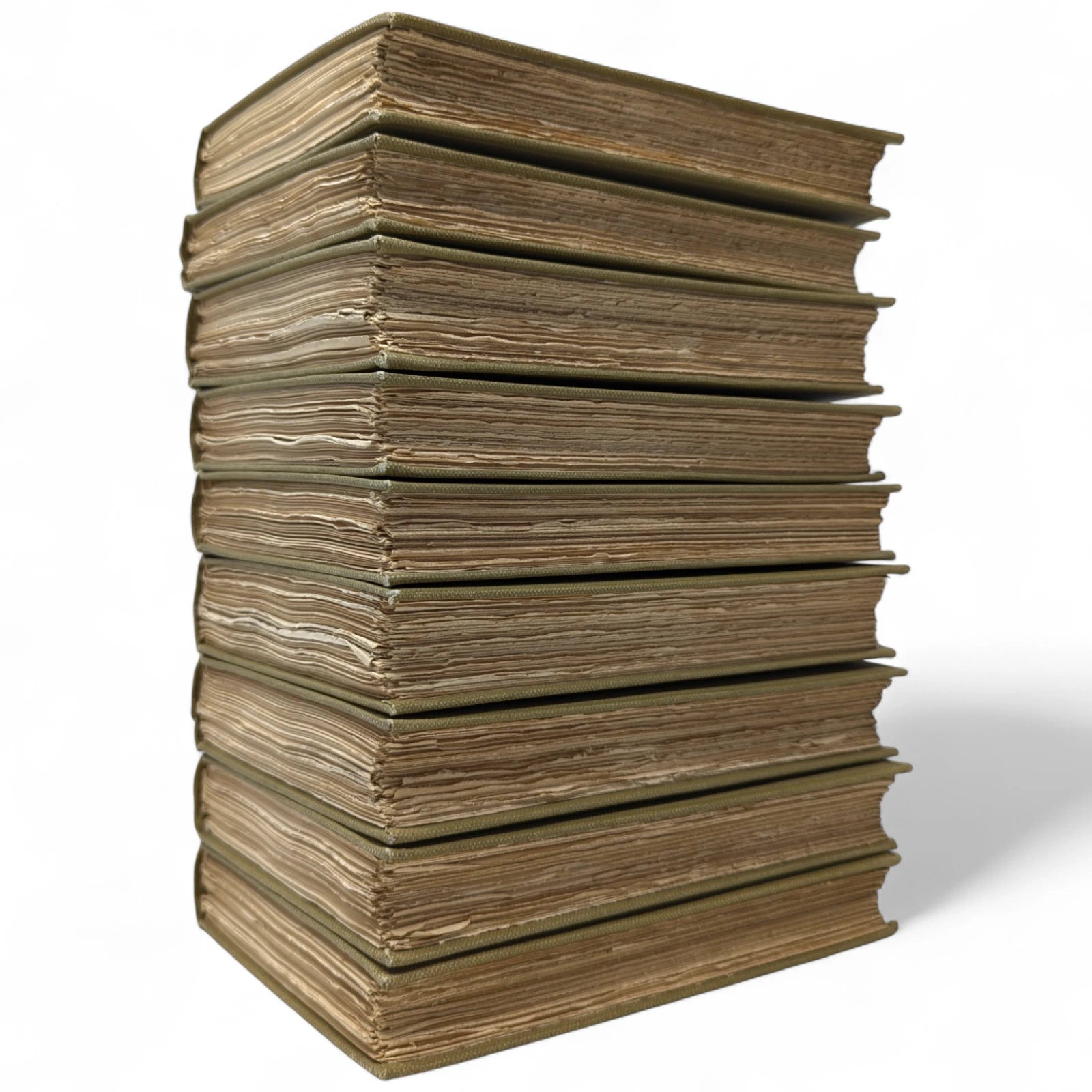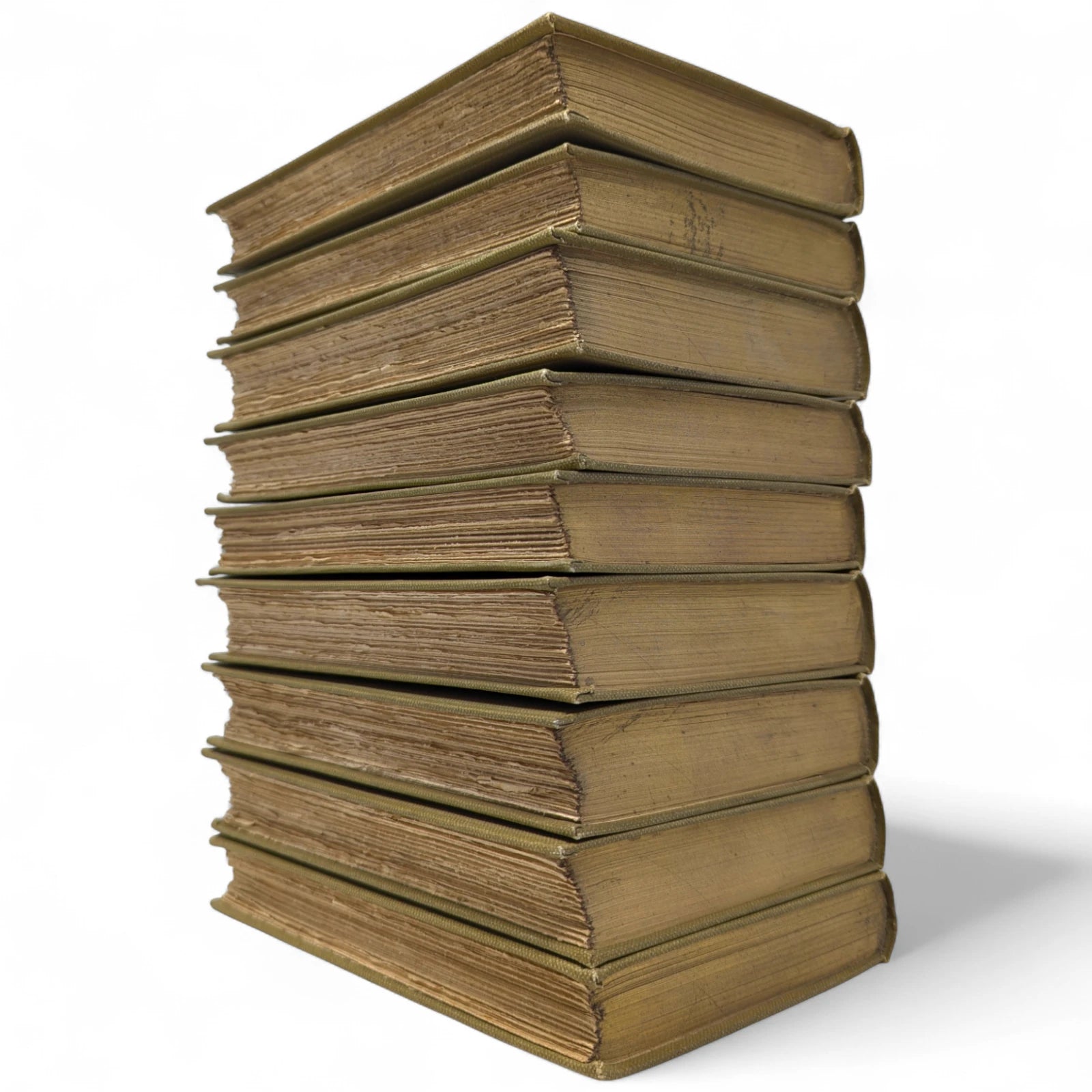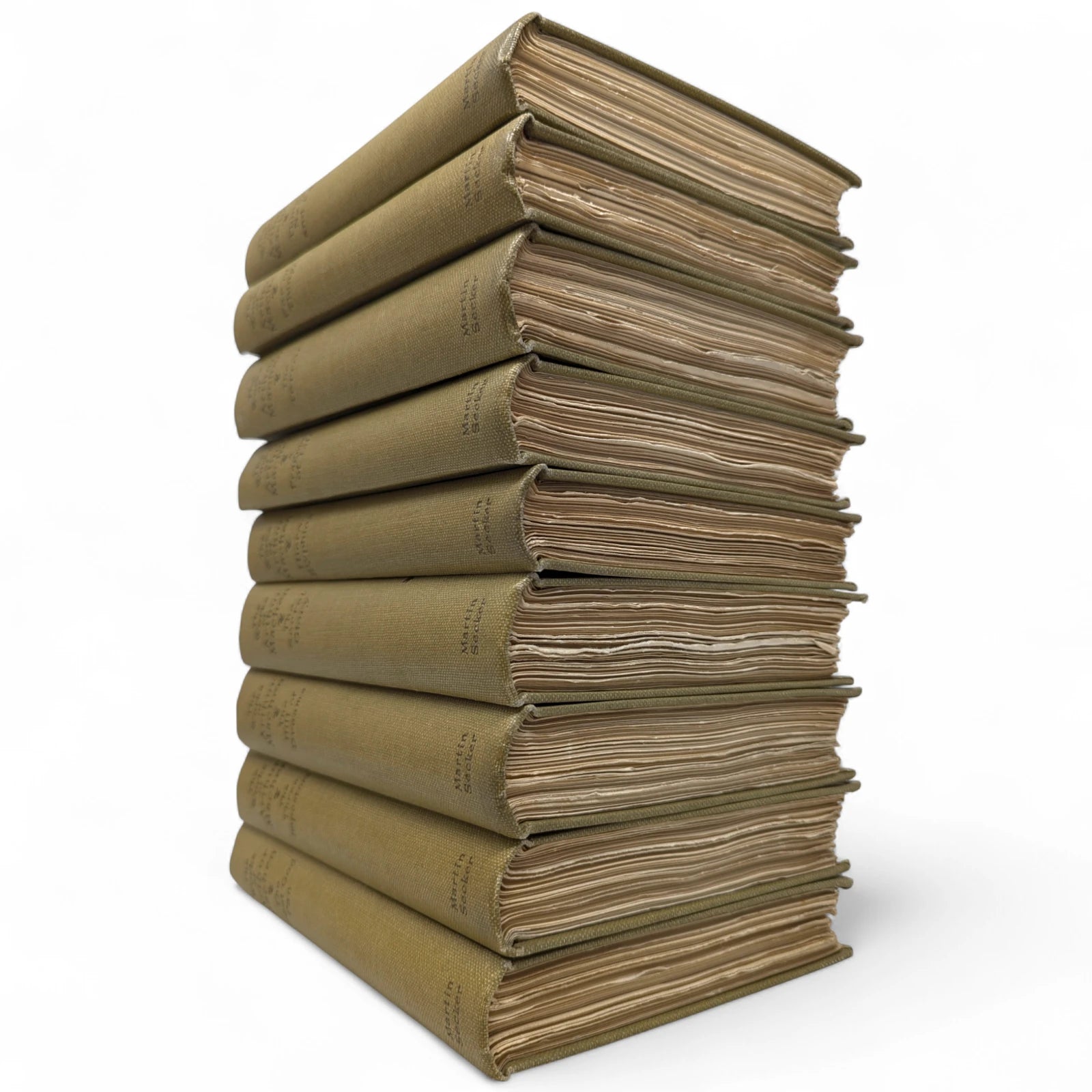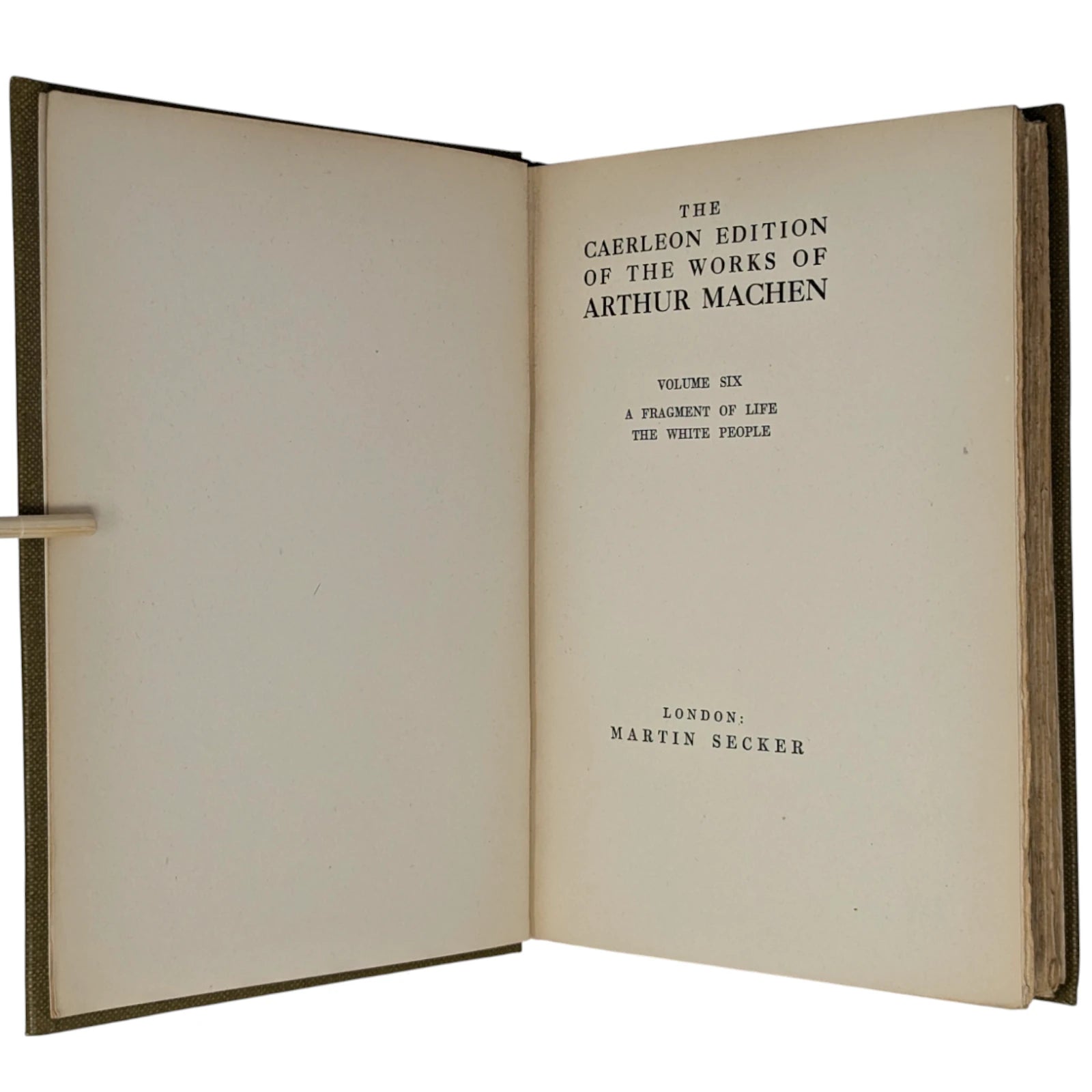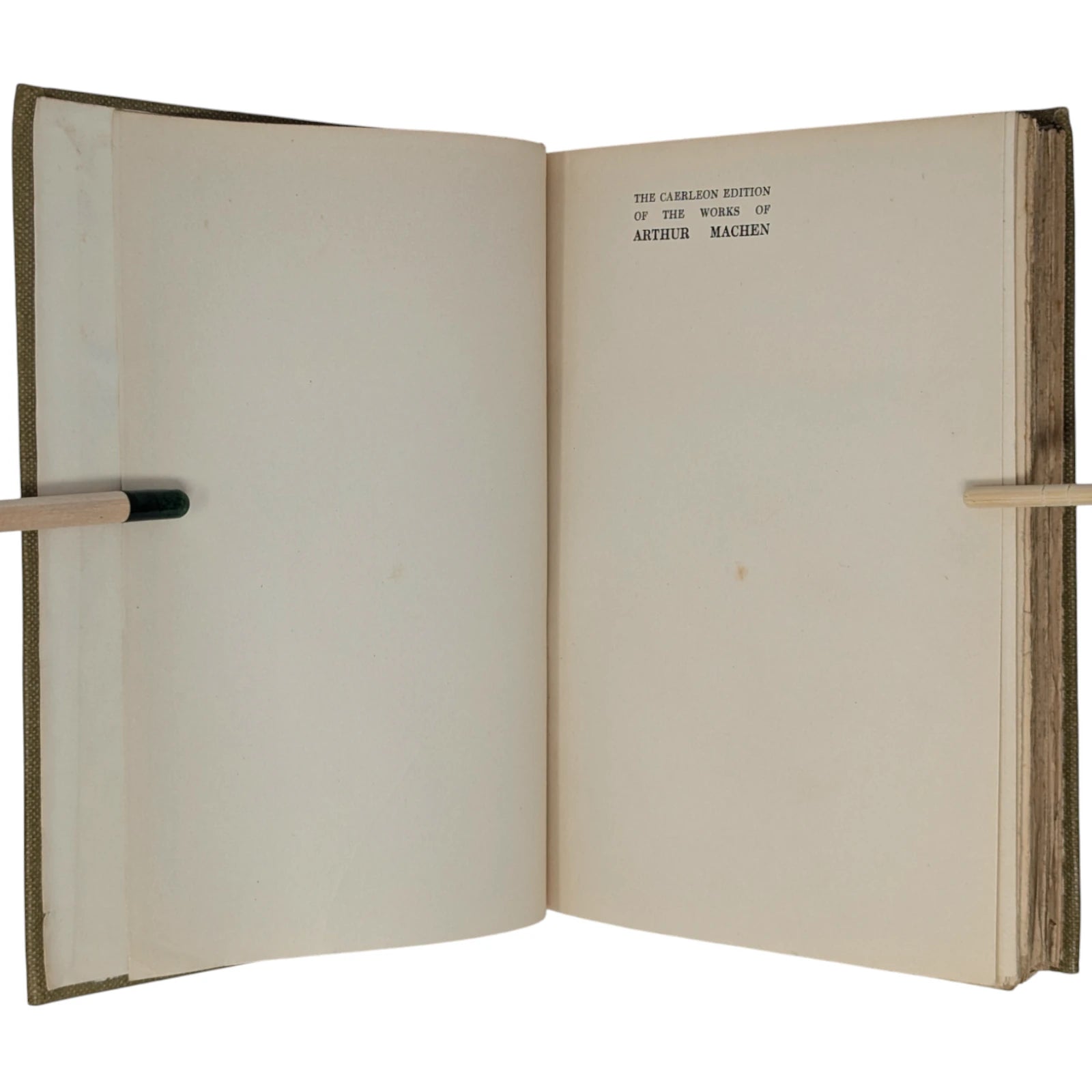 9 vols., 8vo. Publisher's original olive buckram, upper boards blocked and lettered in gilt, gilt tops, other edges uncut. First definitive iteration of Machen's complete works, printed on laid paper, with portrait frontispiece in photogravure, with tissue guard present.