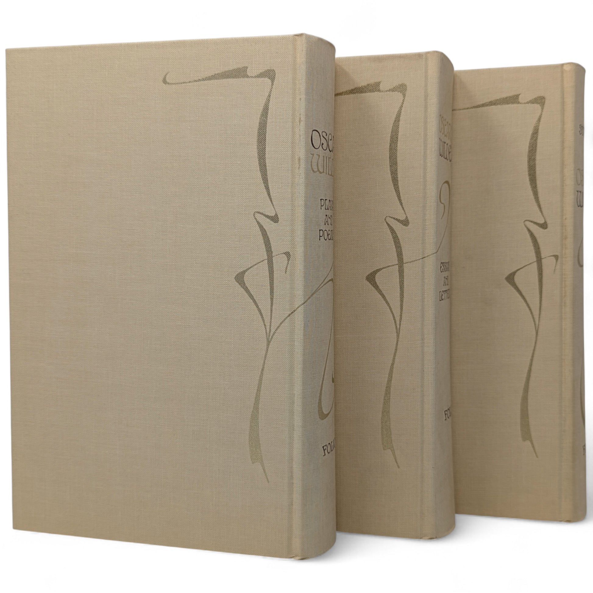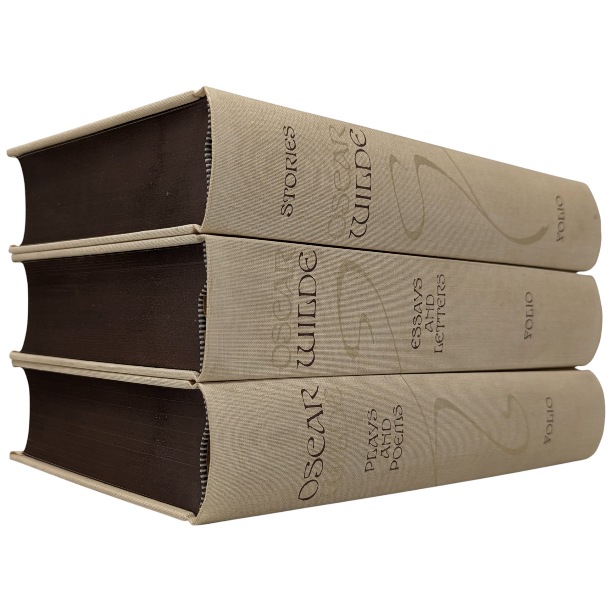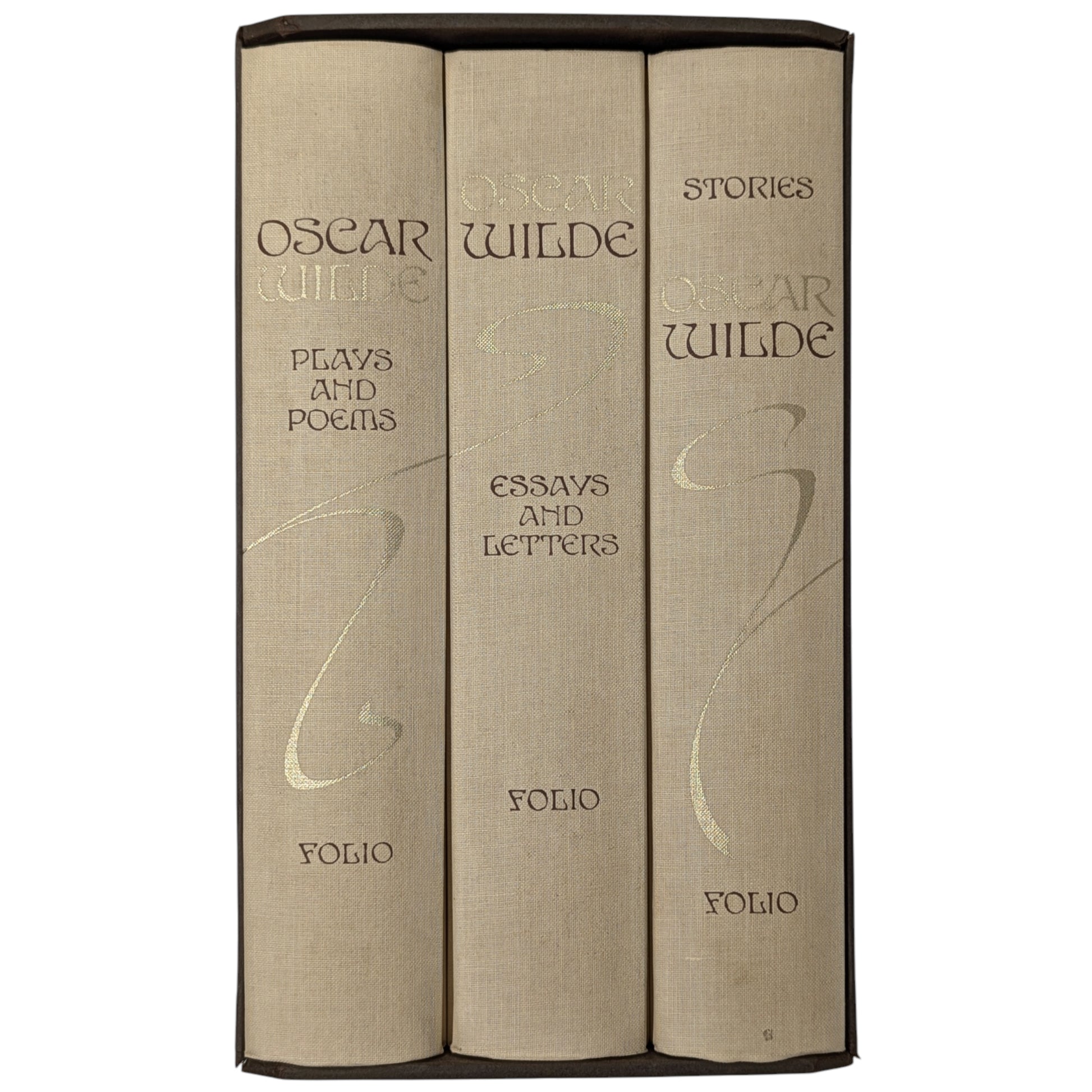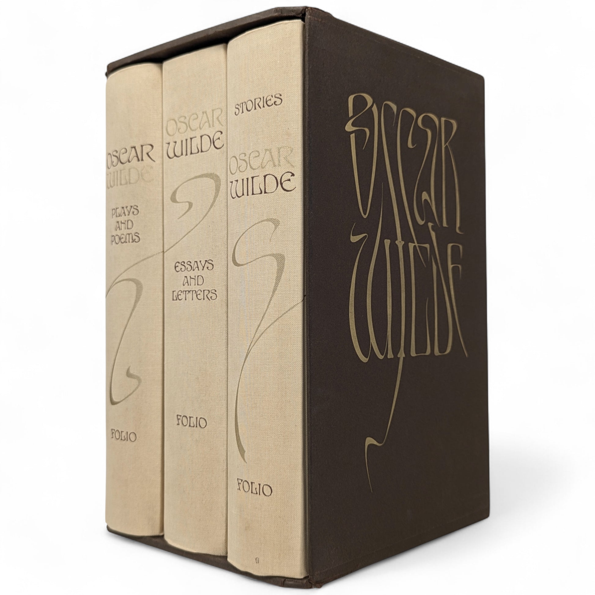 WILDE, Oscar. The Works. London: The Folio Society, 1993. Fourth printing, 1997. Designed by Malcolm Harvey Young. 252 × 163 × 46–49 mm. 3 vols (see below). Type: Linotype Walbaum with hand-drawn lettering (by Young, based on the typeface Edda) for display. Typeset by Fakenham Photosetting, printed and bound by the Bath Press. Full pale brown cloth with a design in dark brown and gold by Young; dark brown endleaves. Dark brown three-volume slip case with Wilde’s name in gold (in lettering designed by Young). The three volumes are as follows: