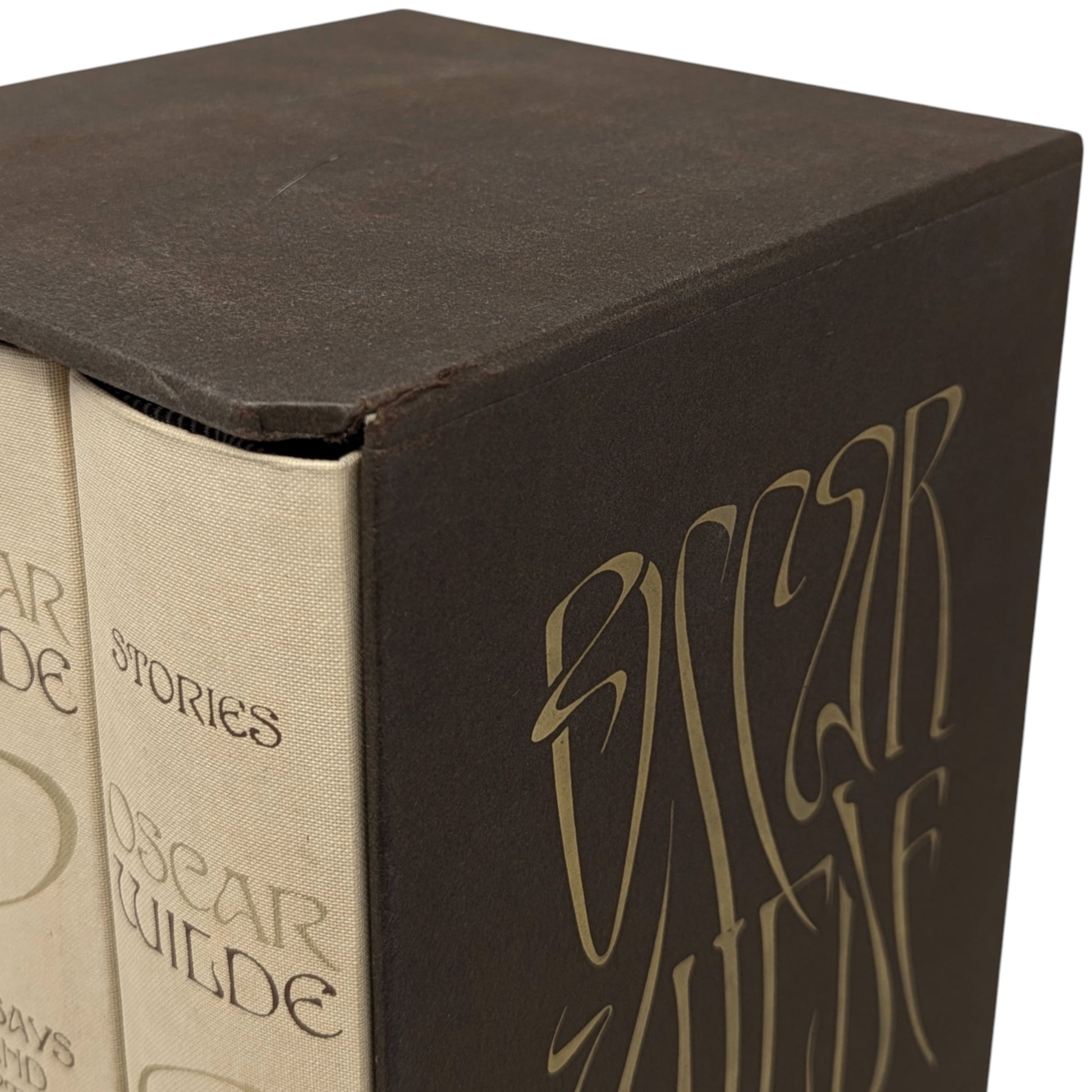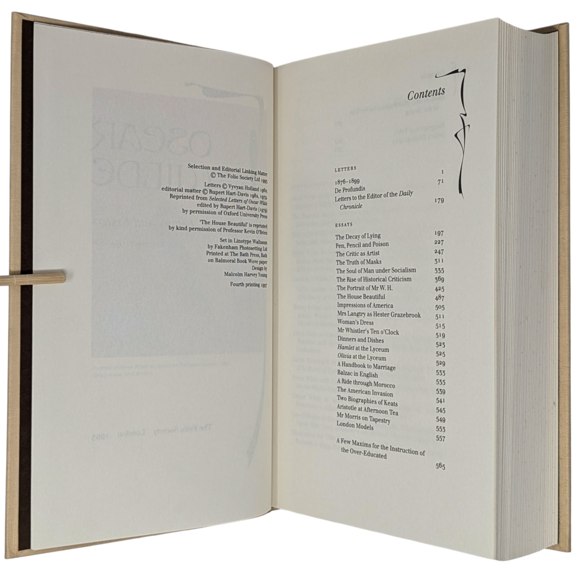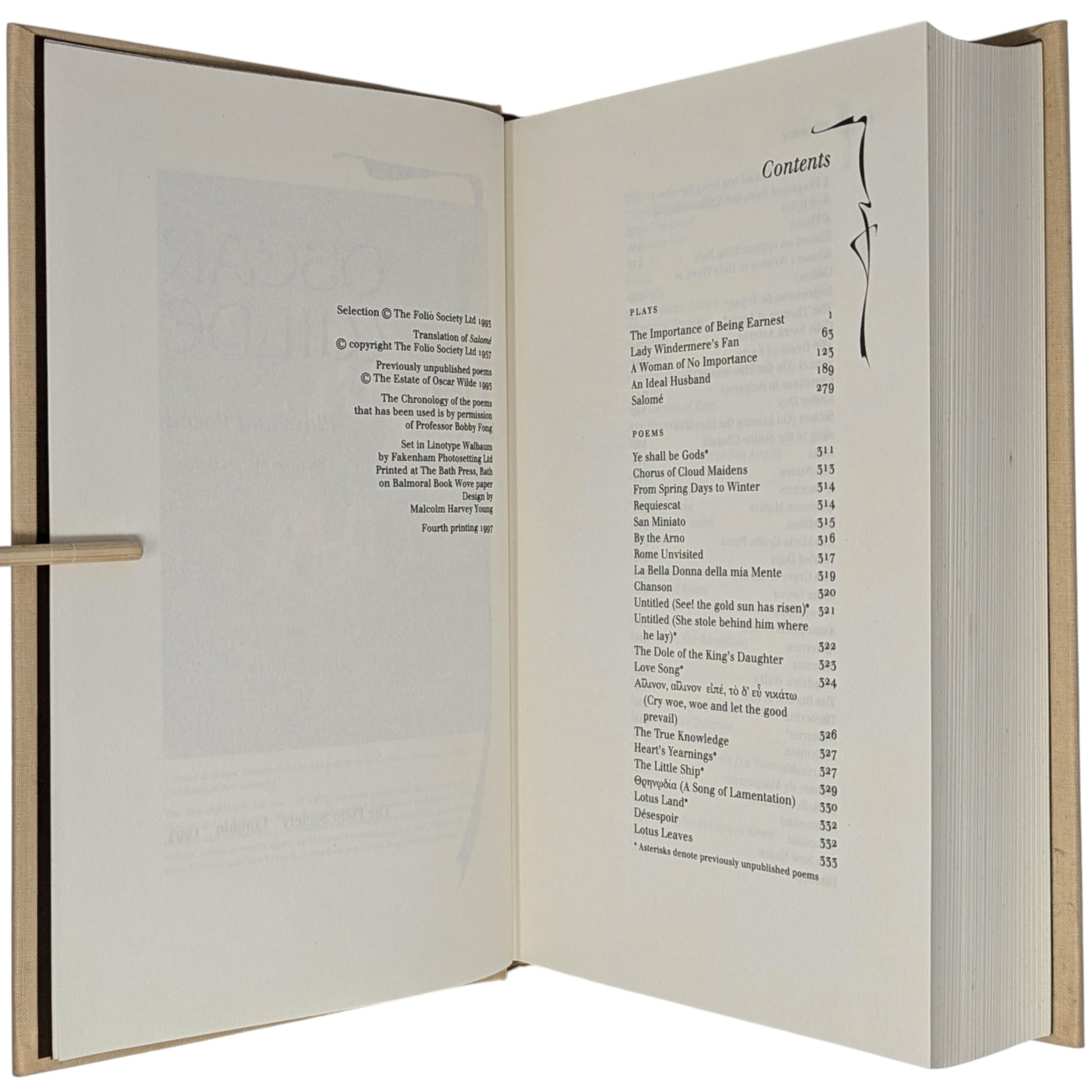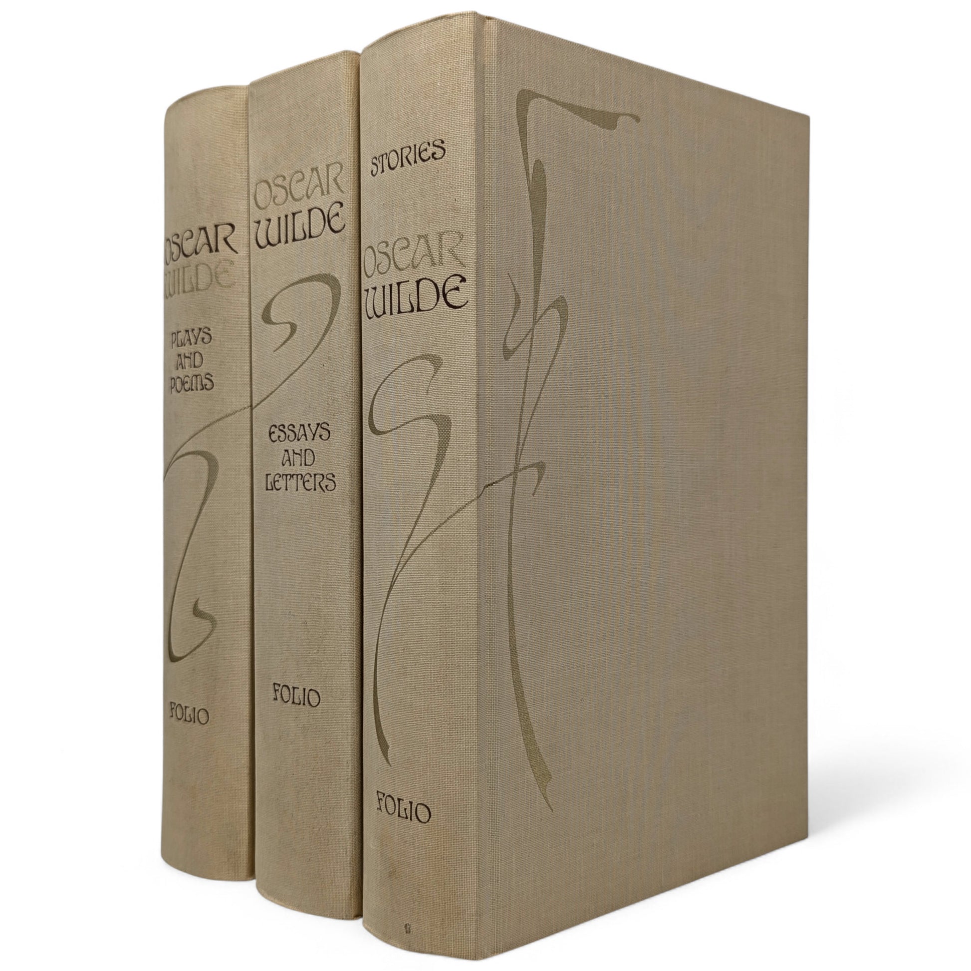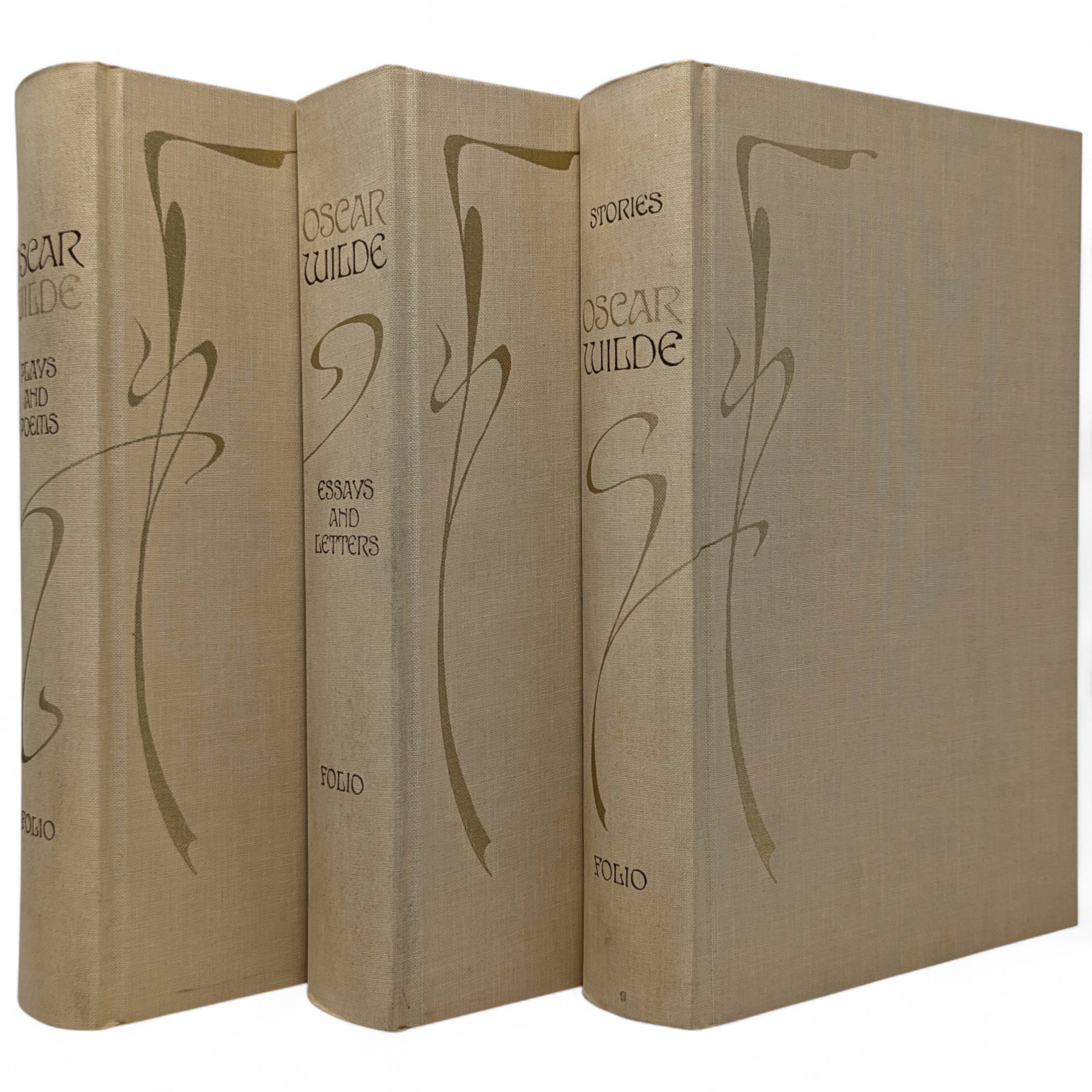 WILDE, Oscar. The Works. London: The Folio Society, 1993. Fourth printing, 1997. Designed by Malcolm Harvey Young. 252 × 163 × 46–49 mm. 3 vols (see below). Type: Linotype Walbaum with hand-drawn lettering (by Young, based on the typeface Edda) for display. Typeset by Fakenham Photosetting, printed and bound by the Bath Press. Full pale brown cloth with a design in dark brown and gold by Young; dark brown endleaves. Dark brown three-volume slip case with Wilde’s name in gold (in lettering designed by Young). The three volumes are as follows: