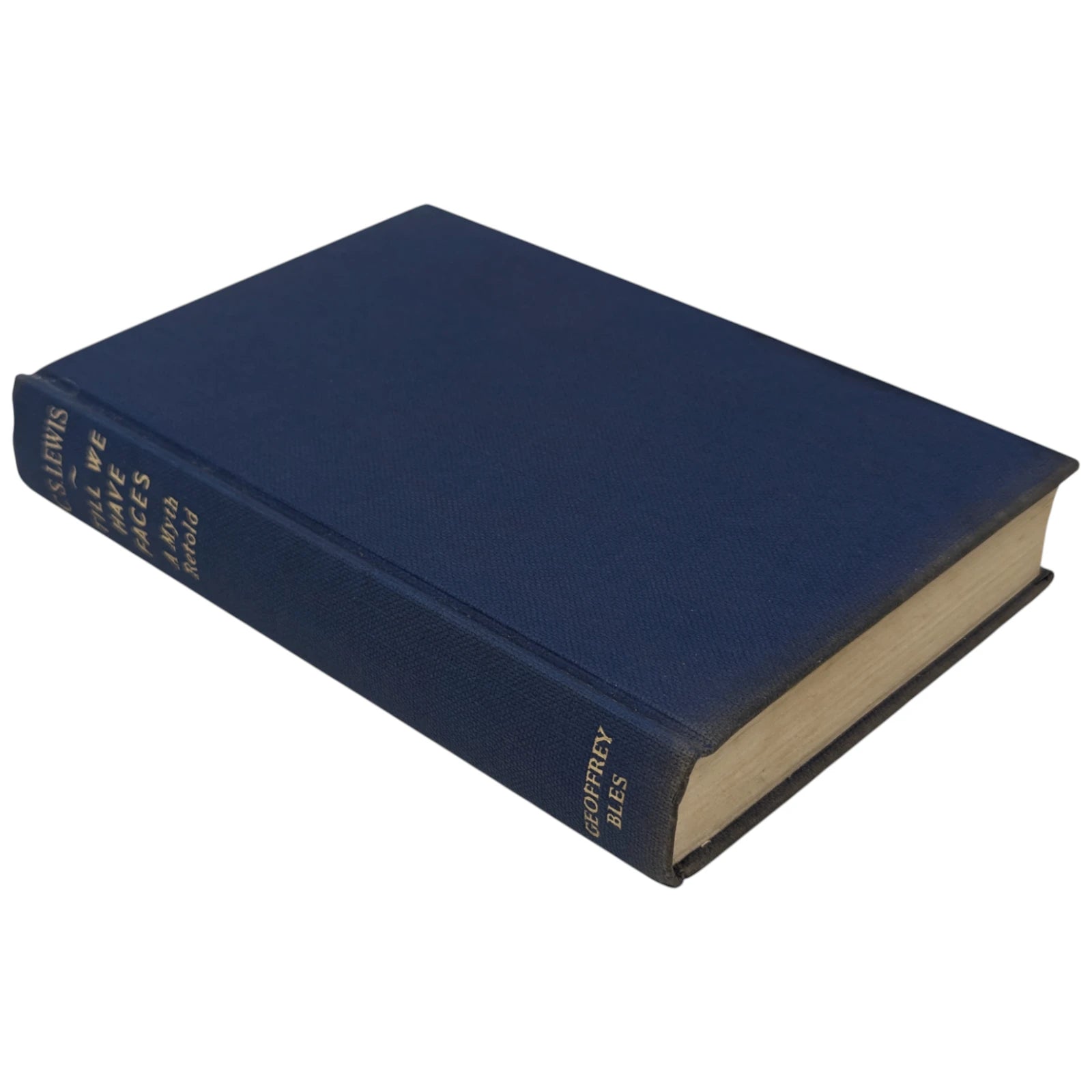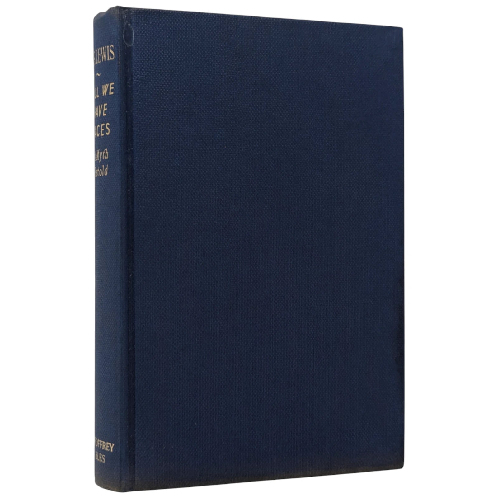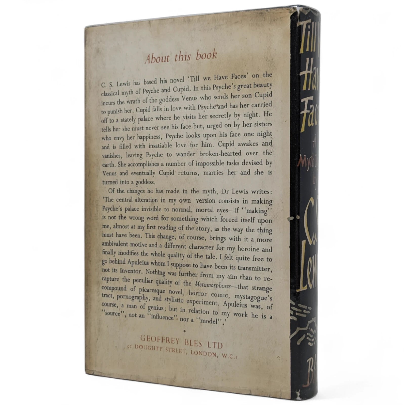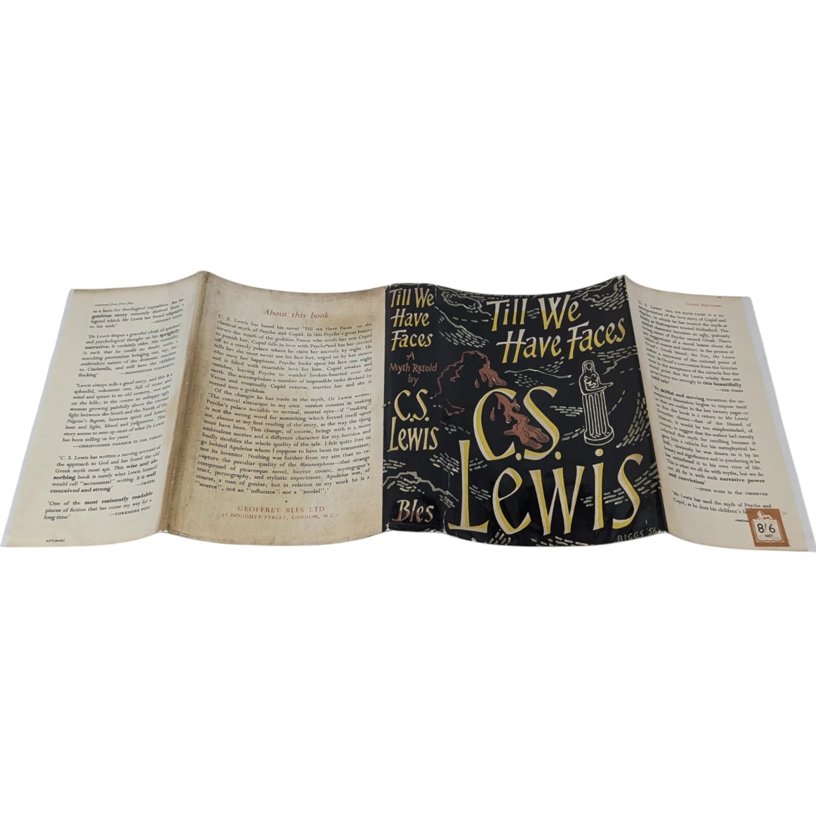 Till We Have Faces by C. S. Lewis. London: Geoffrey Bles, 1956. First edition, second impression. Publisher's original blue binding; with unclipped dust wrapper with 8/6 net sticker on top of the original price on the front flap. Sized 19 x 12.8 cm. Pp. 320.
