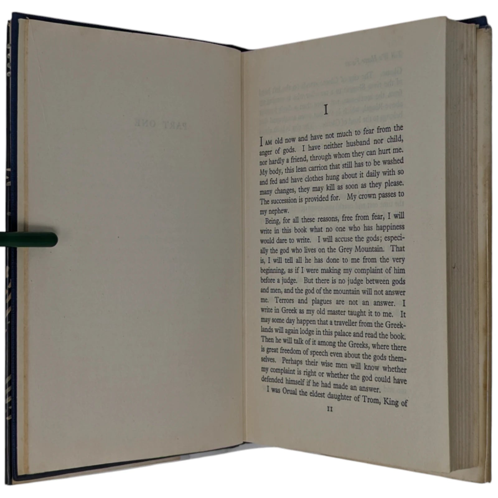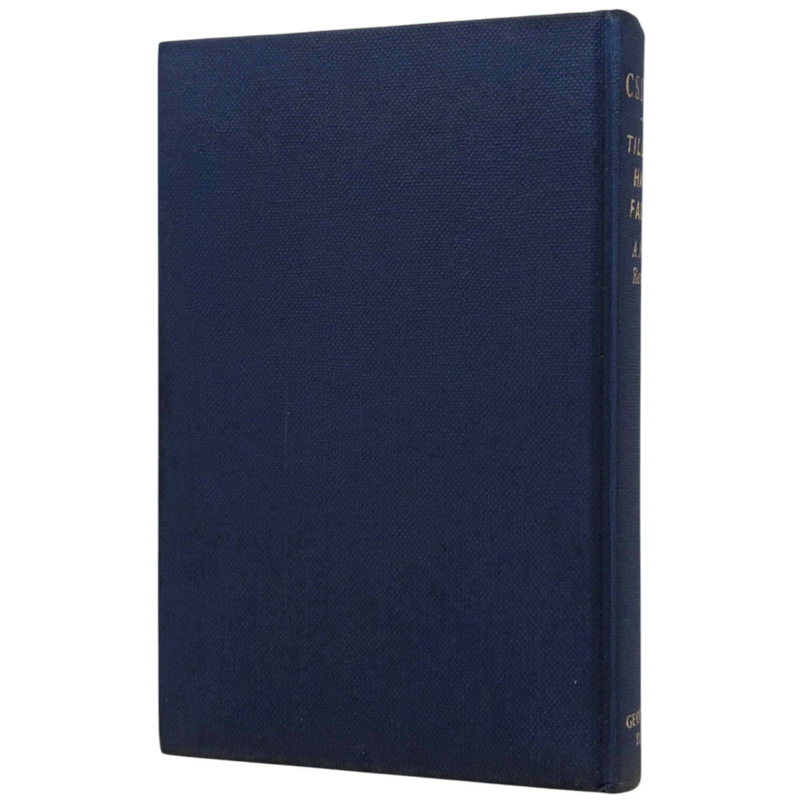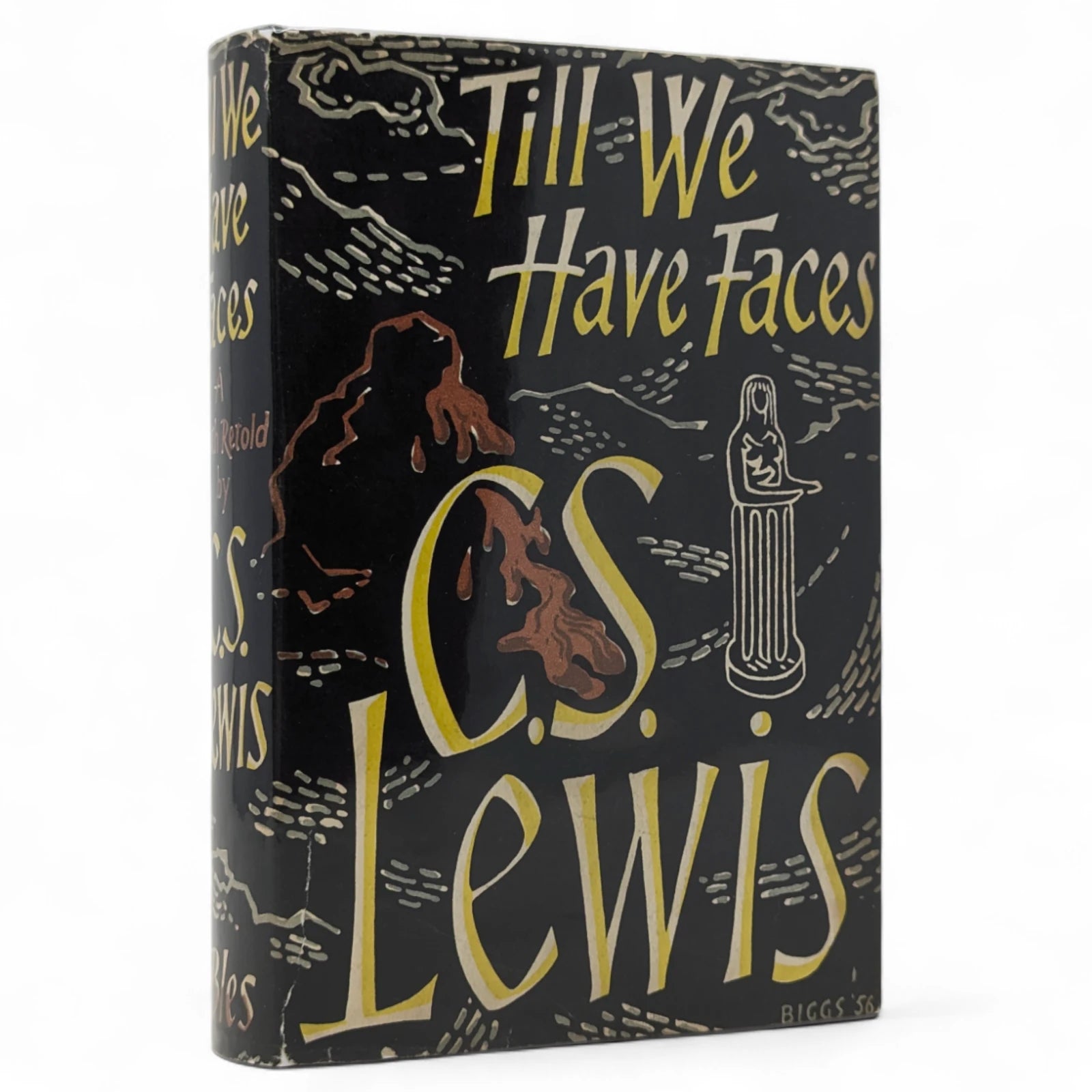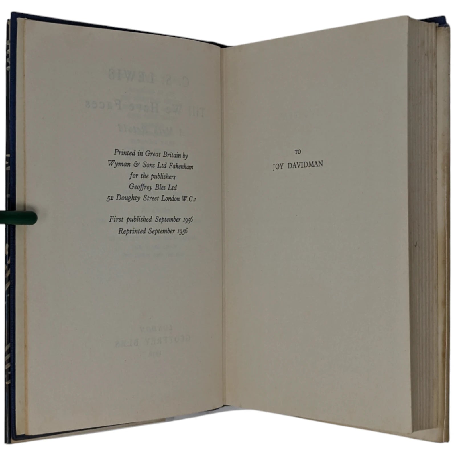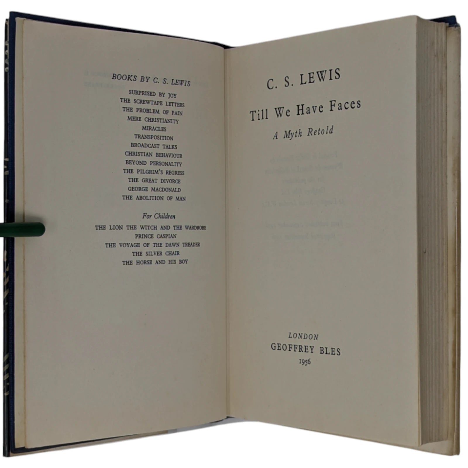 Till We Have Faces by C. S. Lewis. London: Geoffrey Bles, 1956. First edition, second impression. Publisher's original blue binding; with unclipped dust wrapper with 8/6 net sticker on top of the original price on the front flap. Sized 19 x 12.8 cm. Pp. 320.