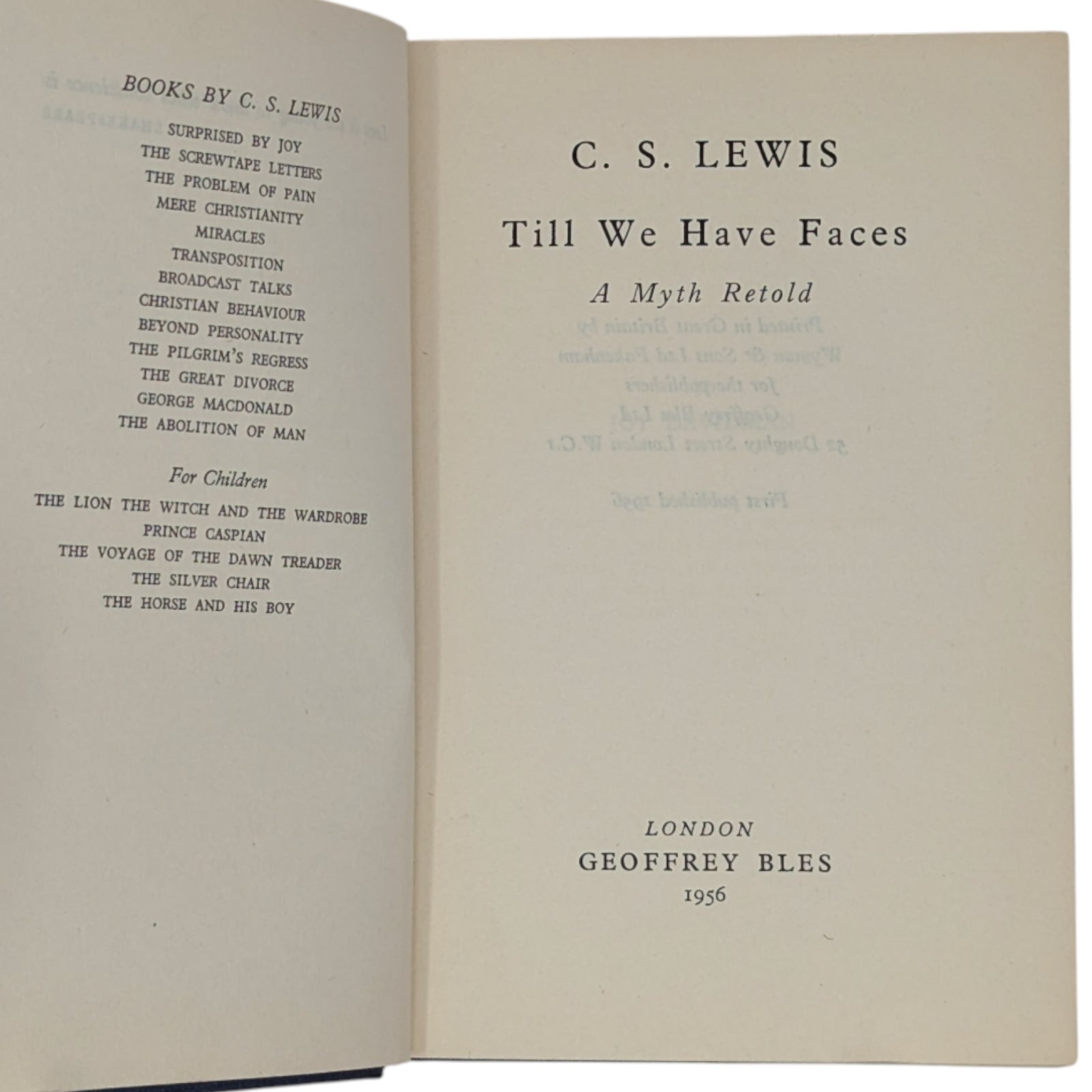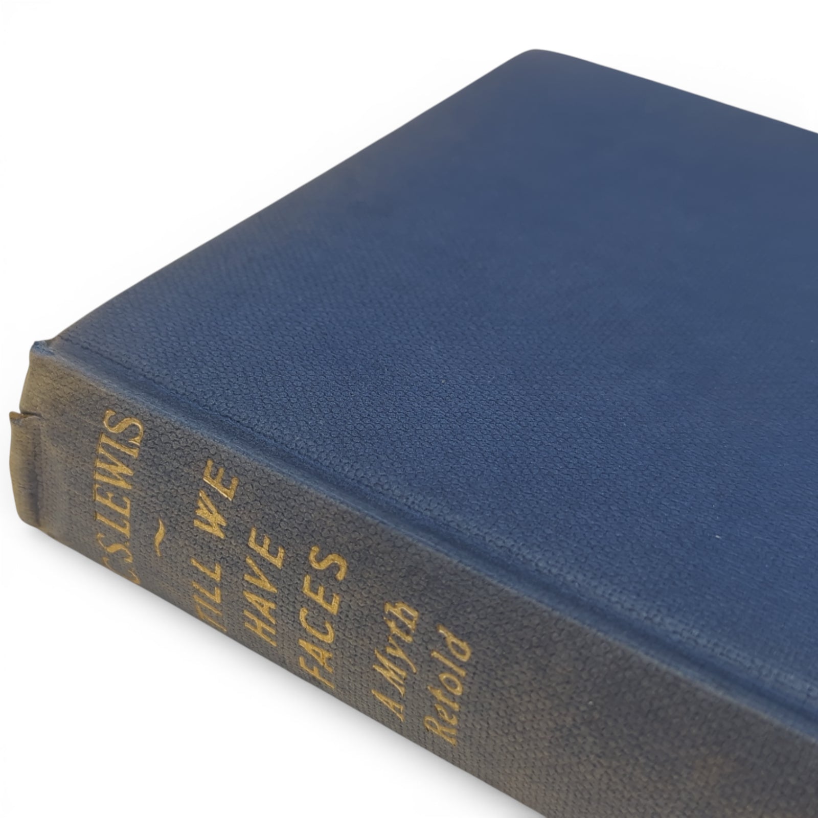 LEWIS, C. S. Till We Have Faces. London: Geoffrey Bles, 1956. First edition, first impression of Lewis' retelling of Cupid and Psyche, based on its telling in a chapter of The Golden Ass of Apuleius. Publisher's original blue textured paper over boards, gilt titles to spine; in the price-clipped dustwrapper. 19 x 12.8 cm, 320 pp.