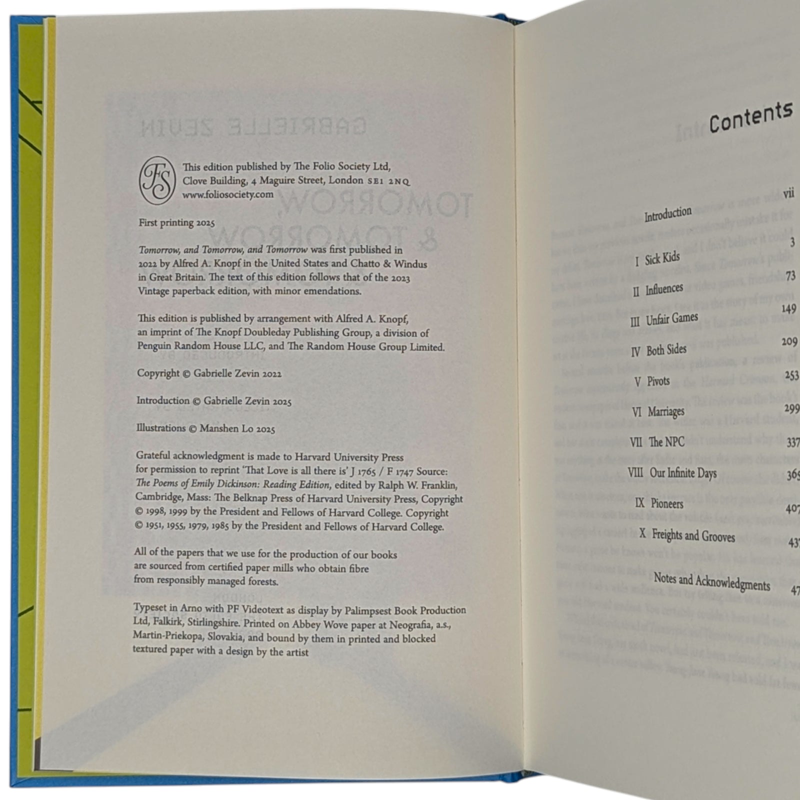 ZEVIN, Gabrielle. Tomorrow, and Tomorrow, and Tomorrow. London: The Folio Society, 2025. First printing thus. One of the 200 copies of this edition that have been signed by the author Gabrielle Zevin and illustrator Manshen Lo.