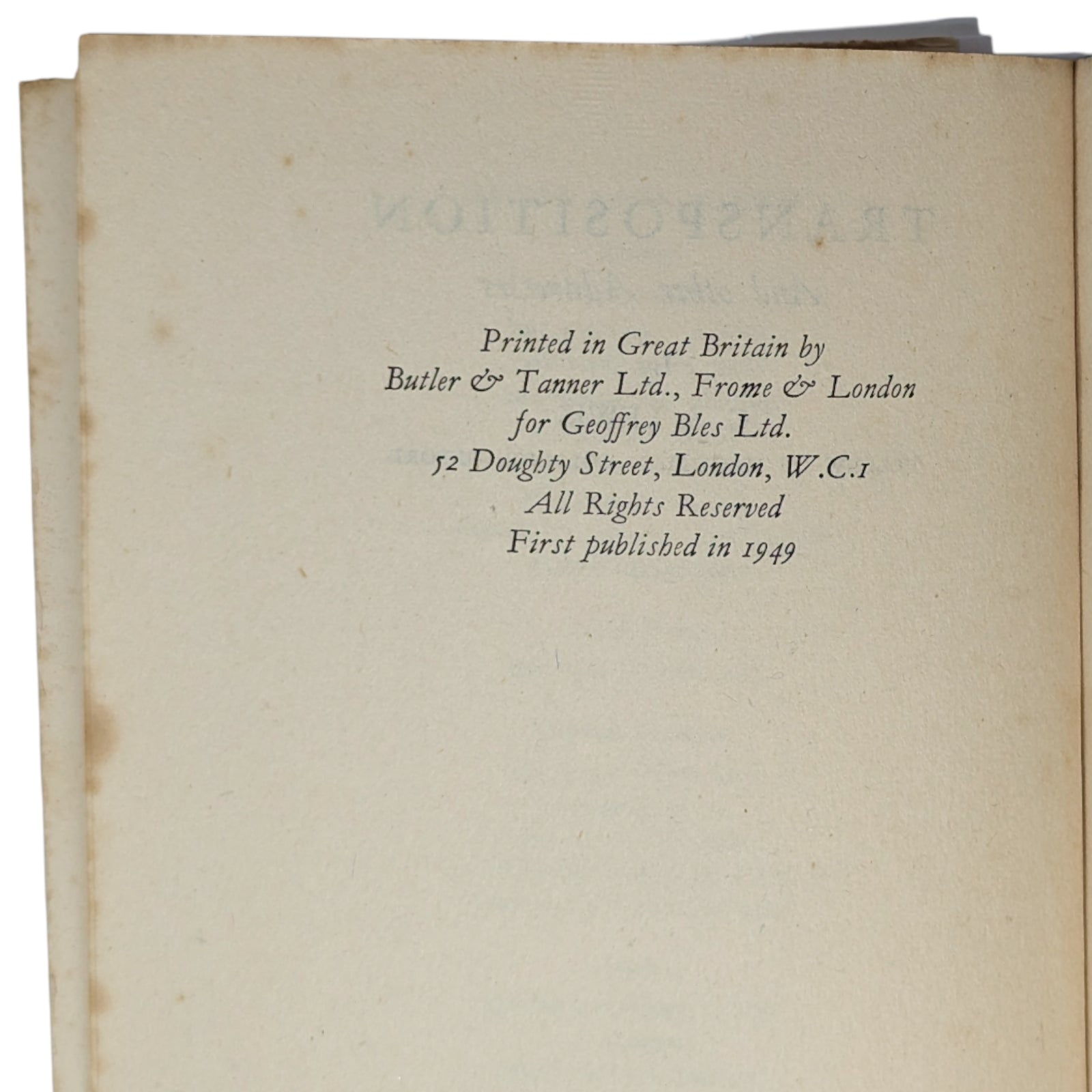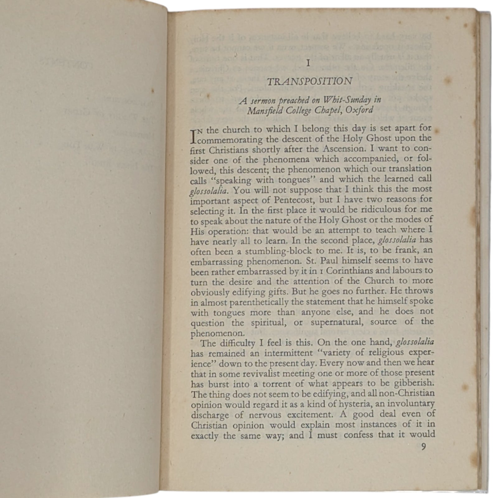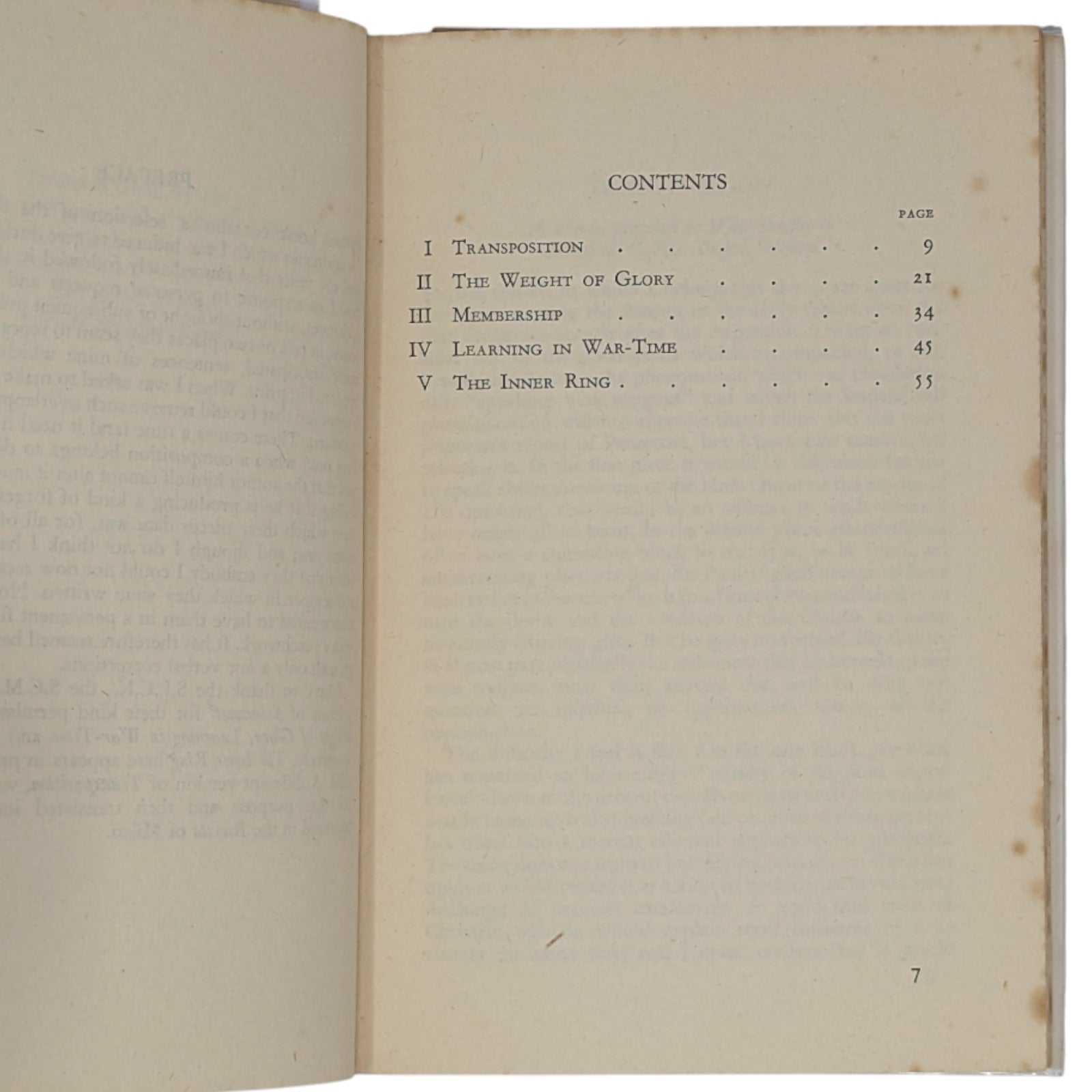 LEWIS, C. S. Transposition and Other Addresses. London: Geoffrey Bles, 1949. First edition, first printing of this compilation of addresses by Lewis that includes Transposition, Learning in War-Time, Membership, The Inner Ring, and The Weight of Glory, his famous sermon preached in the Church of St. Mary the Virgin, Oxford, and described by Walter Hooper and Roger Lancelyn Green as "perhaps the most sublime piece of prose to come from his [C.S. Lewis'] pen".