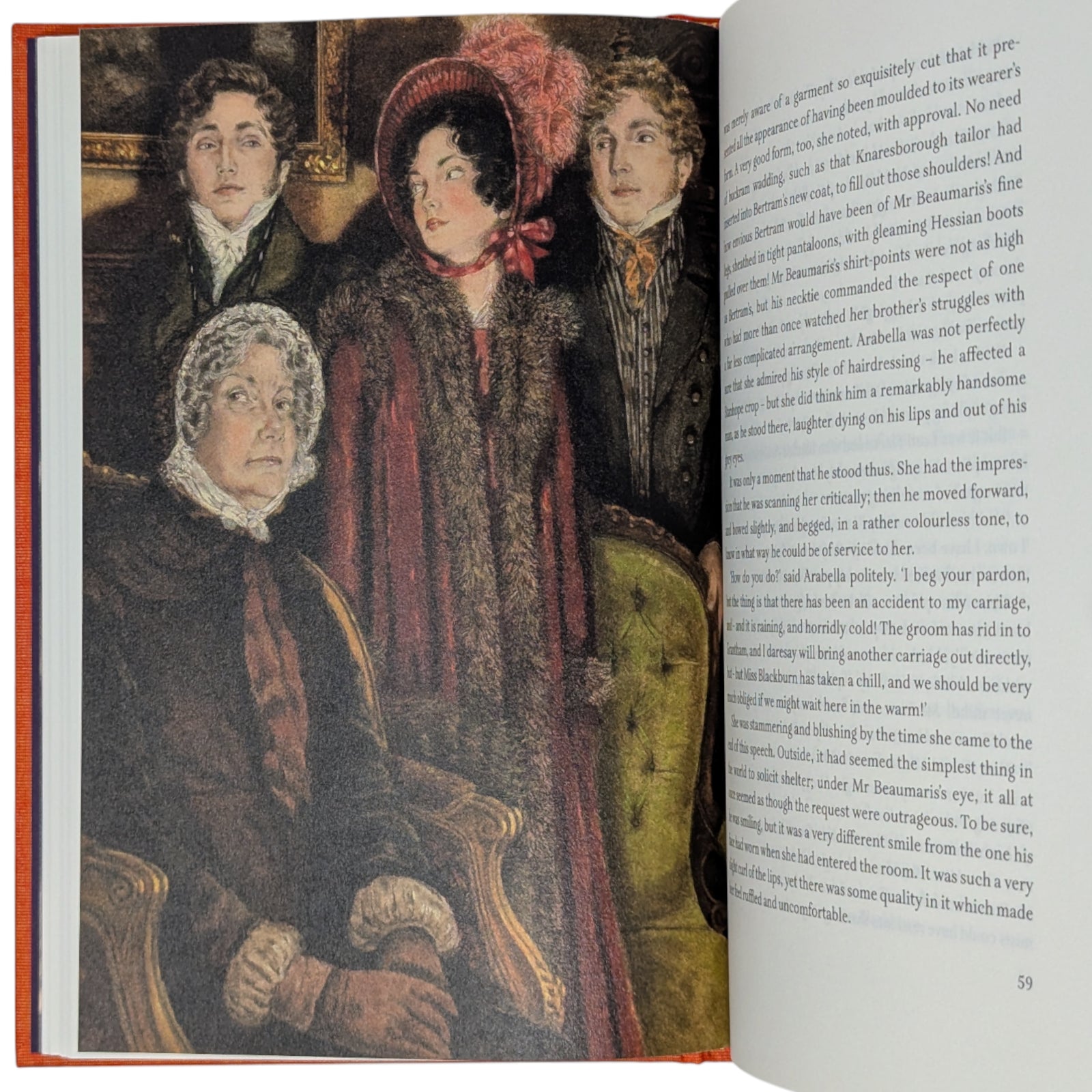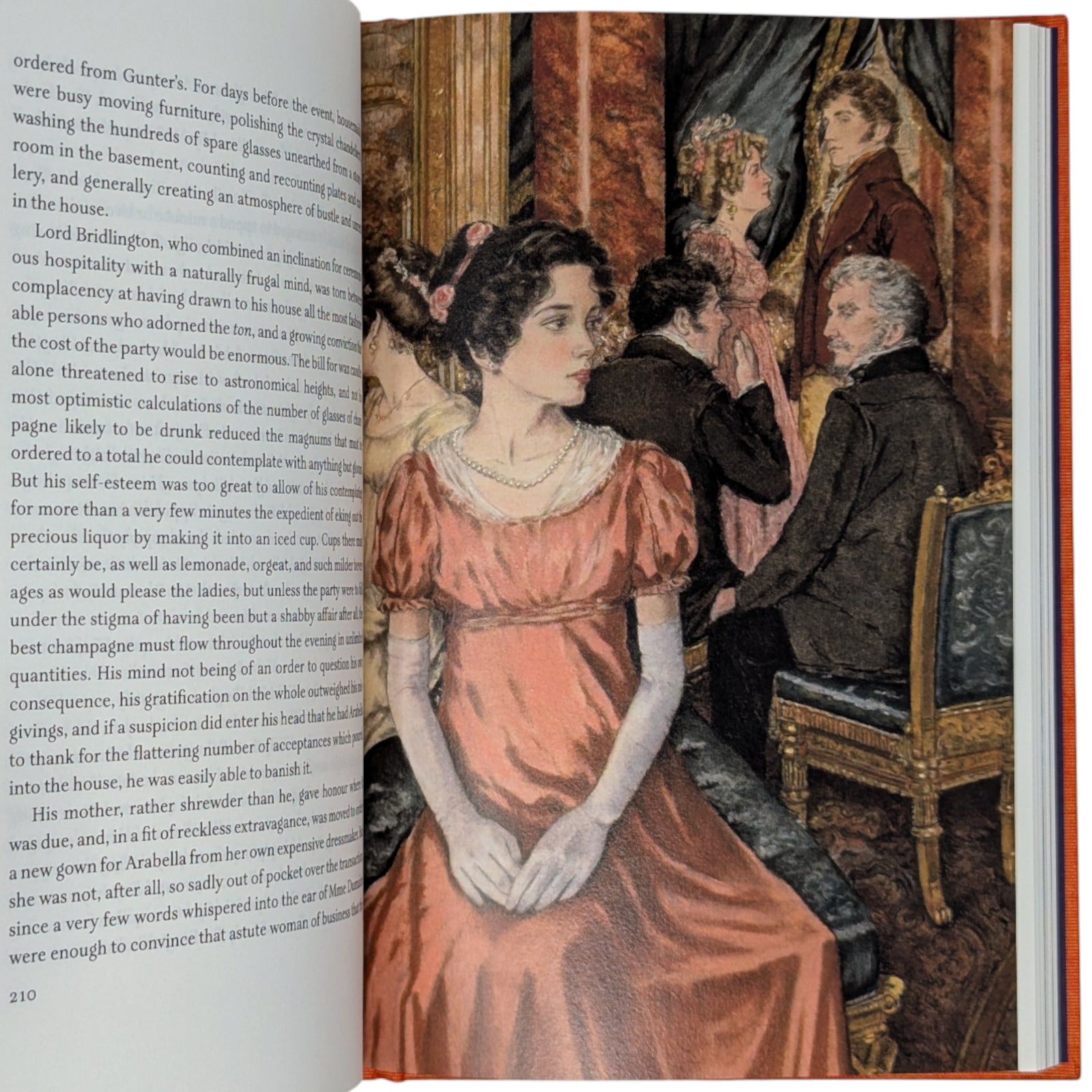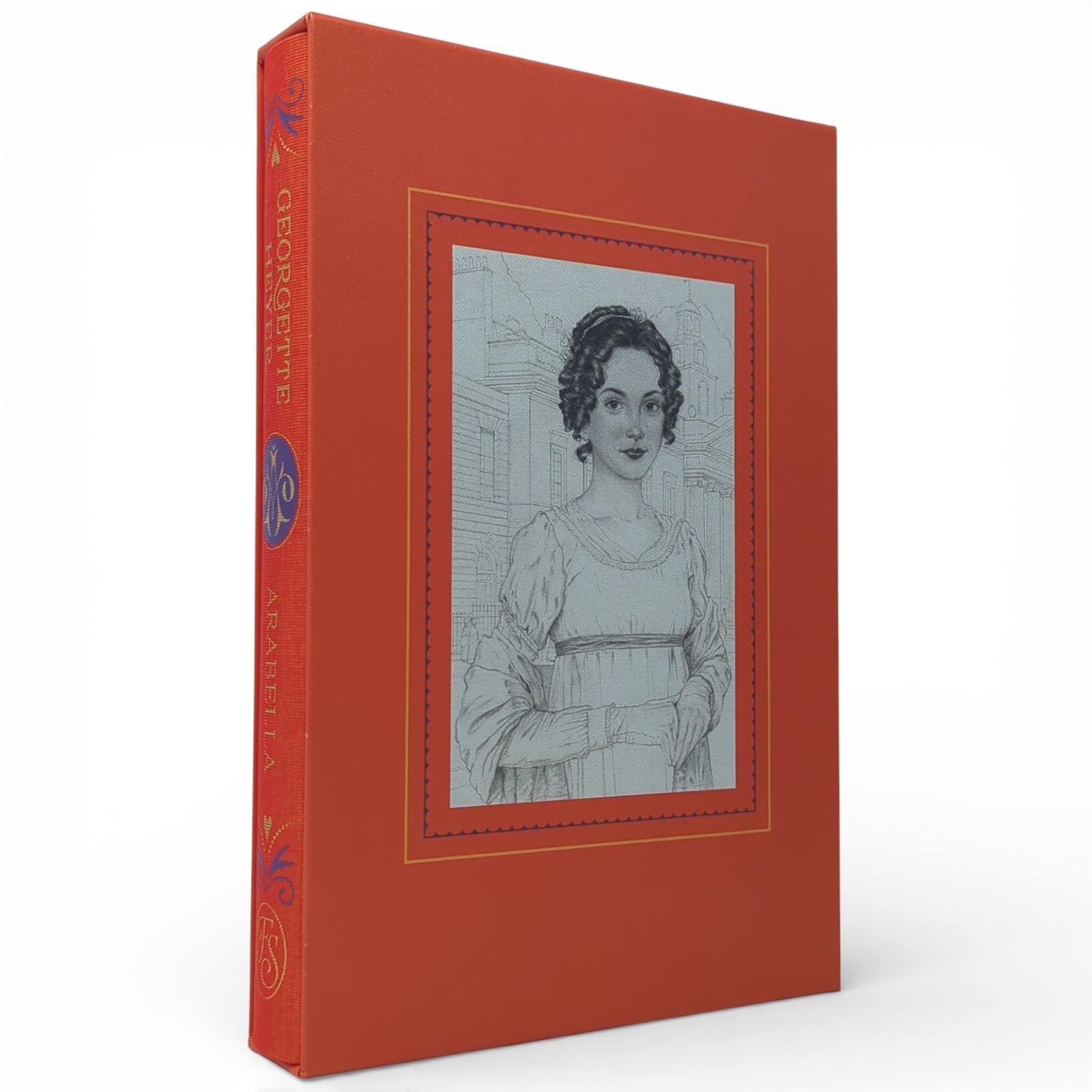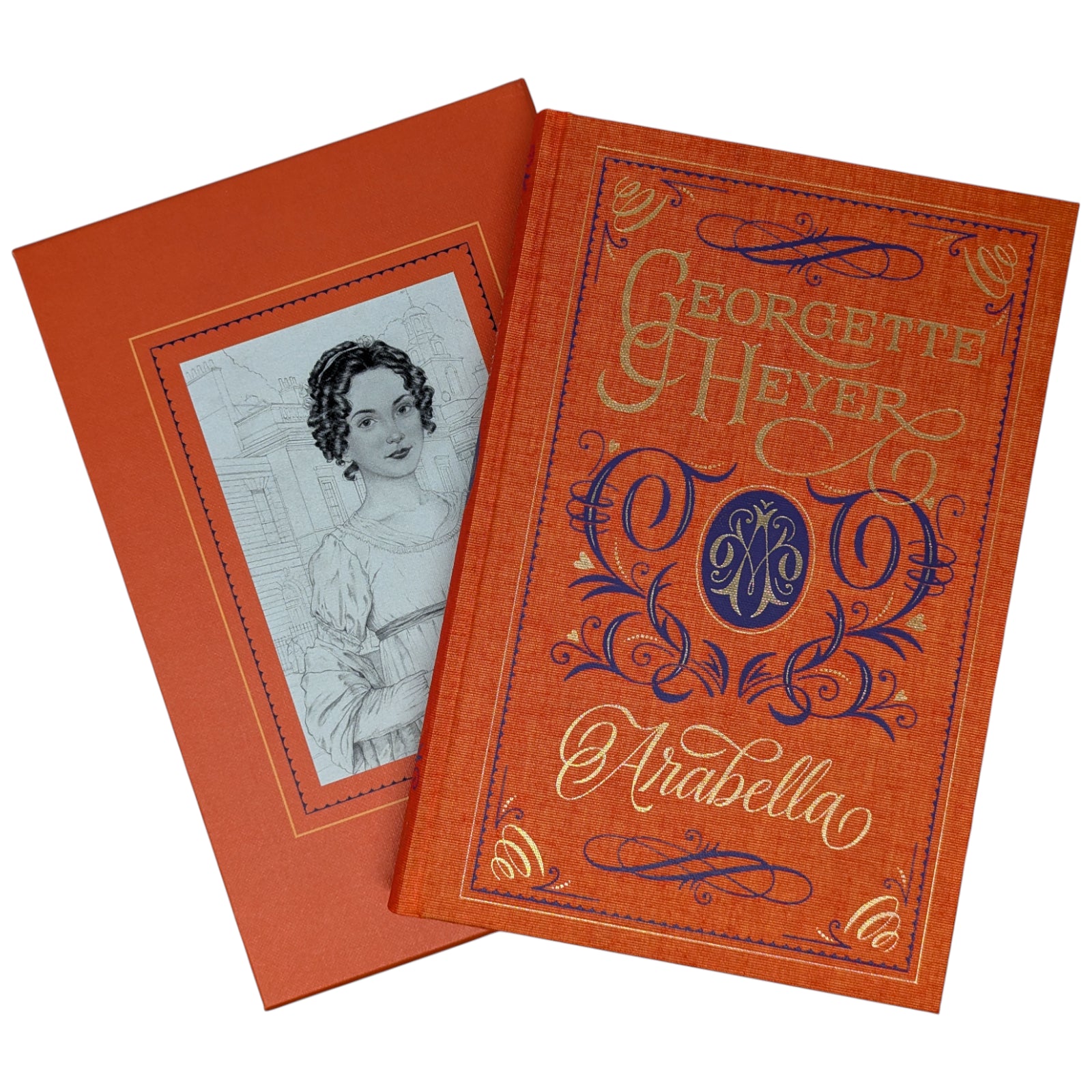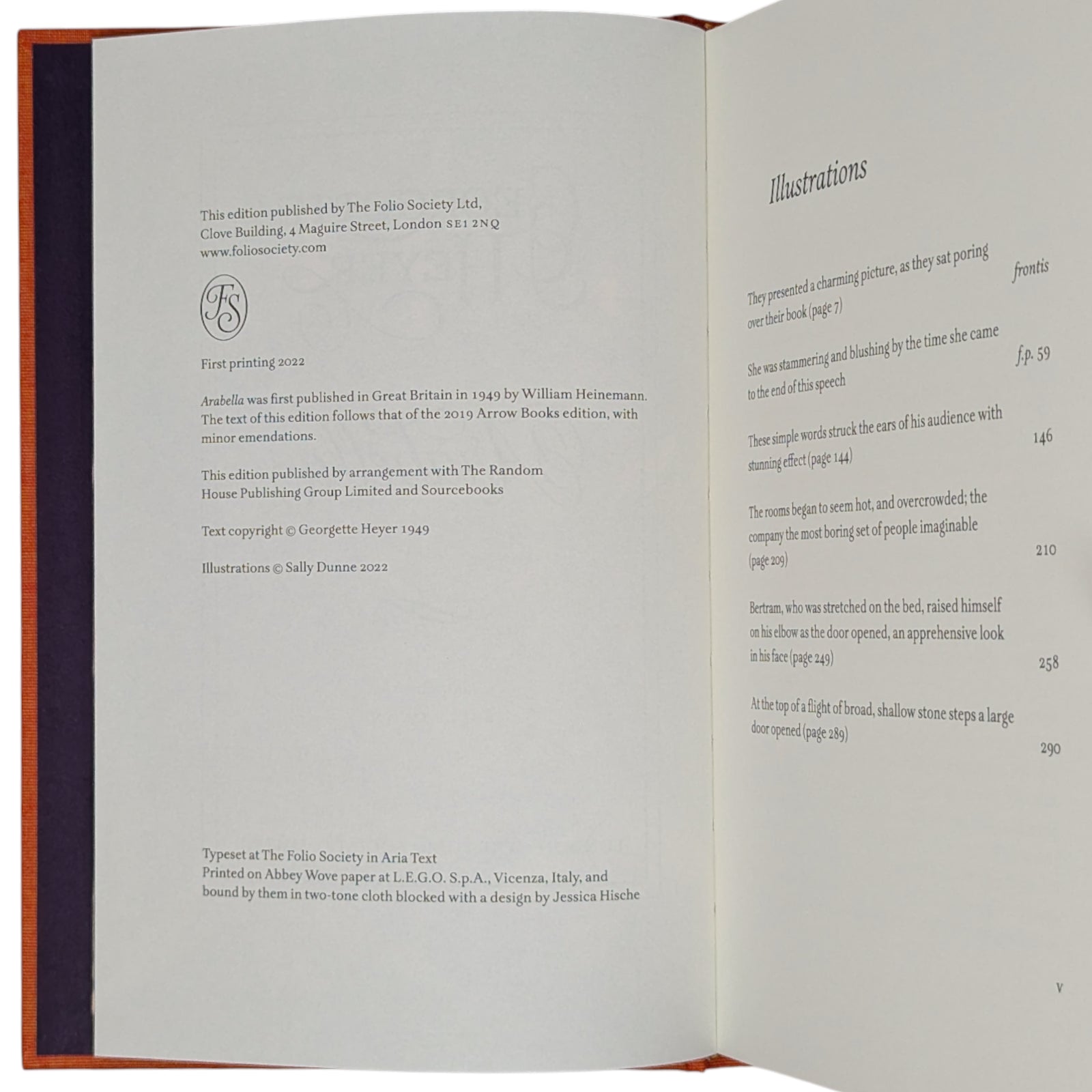 Georgette Heyer, Arabella. London: The Folio Society, 2022. First printing thus. Illustrations by Sally Dunne. 241 × 164 × 29 mm. Pp. [i–iv] v [vi], [1–2] 3–299 [300–306]: [6] leaves of colour plates (facing pp. [iii], 59, 146, 210, 258 and 290). Type: Aria Text. Printed and bound by L.E.G.O. in orange cloth blocked with a design by Jessica Hische; purple endleaves. Orange slip case printed with portrait of Miss Arabella Tallant by Dunne.
