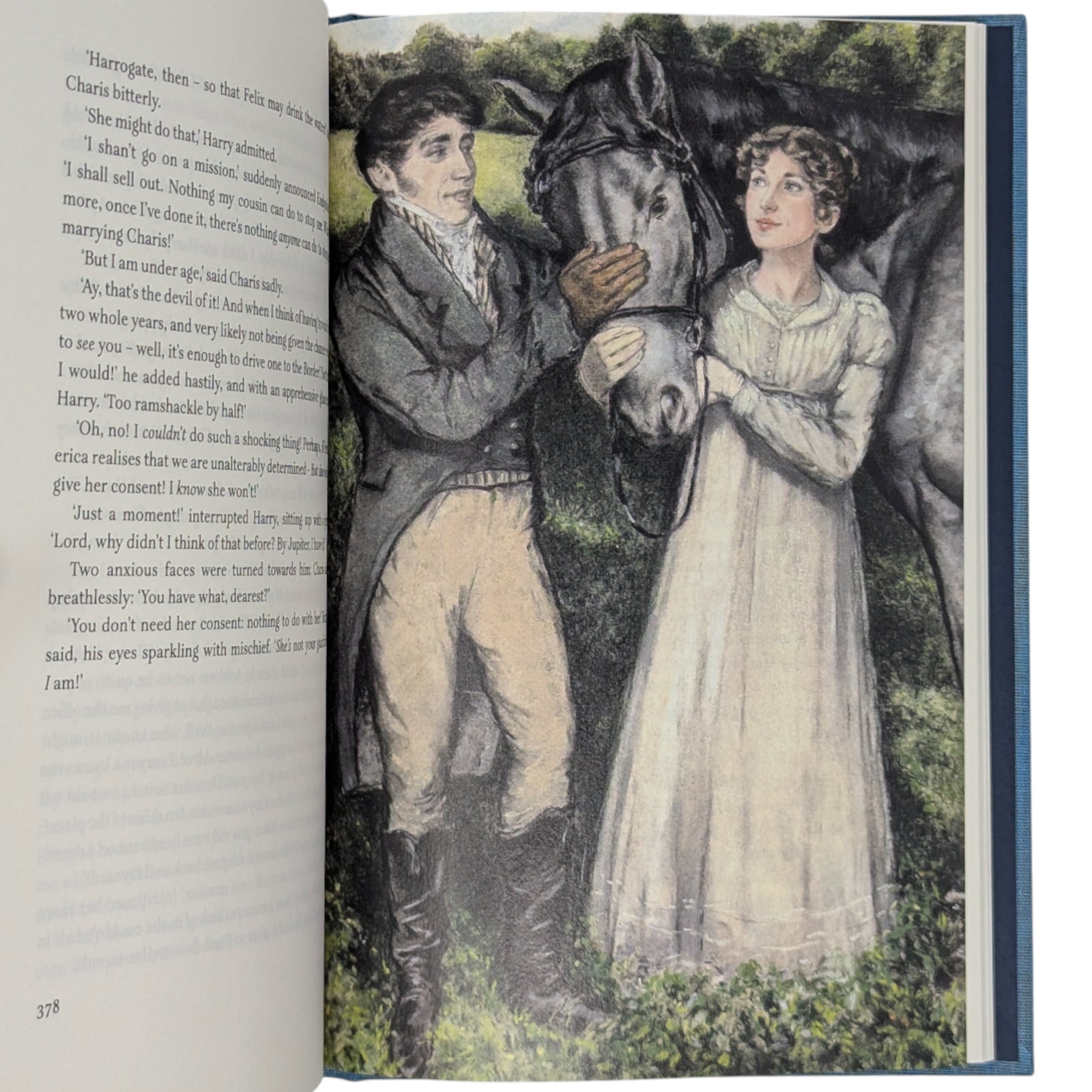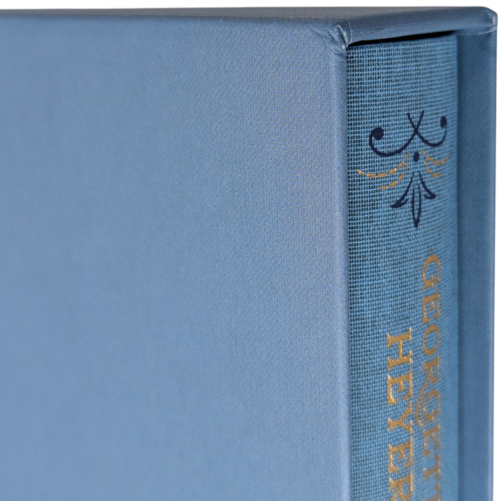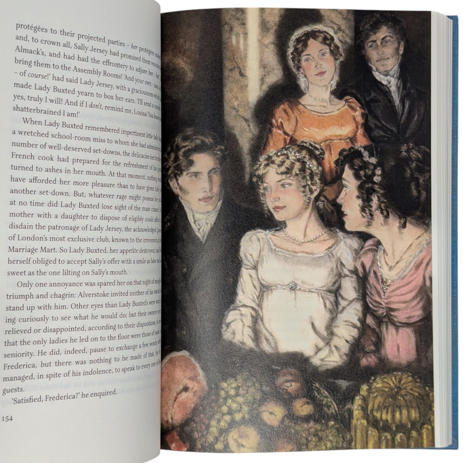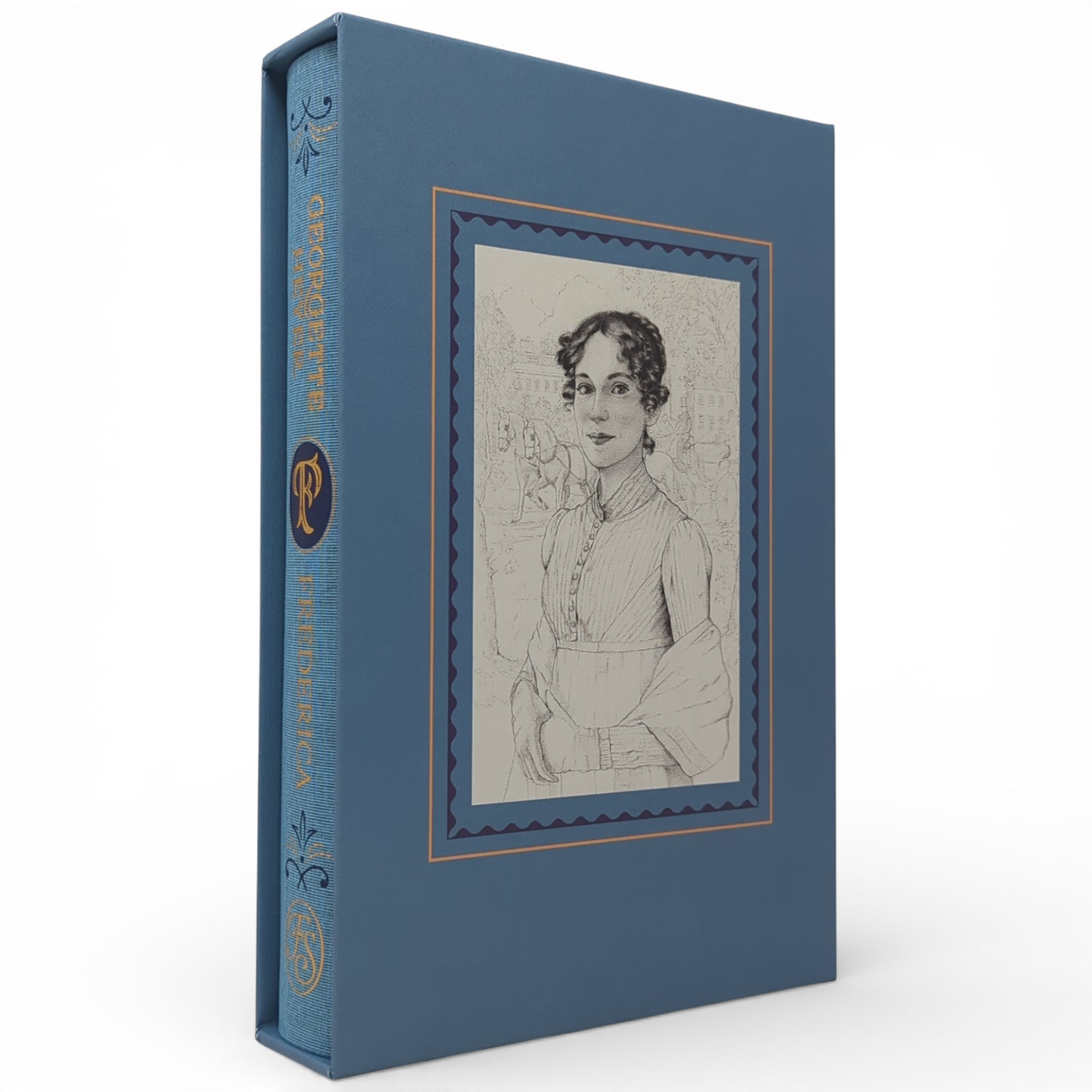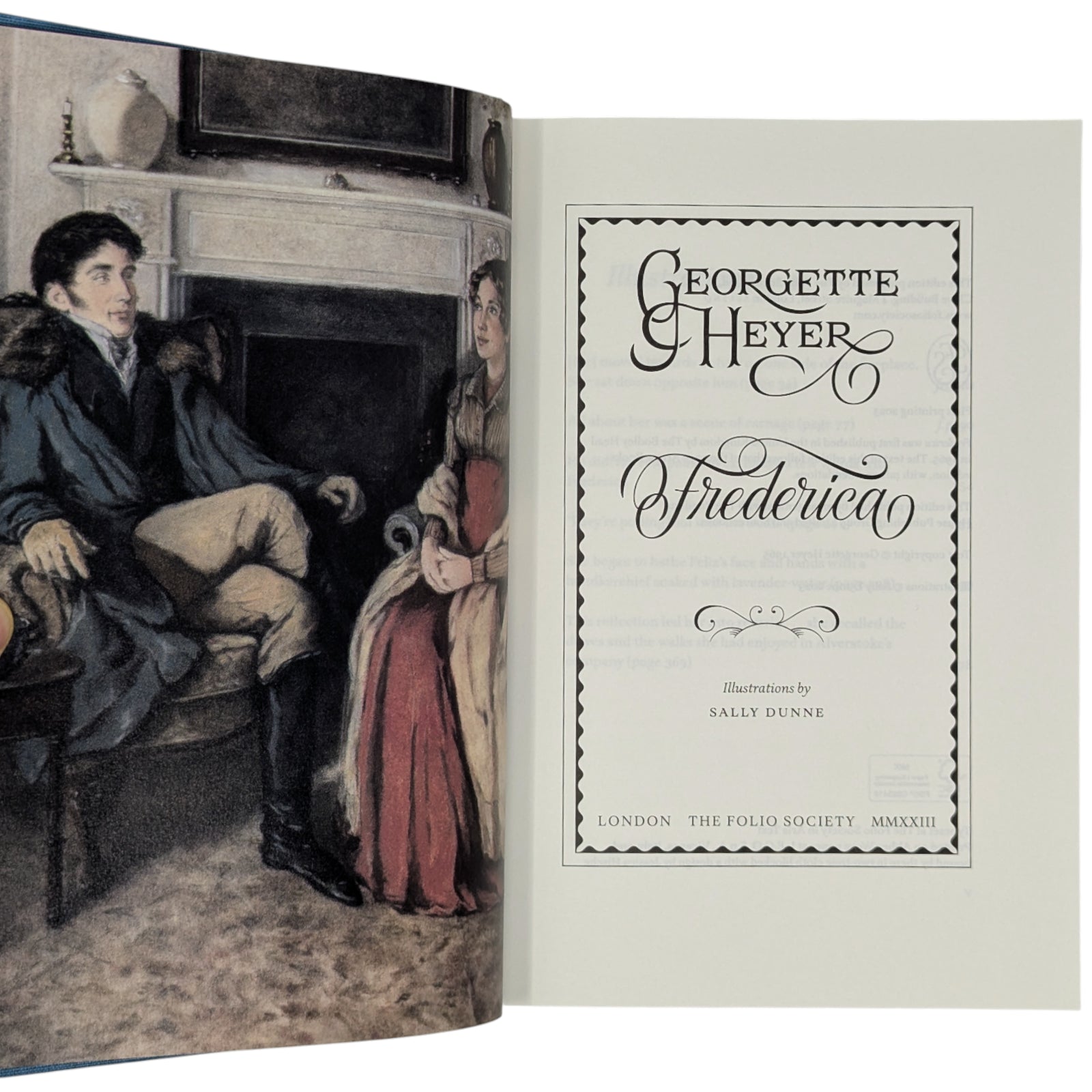 Georgette Heyer, Frederica. London: The Folio Society, 2023. First printing thus. Illustrations by Sally Dunne. 240 × 163 × 35 mm. Pp. [i–iv] v [vi], [1–2] 3–406 [407–410]: [6] leaves of colour plates (facing pp. [iii], 90, 154, 282, 330 and 378). Type: Aria Text. Printed and bound by L.E.G.O. in pale blue cloth blocked with a design by Jessica Hische; dark blue endleaves. Pale blue slip case printed with portrait of Miss Frederica Merriville by Dunne.