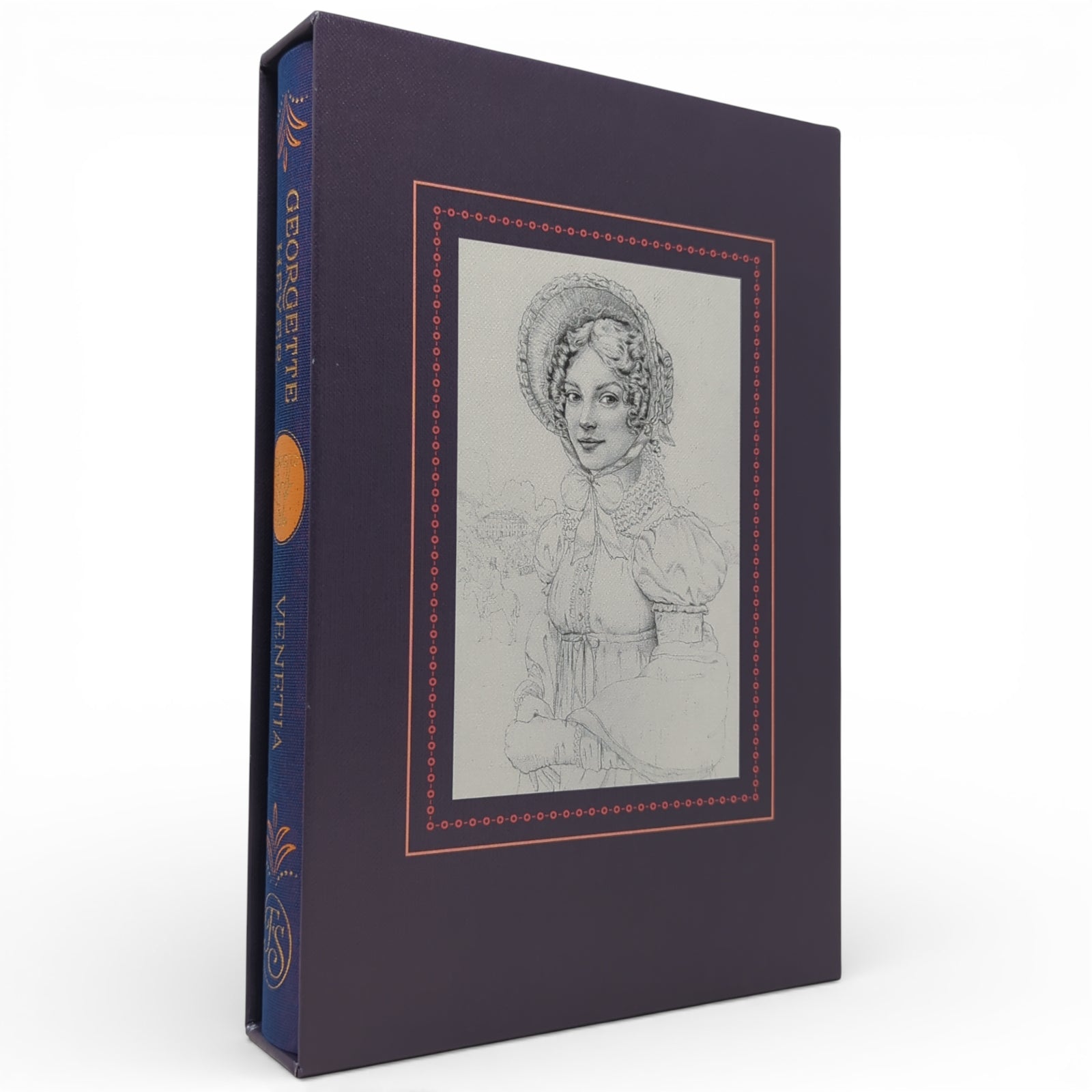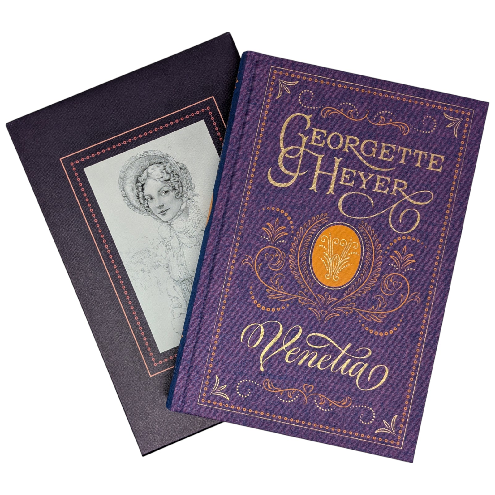 Georgette Heyer, Venetia. London: The Folio Society, 2021. First printing thus. Introduced by Stephen Fry, illustrations by Sally Dunne. 240 × 164 × 32 mm. Pp. [i–iv] v–xvi, [1–2] 3–359 [360]: [6] leaves of colour plates (facing pp. [iii], 81, 128, 169, 264 and 344). Type: Aria Text. Printed and bound by L.E.G.O. in purple-blue cloth blocked with a design by Jessica Hische; orange endleaves. Dark purple slip case printed with portrait of Miss Venetia Lanyon by Dunne.